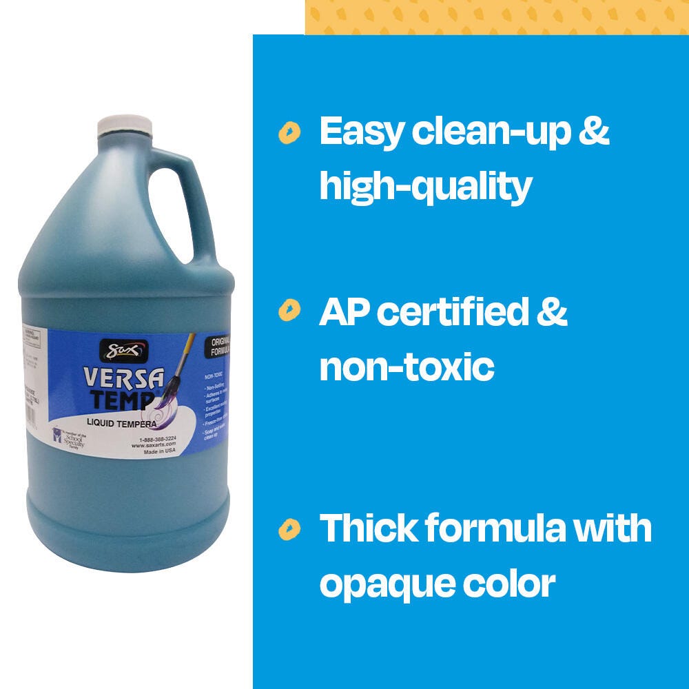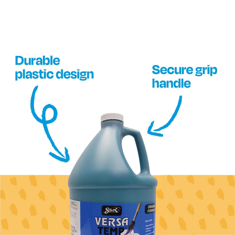 Sax Versatemp heavy-bodied tempera paint in turquoise produces bold, vibrant results. Foster creativity with a paint that resists cracking and chipping. The large gallon bottle is easy to pour and store, and is perfect for sharing in the classroom. Complete art projects, posters, and signs that stand out with one shade or craft new hues by mixing. The heavy formula is easy to apply and mix.