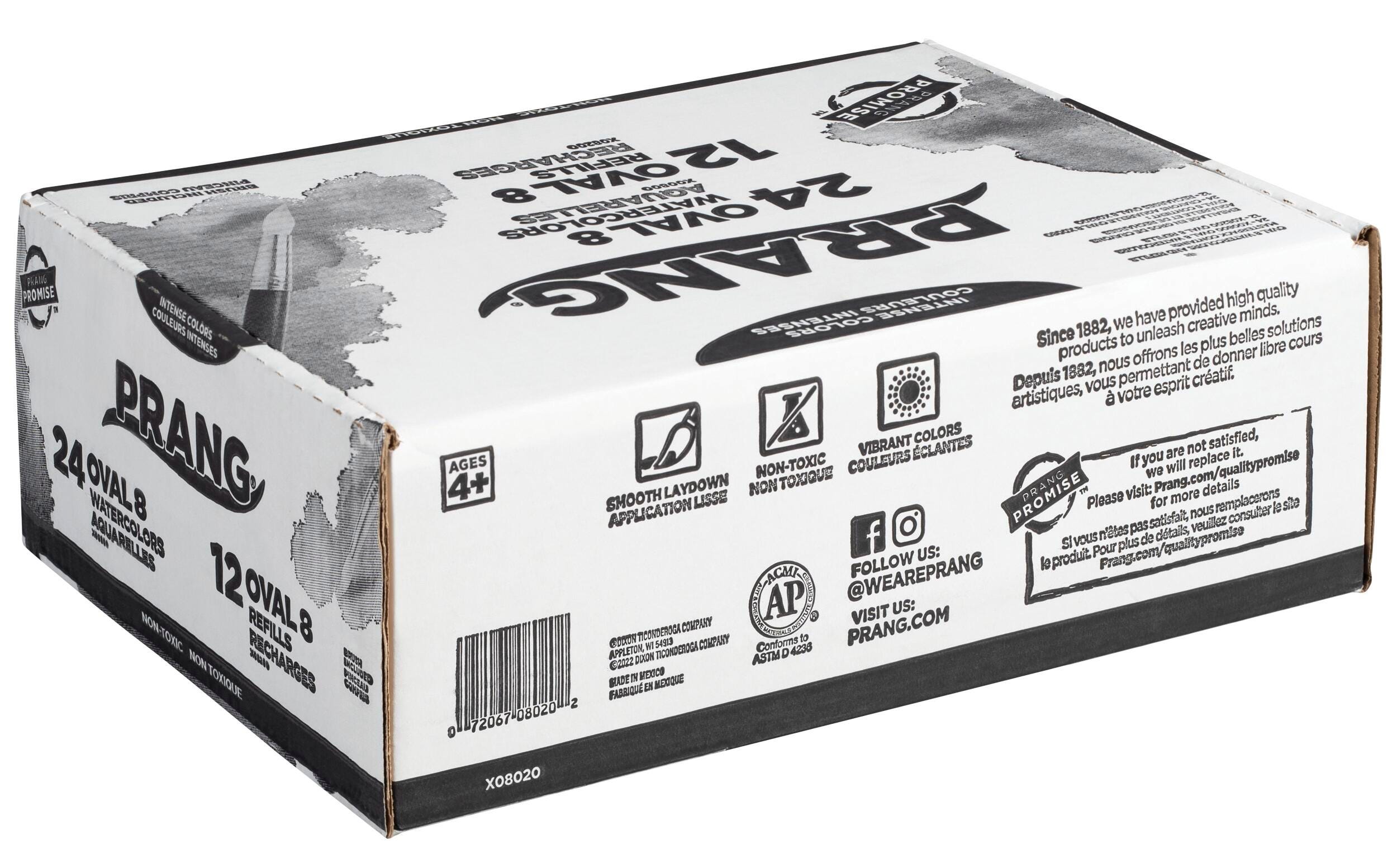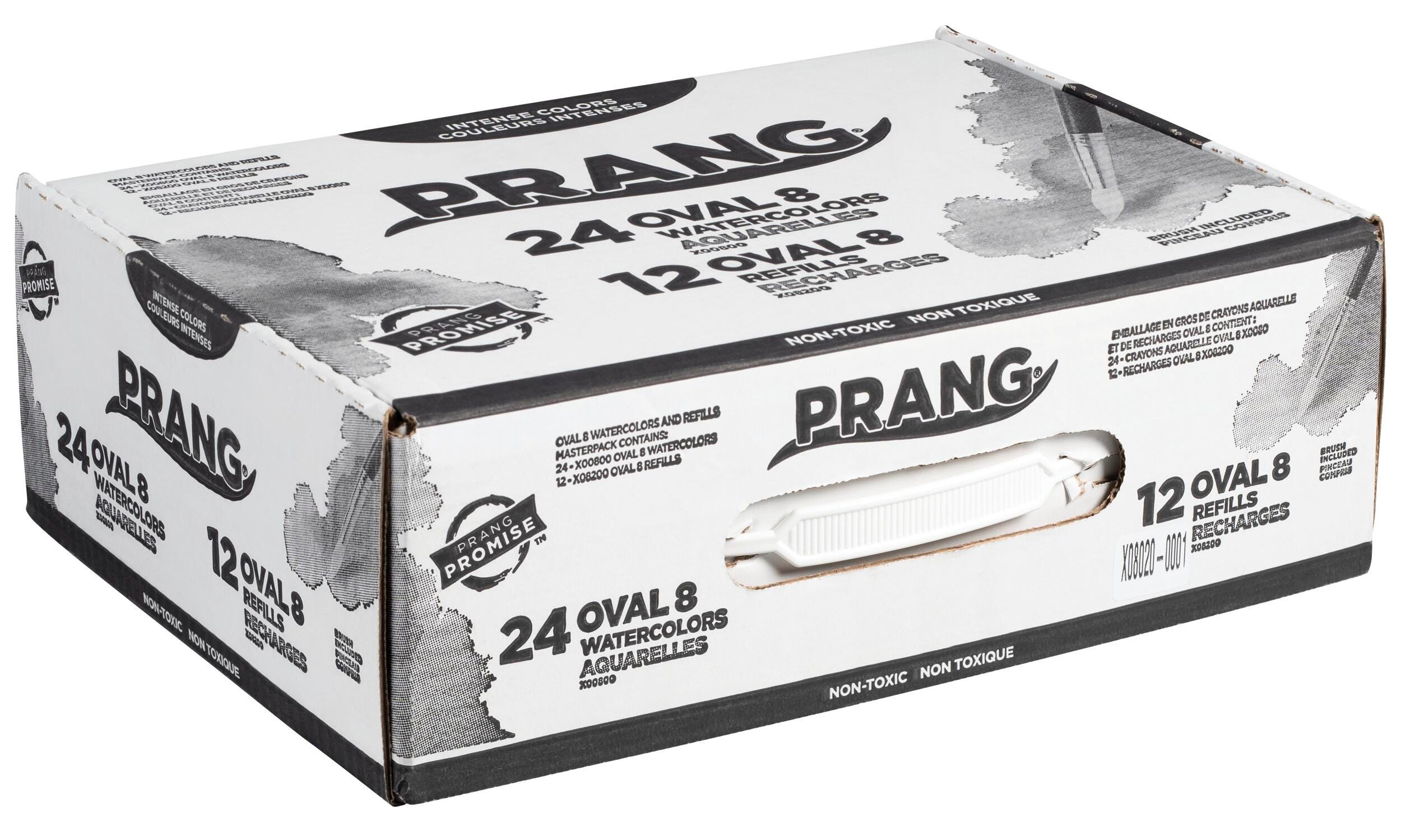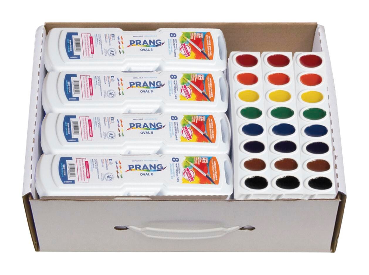 Prang Semi-Moist Watercolor Masterpack features quality classroom Non-Toxic watercolors with choice pigments and specially formulated binders to offer superior transparency and vividness. Masterpack includes twenty-four 8-color oval pan sets with brush, and twelve 8-color oval pan refill trays.