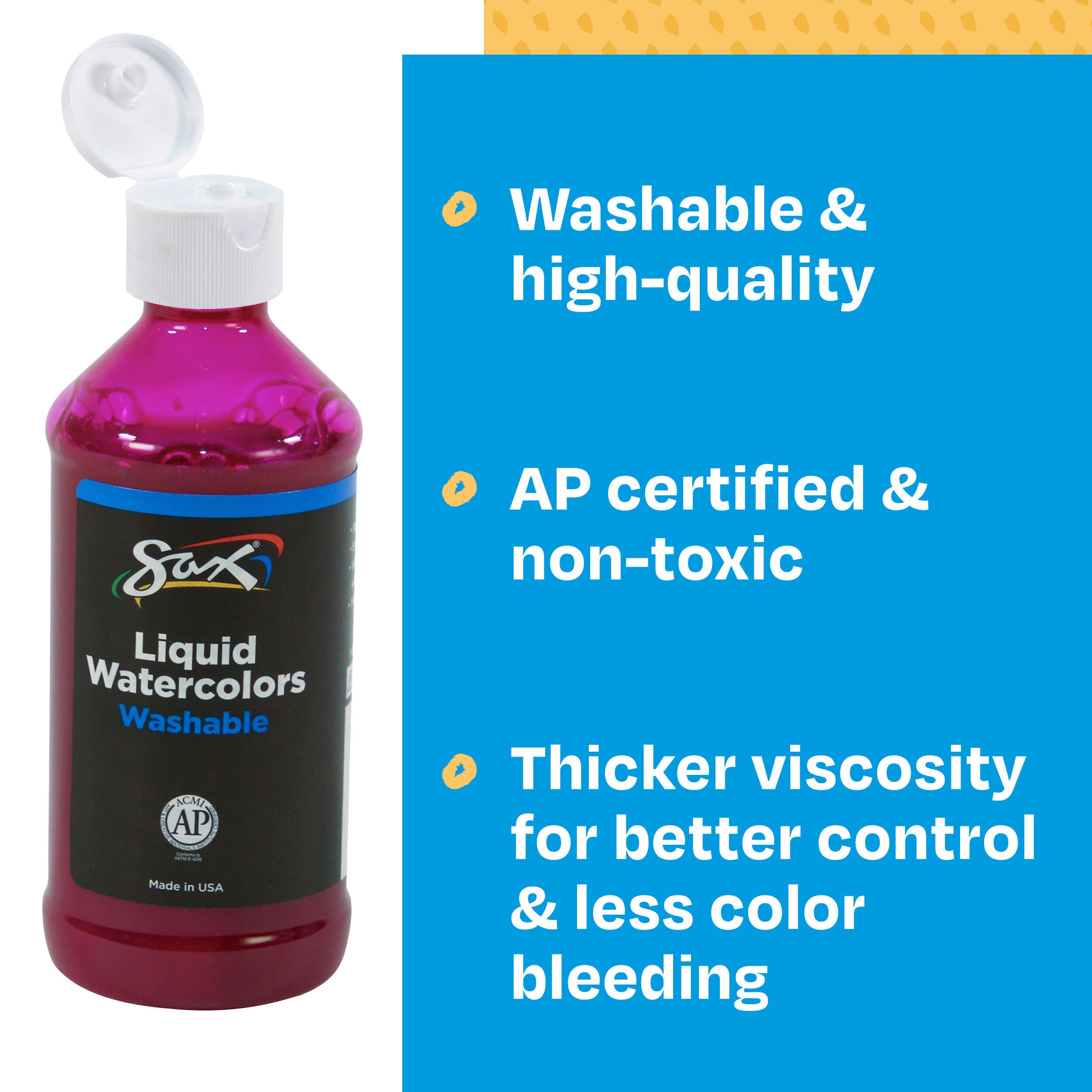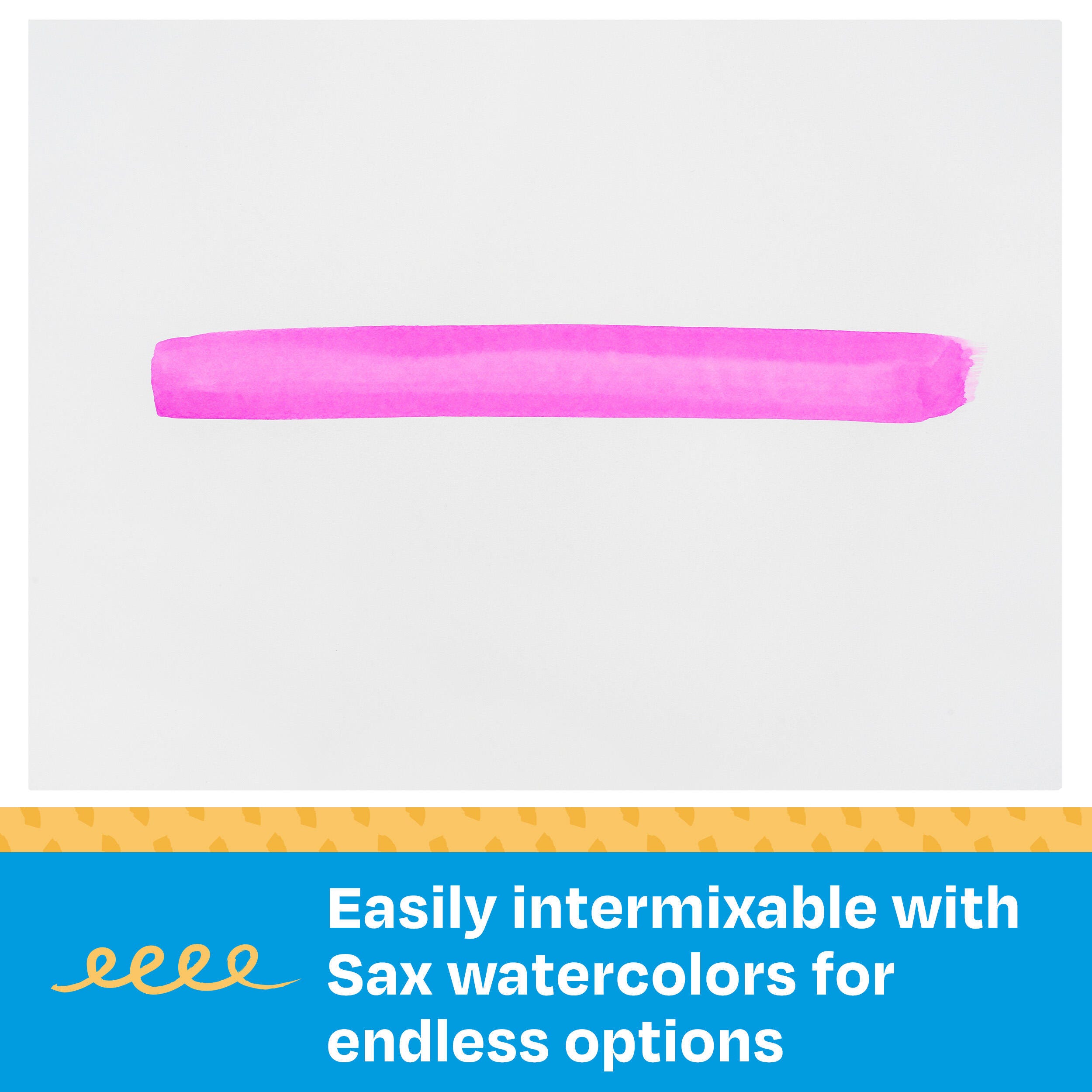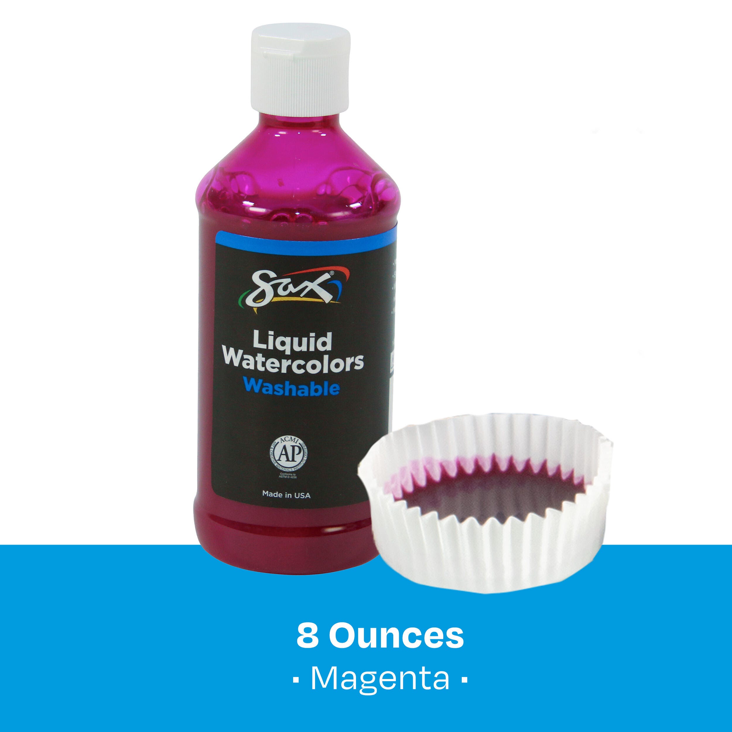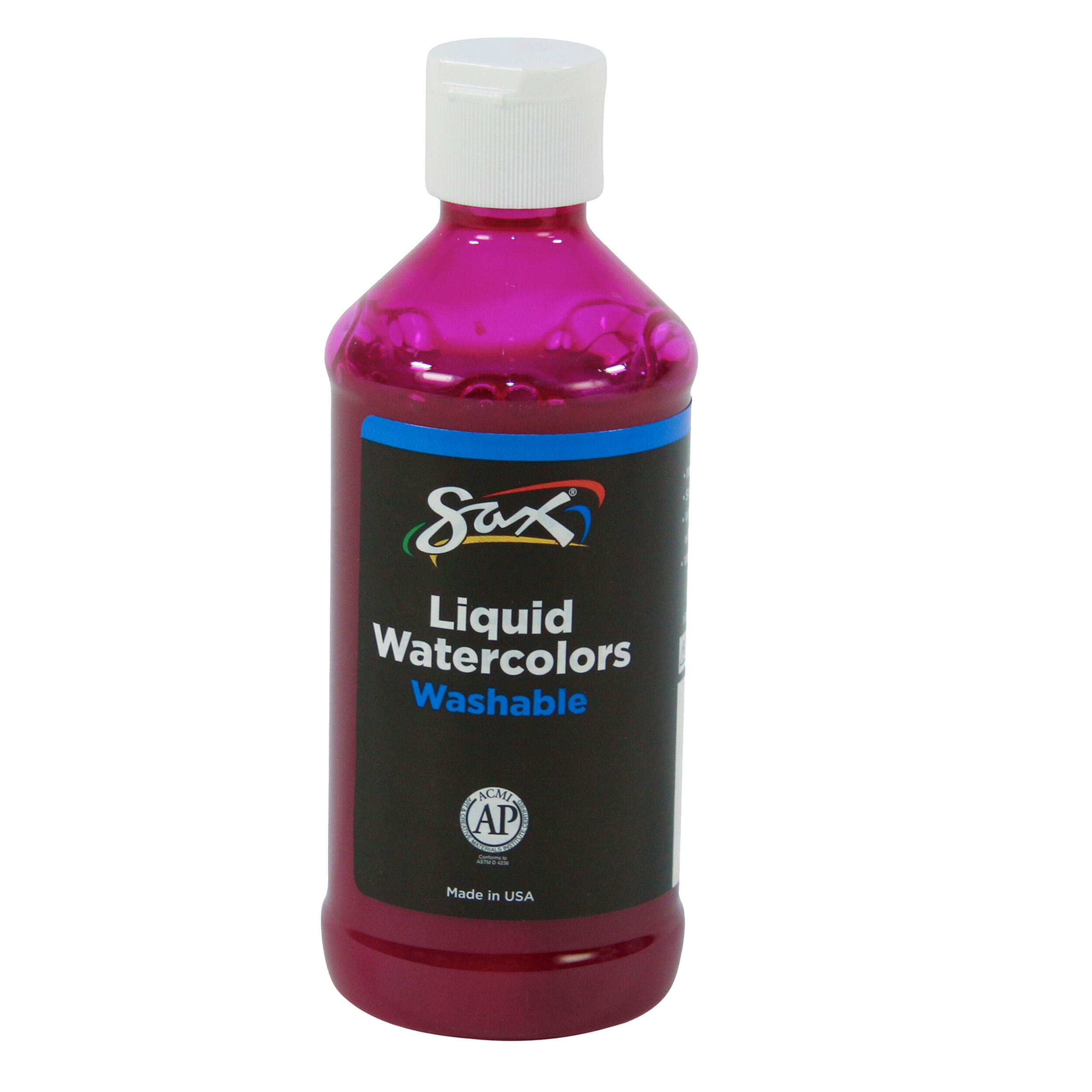 This Sax liquid washable watercolor paint comes in a magenta color. The liquid medium provides rich hues straight from the bottle with beautiful results when dried on paper or other materials. A thicker viscosity allows for better control and easier dispensing, along with increased surface tension for less color bleeding. Use this paint at full strength (undiluted) or dilute as needed with water for soft, muted colors. The formula is washable, easy to clean from hands with soap and water, and rinses out of most fabrics. Enjoy easy pouring with a plastic jug that can be poured from the big-mouth opening or dispensed slowly from the snap-down pour spout. Shake well before use.