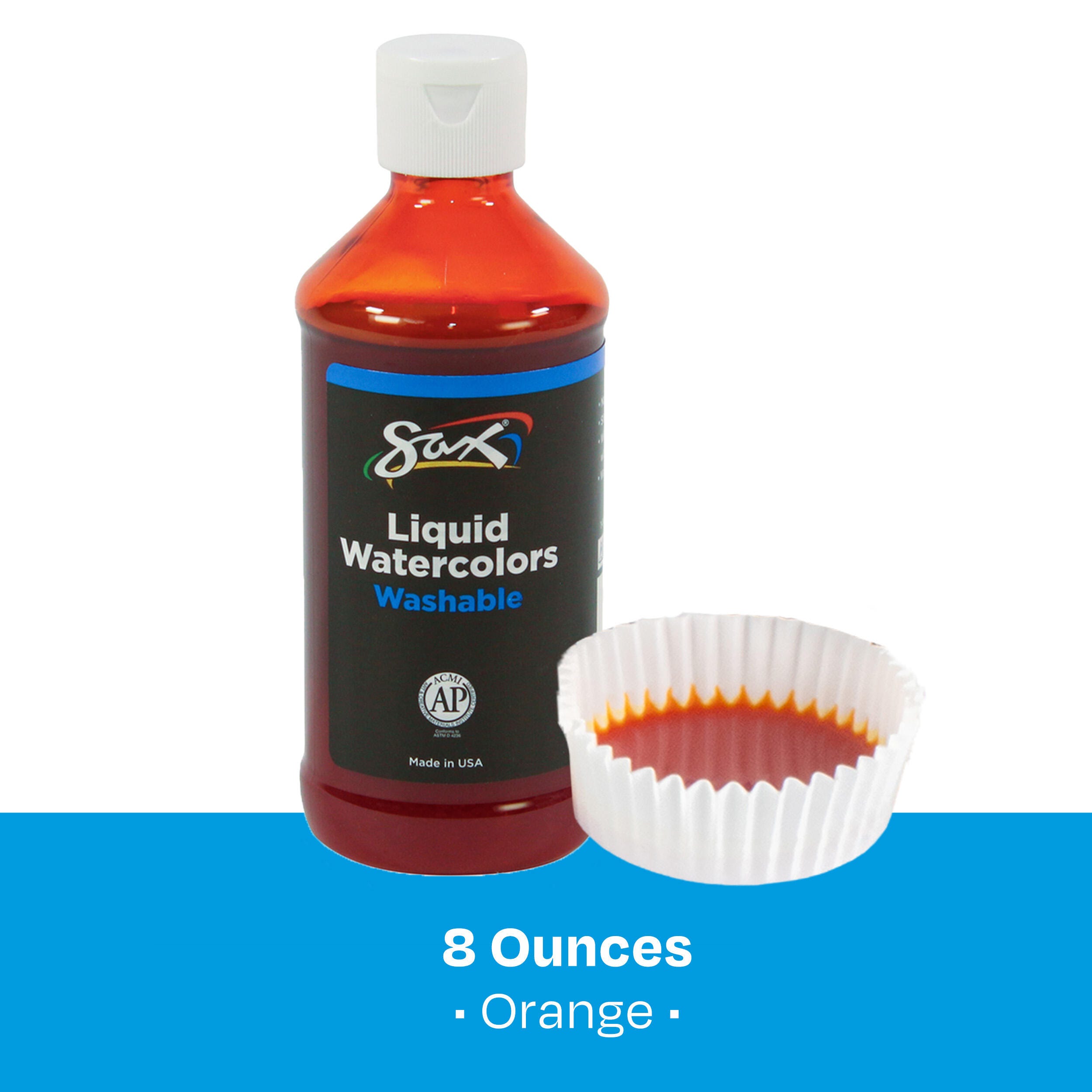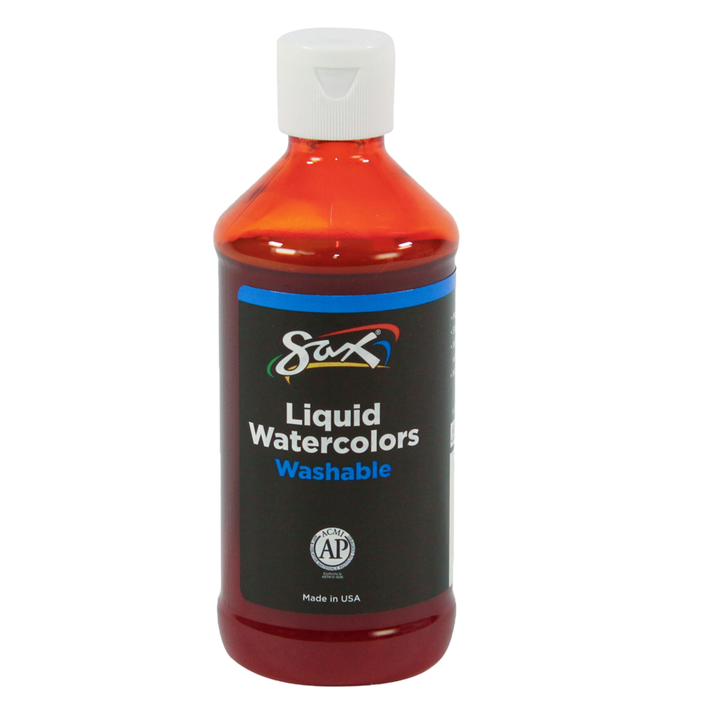 This Sax liquid washable watercolor paint comes in an orange color. The liquid medium provides rich hues straight from the bottle with beautiful results when dried on paper or other materials. A thicker viscosity allows for better control and easier dispensing, along with increased surface tension for less color bleeding. Use this paint at full strength (undiluted) or dilute as needed with water for soft, muted colors. The formula is washable, easy to clean from hands with soap and water, and rinses out of most fabrics. Enjoy easy pouring with a plastic jug that can be poured from the big-mouth opening or dispensed slowly from the snap-down pour spout. Shake well before use.