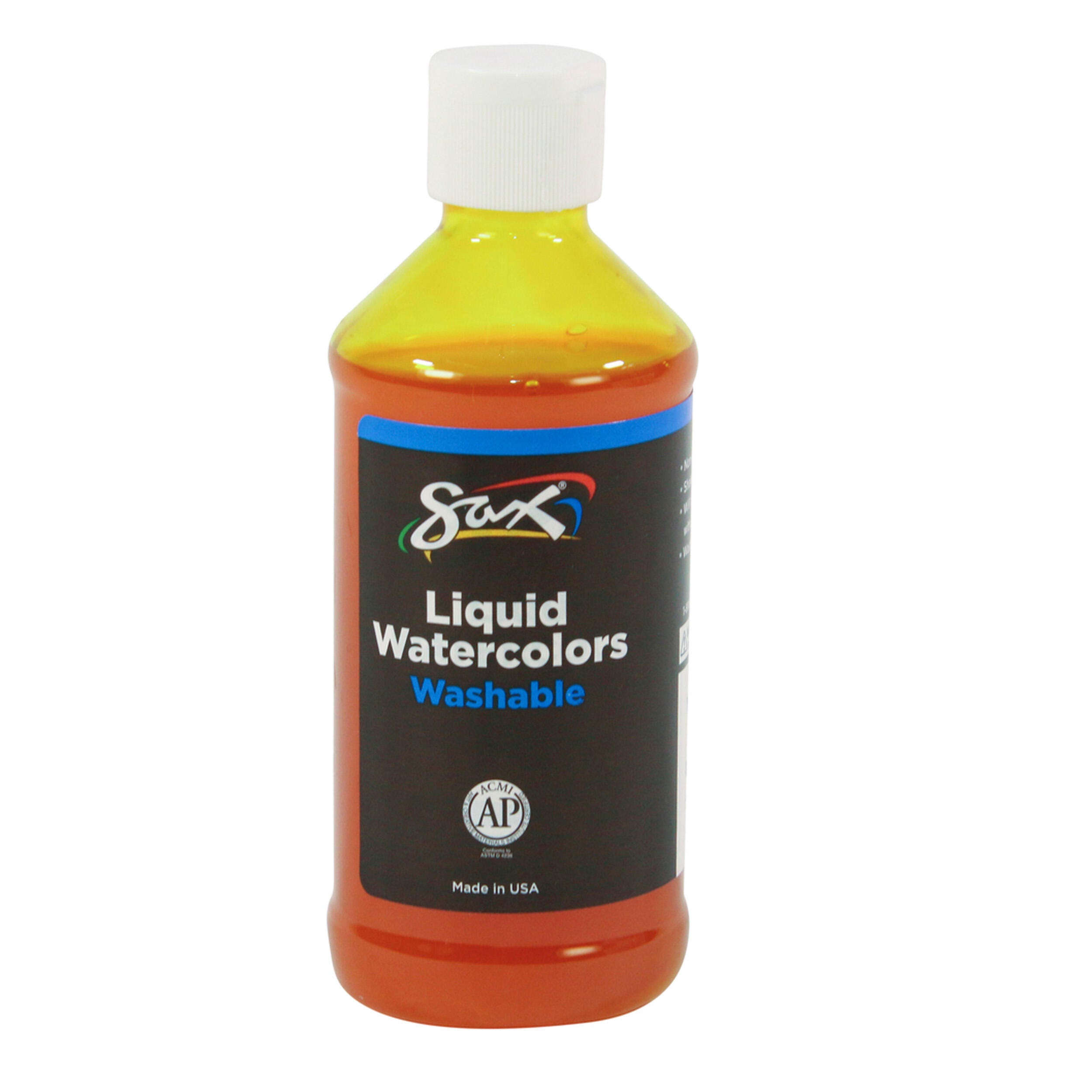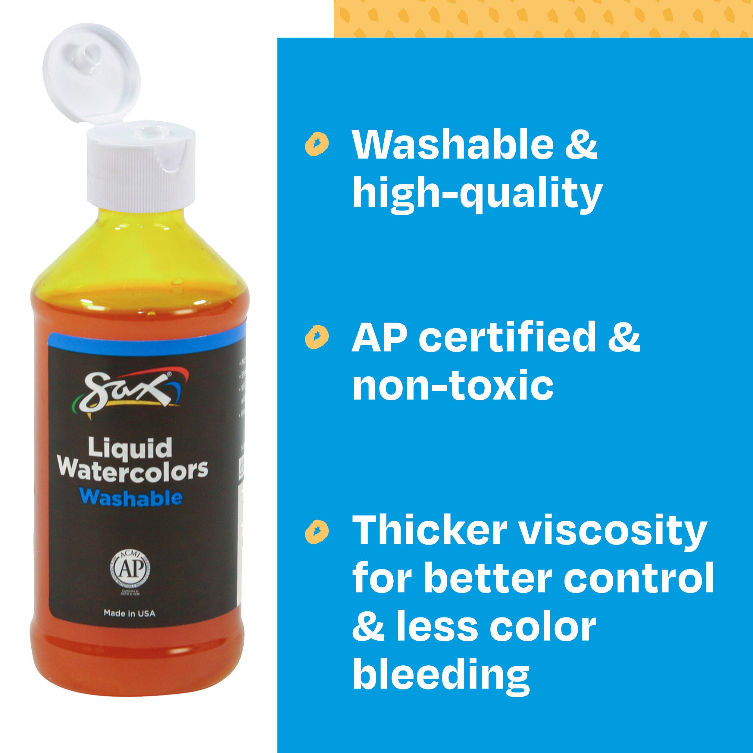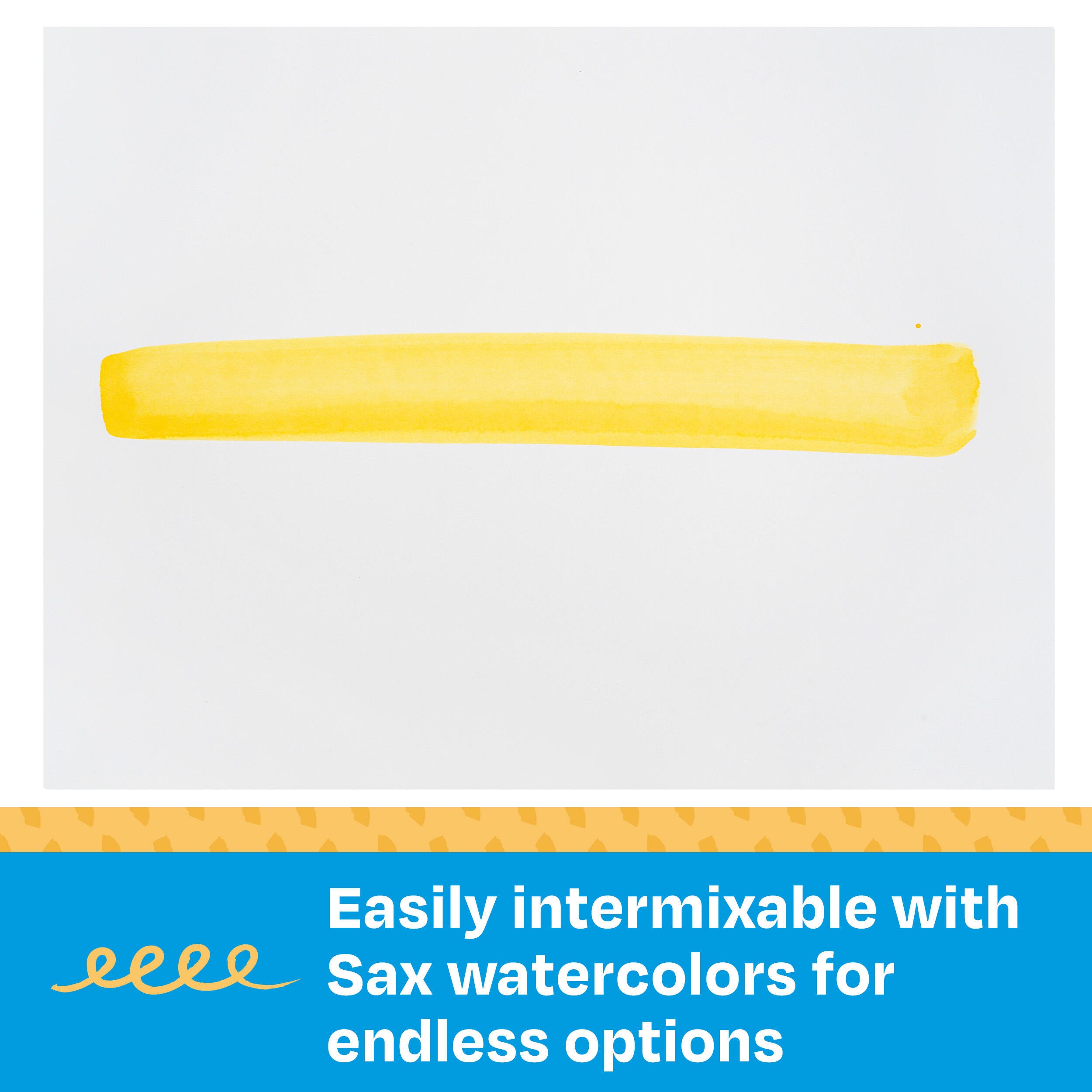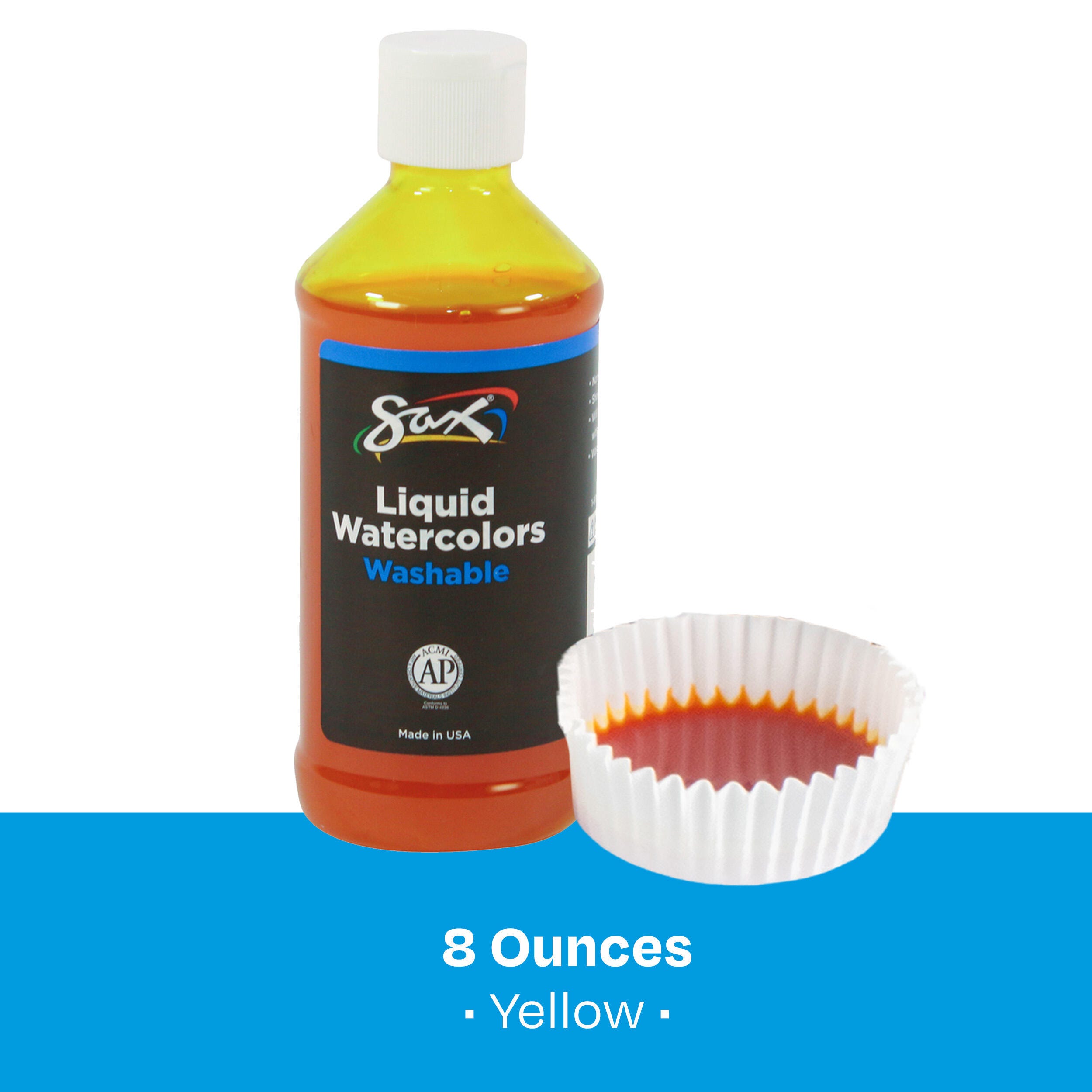This Sax liquid washable watercolor paint comes in a yellow color. The liquid medium provides rich hues straight from the bottle with beautiful results when dried on paper or other materials. A thicker viscosity allows for better control and easier dispensing, along with increased surface tension for less color bleeding. Use this paint at full strength (undiluted) or dilute as needed with water for soft, muted colors. The formula is washable, easy to clean from hands with soap and water, and rinses out of most fabrics. Enjoy easy pouring with a plastic jug that can be poured from the big-mouth opening or dispensed slowly from the snap-down pour spout. Shake well before use.