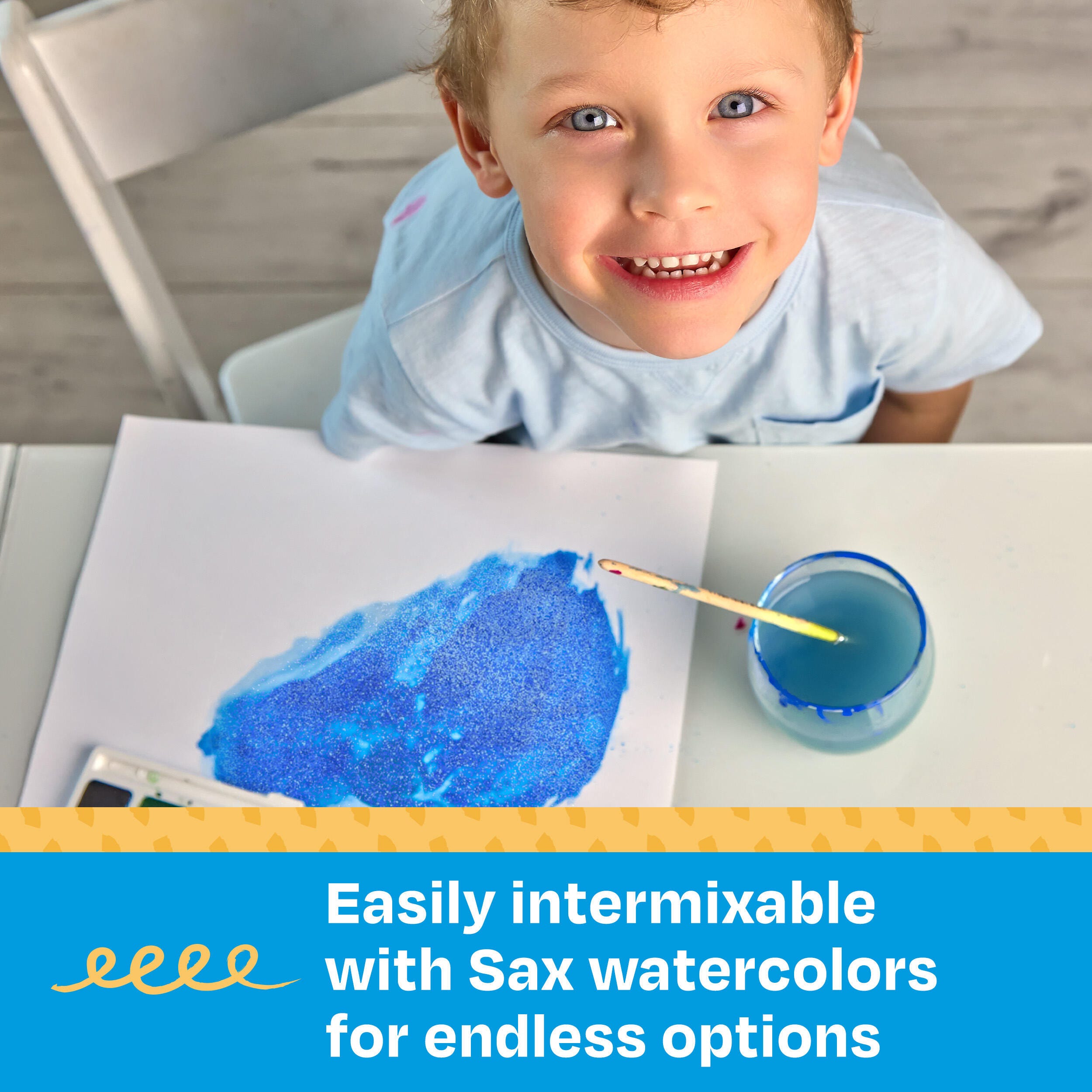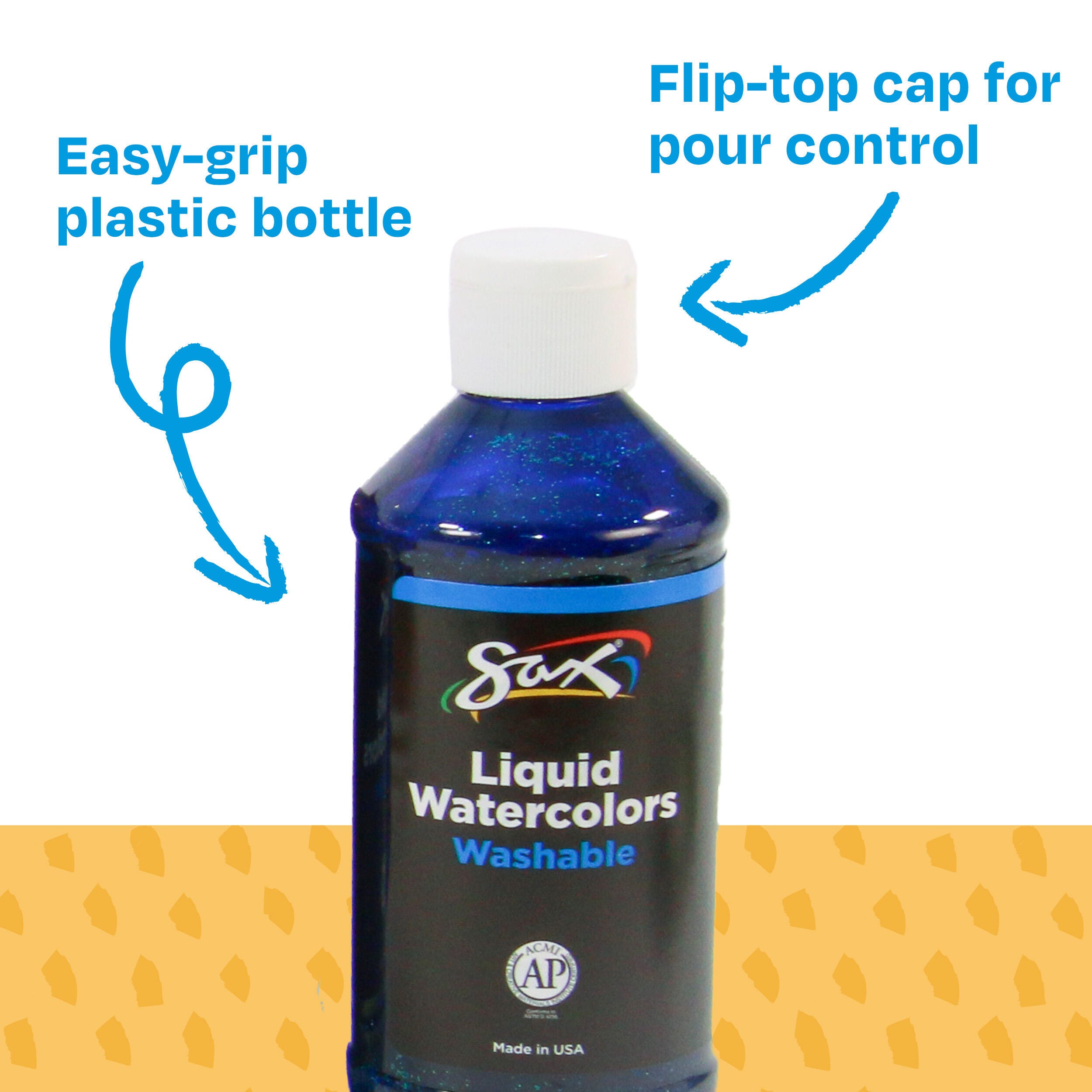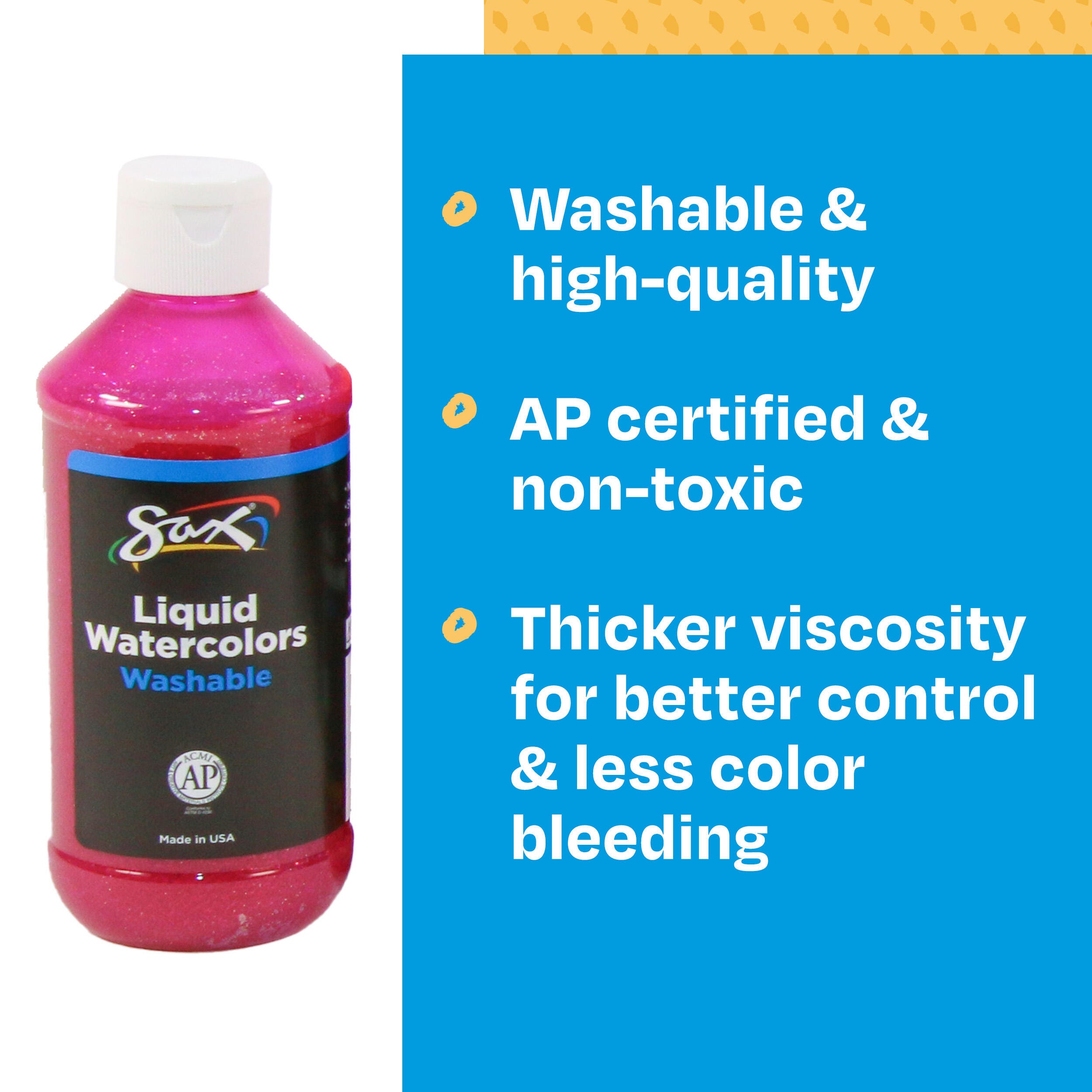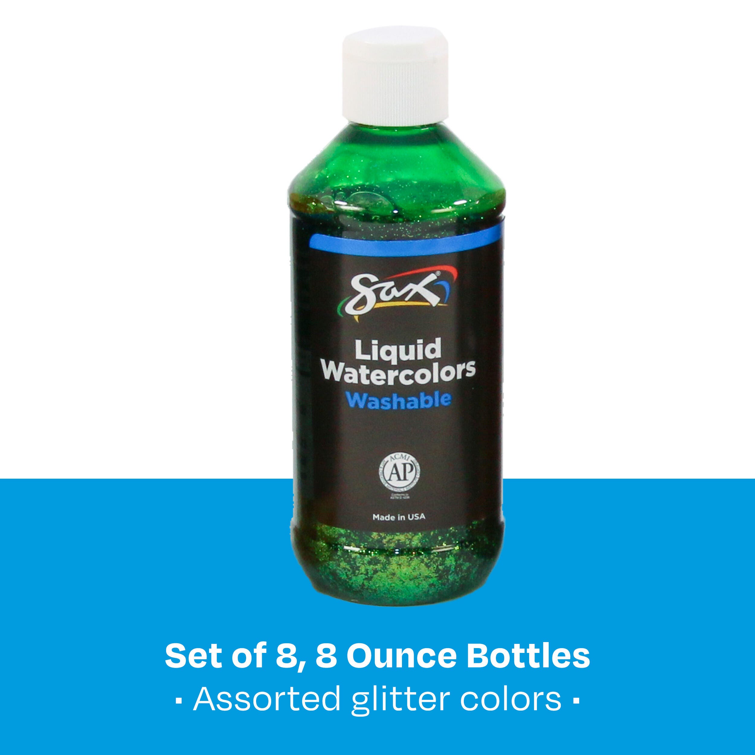 Sax liquid washable watercolor paint comes in assorted glitter colors to foster creativity. The liquid medium provides rich, vibrant hues straight from the bottle with beautiful results when dried on paper or other materials. A thicker viscosity allows for better control and easier dispensing, along with increased surface tension for less color bleeding. Use this paint at full strength (undiluted) or dilute as needed with water for soft, muted colors. The formula is washable, easy to clean from hands with soap and water, and rinses out of most fabrics. Shake well before use. This pack delivers eight bottles of glitter watercolor, with one 8-ounce bottle in each of the following colors: magenta, yellow, red, violet, black, blue, green, and chartreuse.