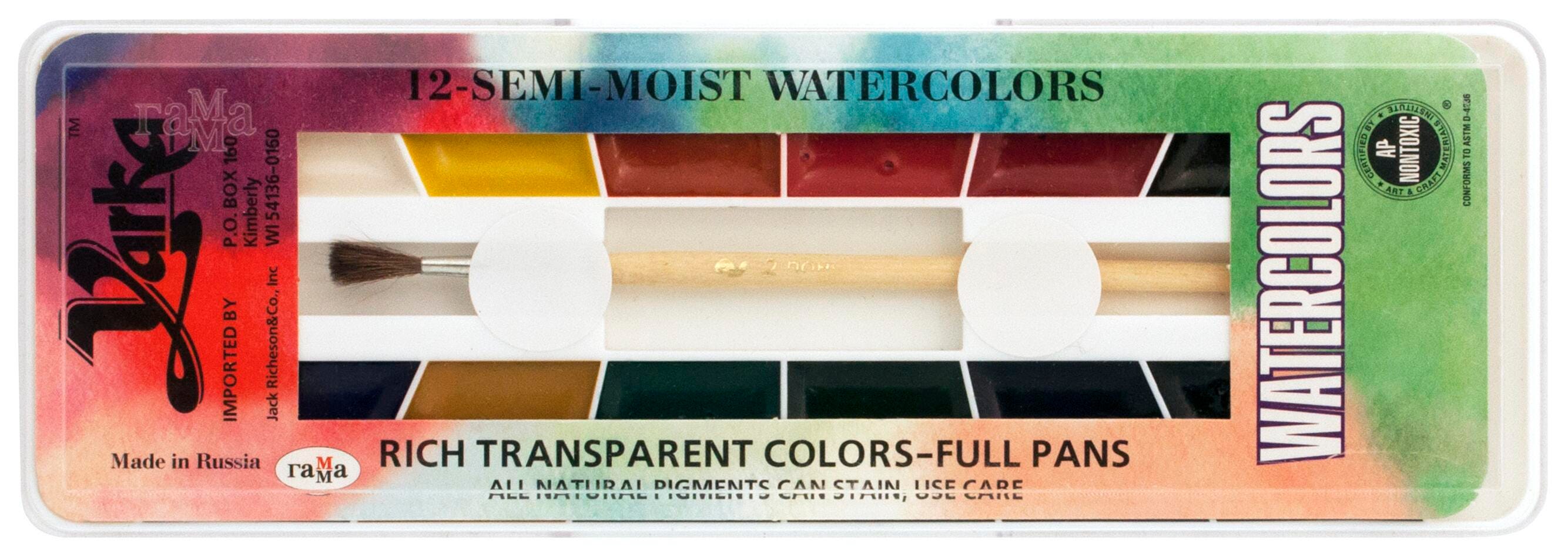 Description Yarka Students Watercolor Set offers semi-moist and full pans of brilliant colors. Set features rich and highly-pigmented transparent colors being Non-Toxic in composition. Set allows students to fill their brushes with lush color quickly and easily. Set of 12 watercolors includes yellow, orange, red, green, blue, violet, brown, black, white, vermillion, viridian and yellow ochre colors.Features Available in yellow, orange, red, green, blue, violet, brown, black, white, vermillion, viridian and yellow ochre Conforms to ASTM D-4236 AP certified