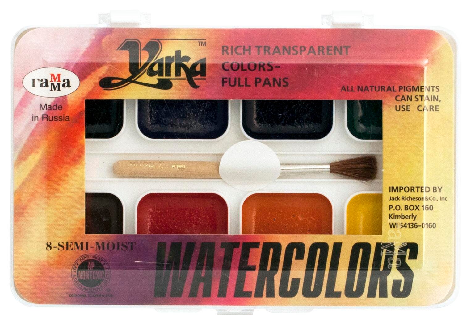 Yarka Non-Toxic Semi-Moist Students Watercolor Paint Set with Brush, Plastic Full Pan, 8 Assorted Brilliant Colors