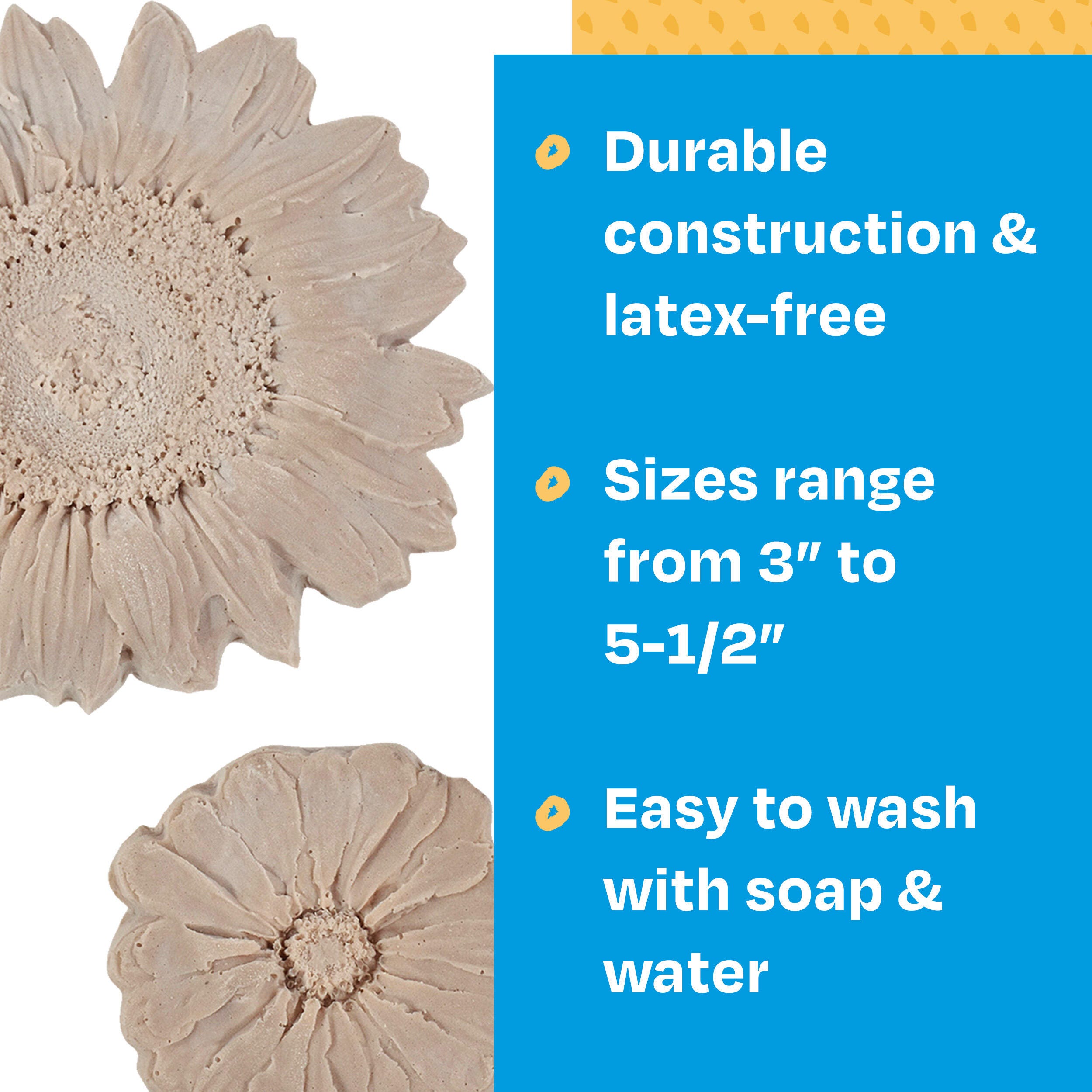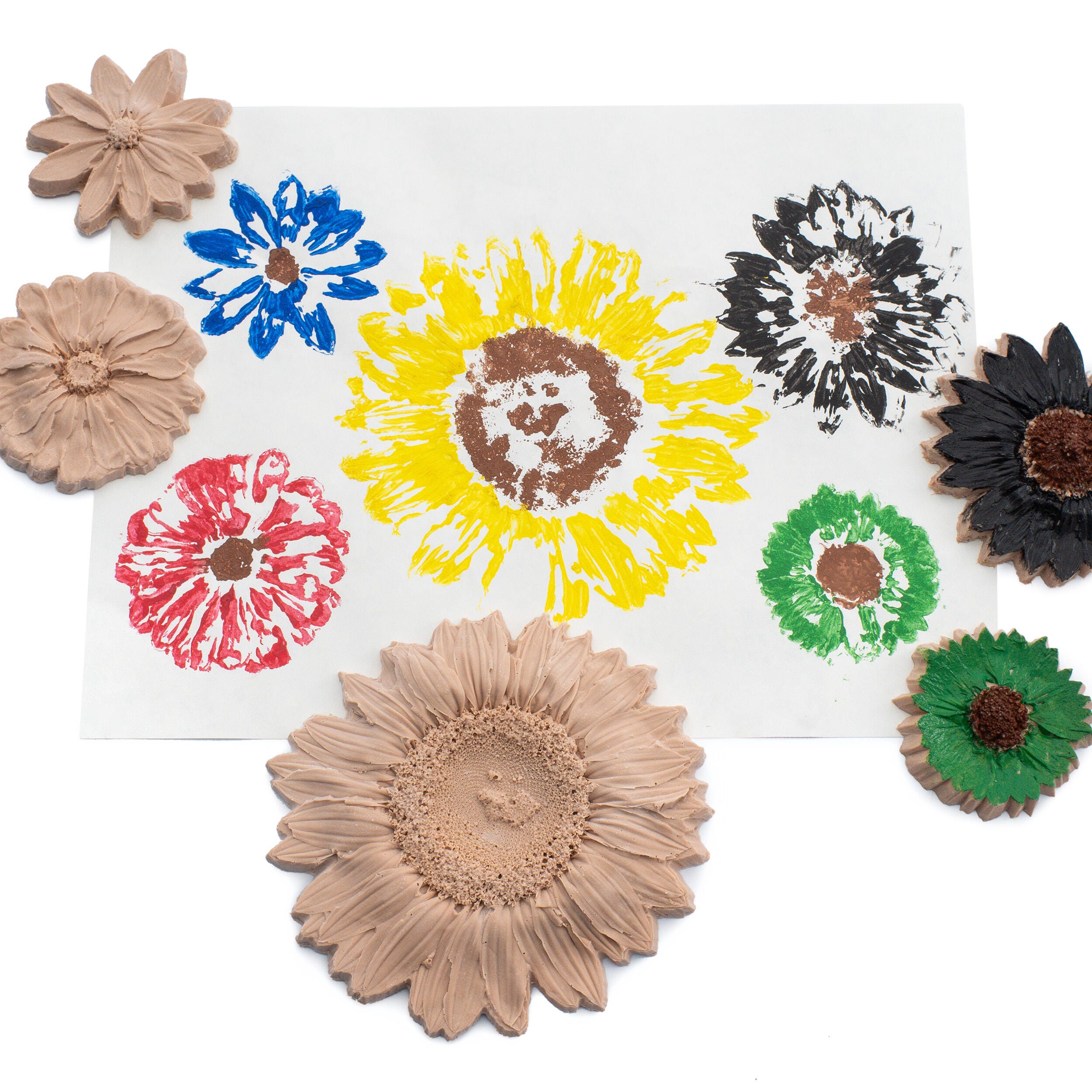 Sax flower prints stamps are ready to be dipped or rolled in paint or oil, and pressed onto paper or other media. You'll be “budding” with creative project ideas with these realistic flower stampers. Simply roll or dip these rubber-like pieces into paint or printing ink, press down onto art paper or fabric, and enjoy perfectly detailed outlines of each beautiful floral design. All these flower replica stamps come in a light tan shade that holds color well for detailed impressions. This set includes multiple floral stamps: the zinnia shape measures 3-1/4 inches; small sunflower is 3-3/4 inches; large sunflower is 5-1/2 inches; daisy is 3 inches; and coreopsis is 3-3/4 inches.