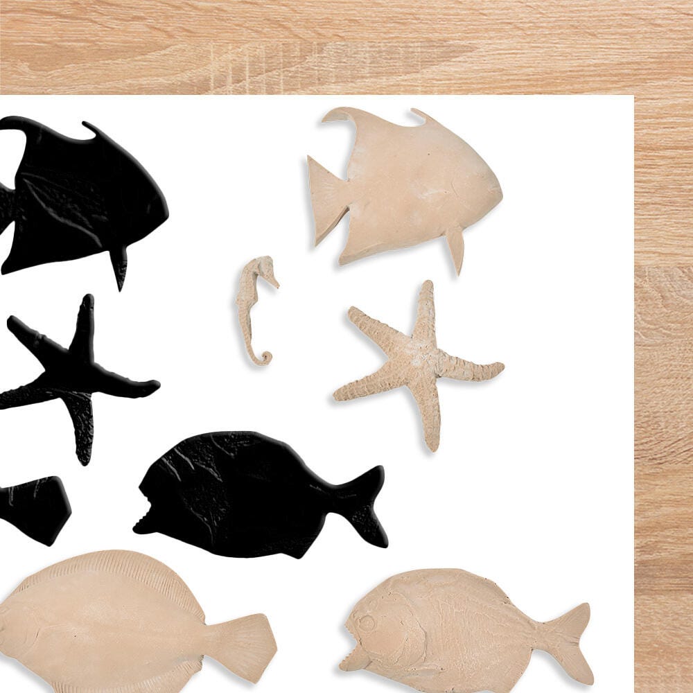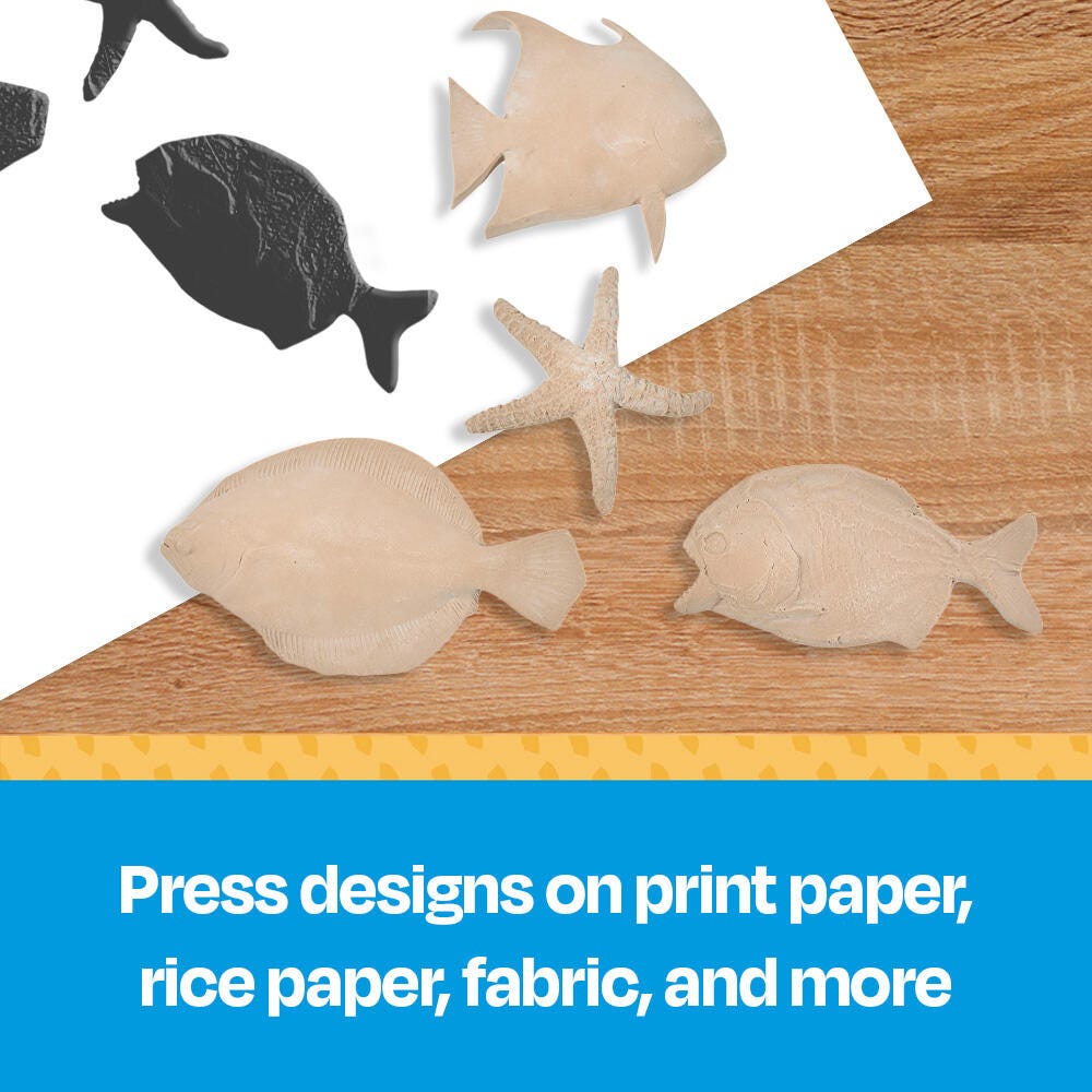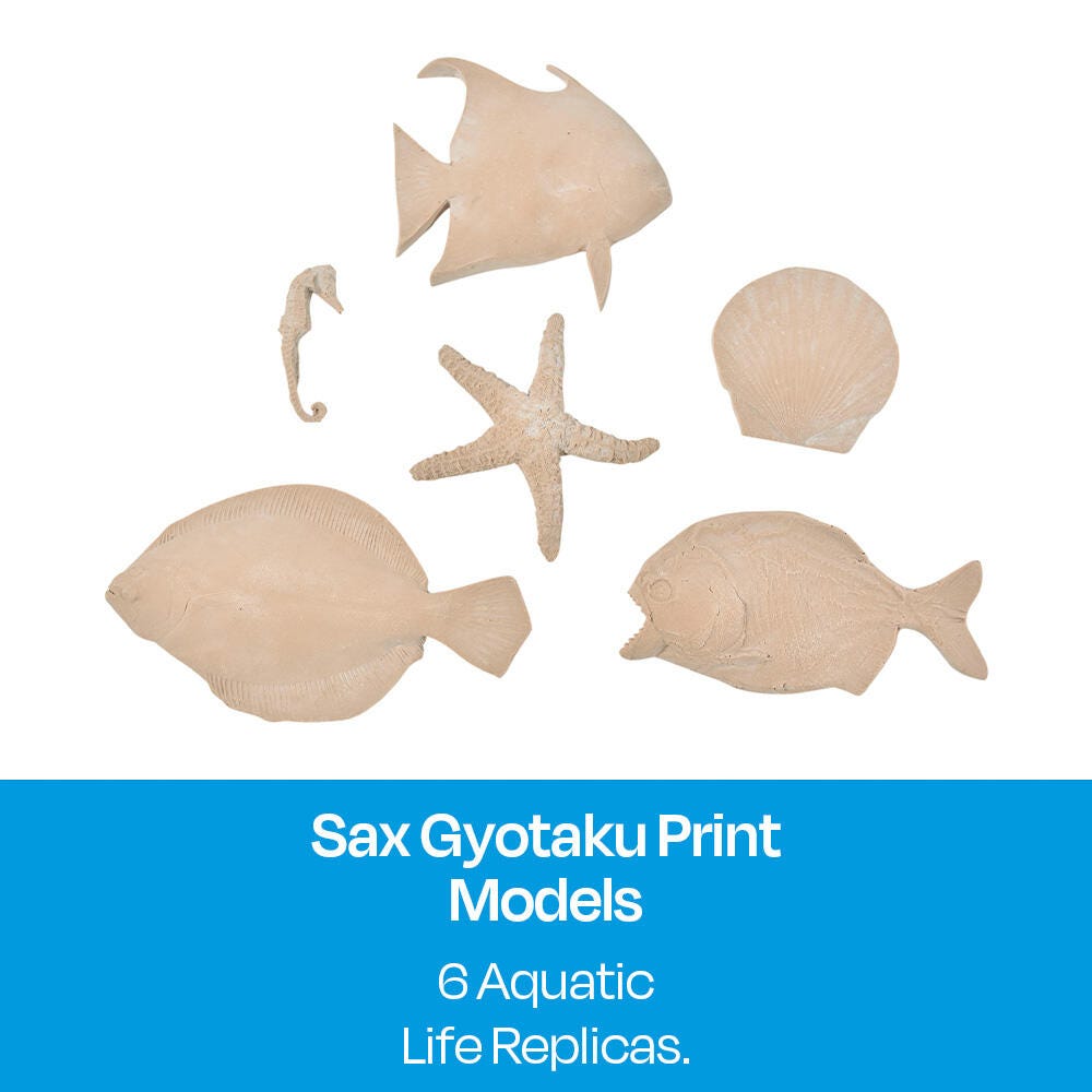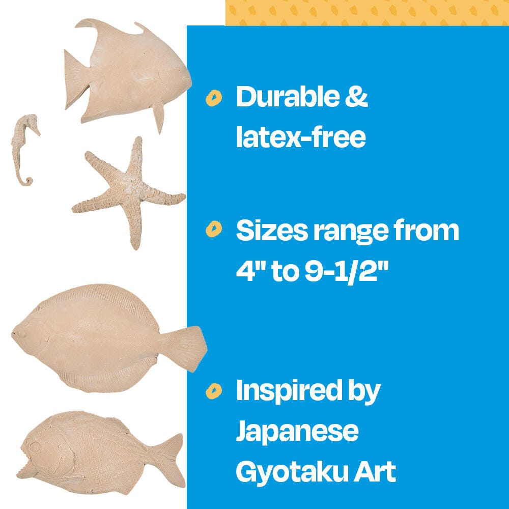 Children will love diving into learning with this Gyotaku Fish Model Set! Dating back to the mid-1800s, “Gyotaku” was used as a practical technique used by Japanese fishermen, who made prints of the sea catches they made as a way to record the size and species of fish they caught. Today, Gyotaku art is a very popular art technique used around the world! This set of water life models can be embellished with paint or printing ink with a foam brayer. Create realistic fish printing on Sax True Print paper, rice paper, fabric, t-shirts, and beyond. This set contains 6 print models that range in size, including an Angel Fish (7 Inches), a Flounder (10 Inches), a Ridged Star Fish (6 Inches), a Scallop Shell (4-1/2 Inches), a Sea Horse (4 Inches), and a Piranha (8 Inches) model.