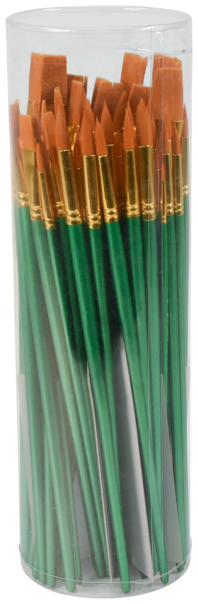 This pack contains 72 brushes with golden taklon bristles