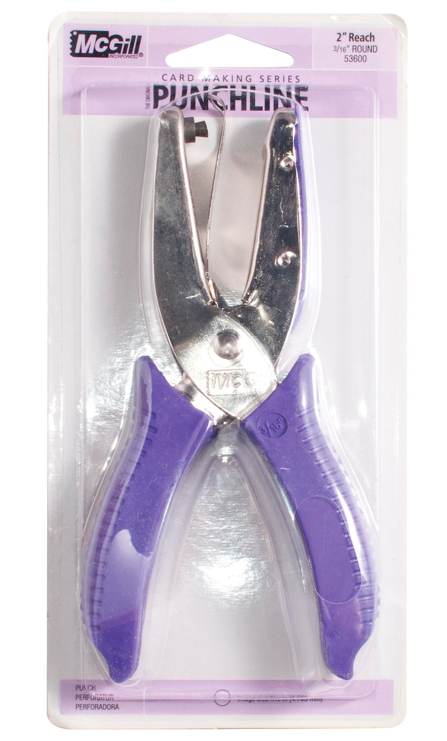 The McGill Punchline features a 3/16 inch round punch and is perfect for use with paper, cardstock, thin plastics, thin metals, craft ribbon, craft foam and more. The punch reaches 2 inches from the edge of your paper/material and features a removable plastic receptacle along with removable, washable cushioned grips for comfort. The punch shape is displayed on both sides of the comfort grips for easy identification.