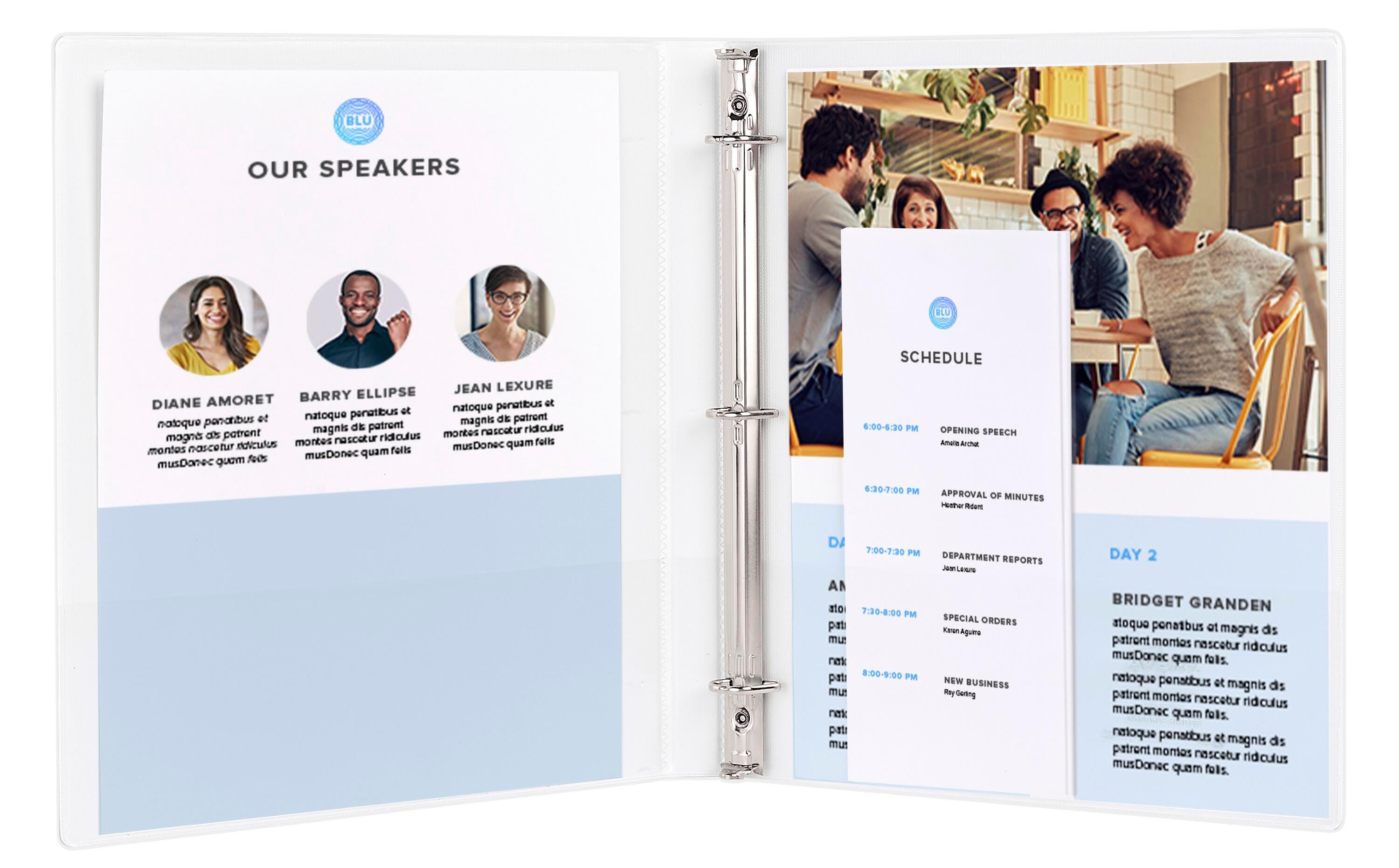 Wide front and back binder panels fully cover standard dividers and sheet protectors