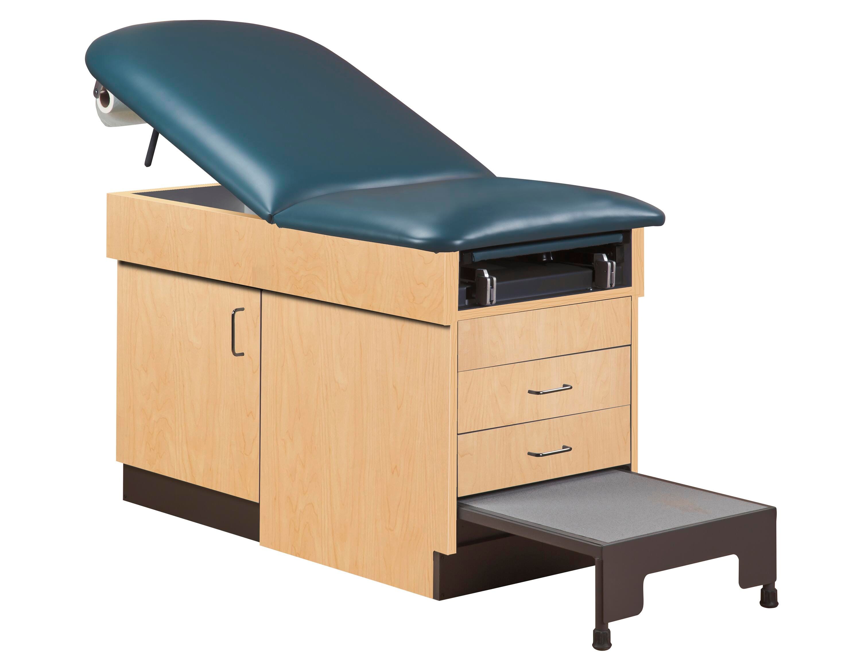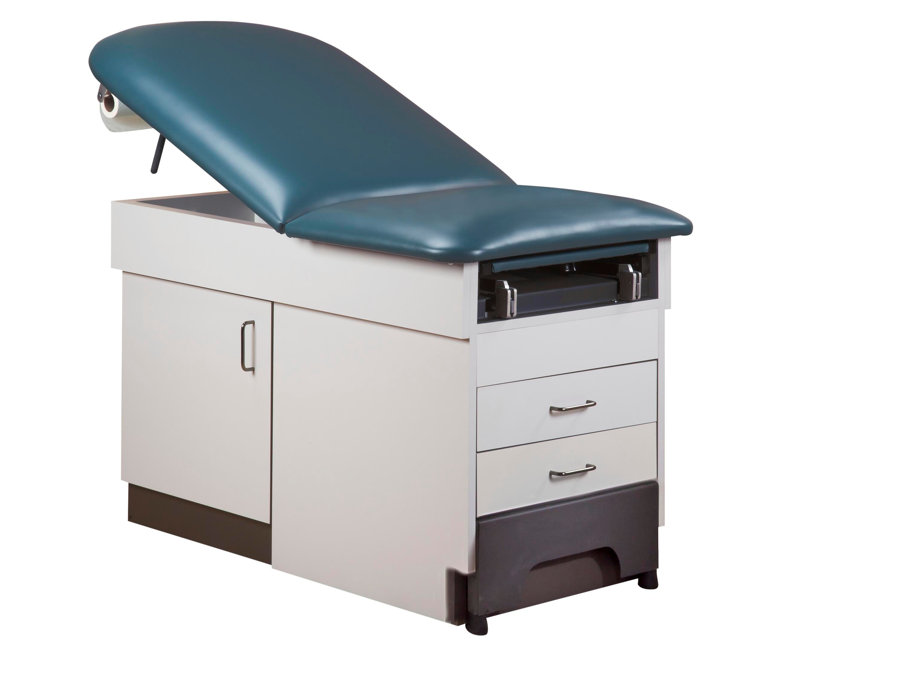Clinton Family Practice Exam Table comes with a laminate base, adjustable upholstered AIR SPRING top and a pull-out step stool. Exam table includes features such as a large storage compartment with shelf and two drawers with all steel sides. Along with the pull-out step stool, the exam table has a pull-out leg rest, adjustable feet for leveling, adjustable back rest, and an optional pull-out basin.