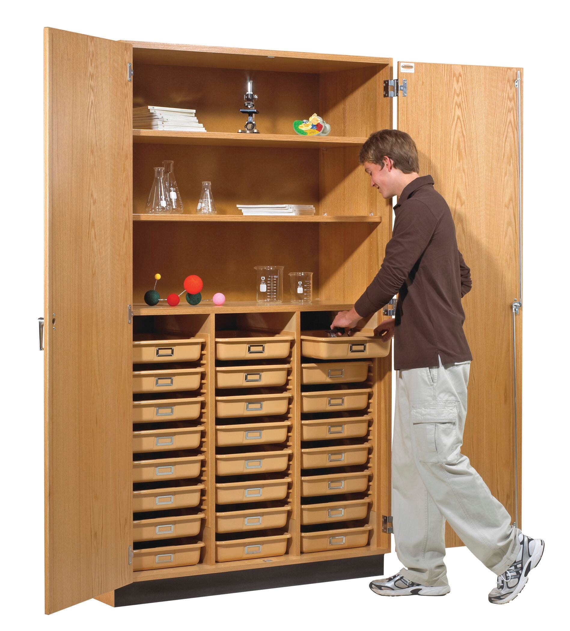 This sensible storage case holds 24 tote trays and has 2 adjustable and one fixed shelf. A great place for students to store their art or science projects. Tote tray storage case has hinged oak doors with three-point locking handles. Trays measure 14-1/4 W x 19 D x 3-1/2 H inches. Cabinet measures 48 W x 22 D x 84 H inches. Limited Lifetime Warranty.