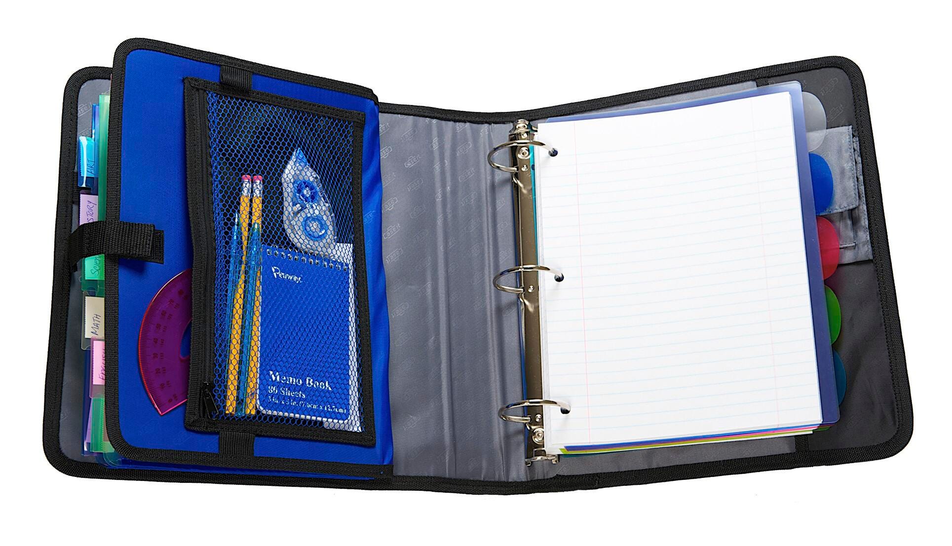 Two inch, 3 ring binder includes inside pockets for school and work supplies. Features a 5-color tabbed expanding file for better organization and a place to hold an MP3 player and flash media. Guaranteed to last the school year. Contents of binder sold separately.