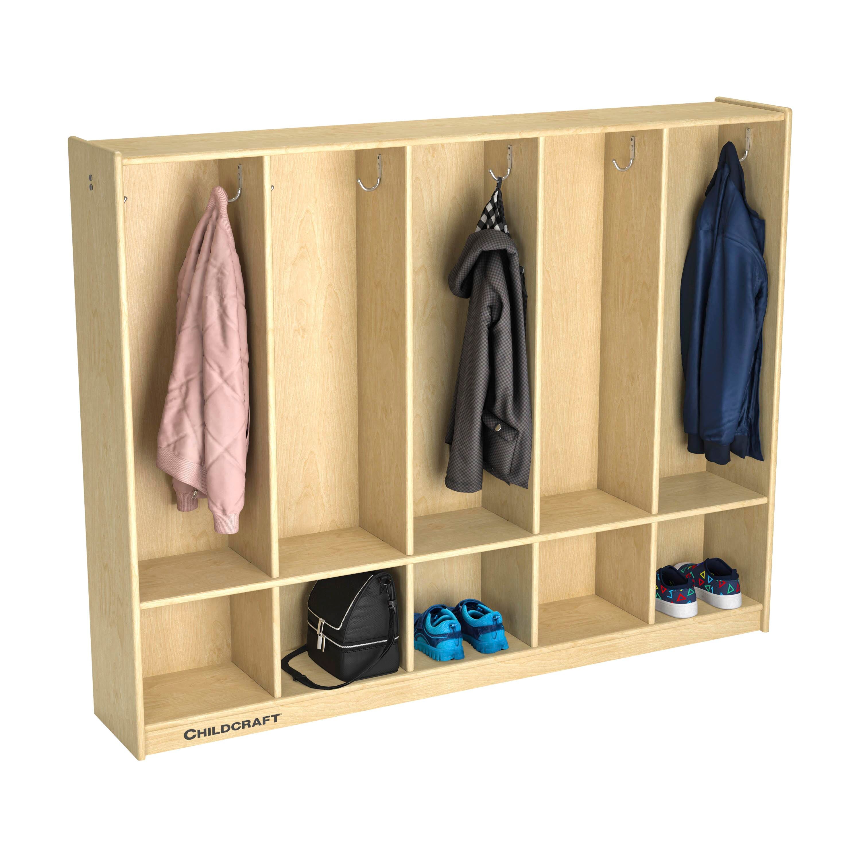 The Childcraft® Coat Locker with 5 Sections is a space-saving storage solution designed to keep coats, backpacks, and personal items organized and accessible. Each locker section includes two solid aluminum hooks (one on each side) for hanging coats or bags, while lower cubbies provide additional room for shoes, lunchboxes, books, or other supplies. With a narrow footprint and open design, this cubby locker is perfect for early learning environments. Crafted from durable birch plywood with a smooth, easy-to-clean finish, this children’s locker is built to withstand everyday use. Measures 53-3/4 W x 9-5/8 D x 42 H inches. Arrives fully assembled. Must be wall-mounted for maximum stability; not recommended as a room divider.