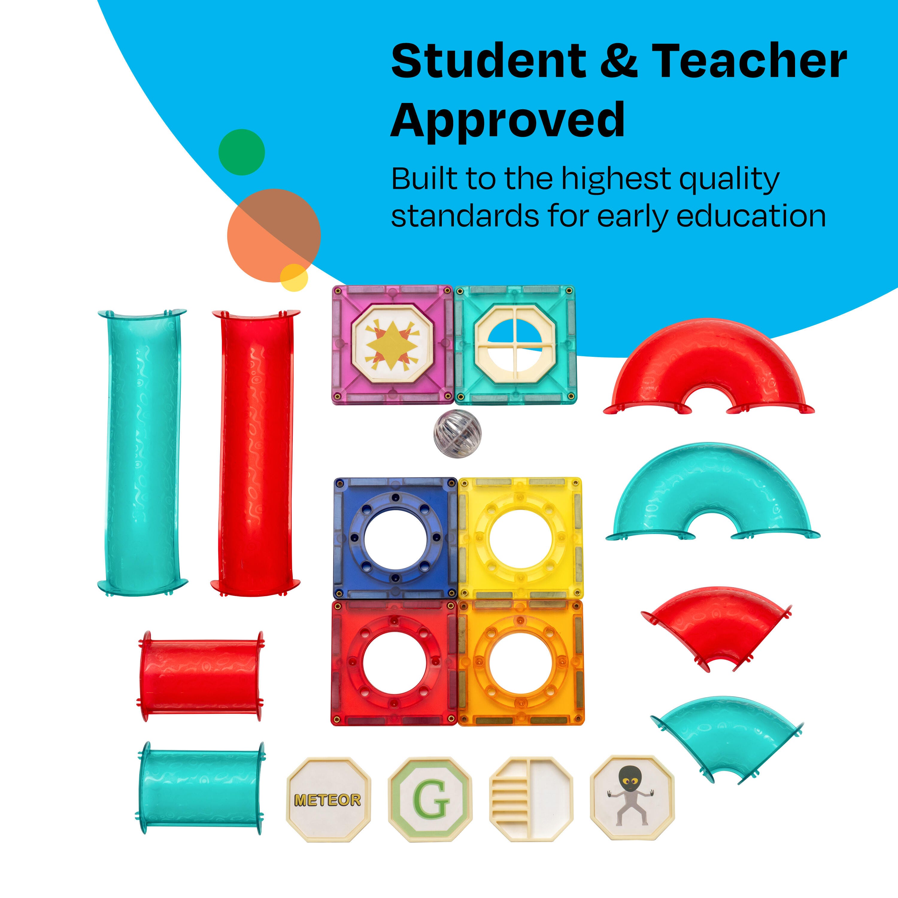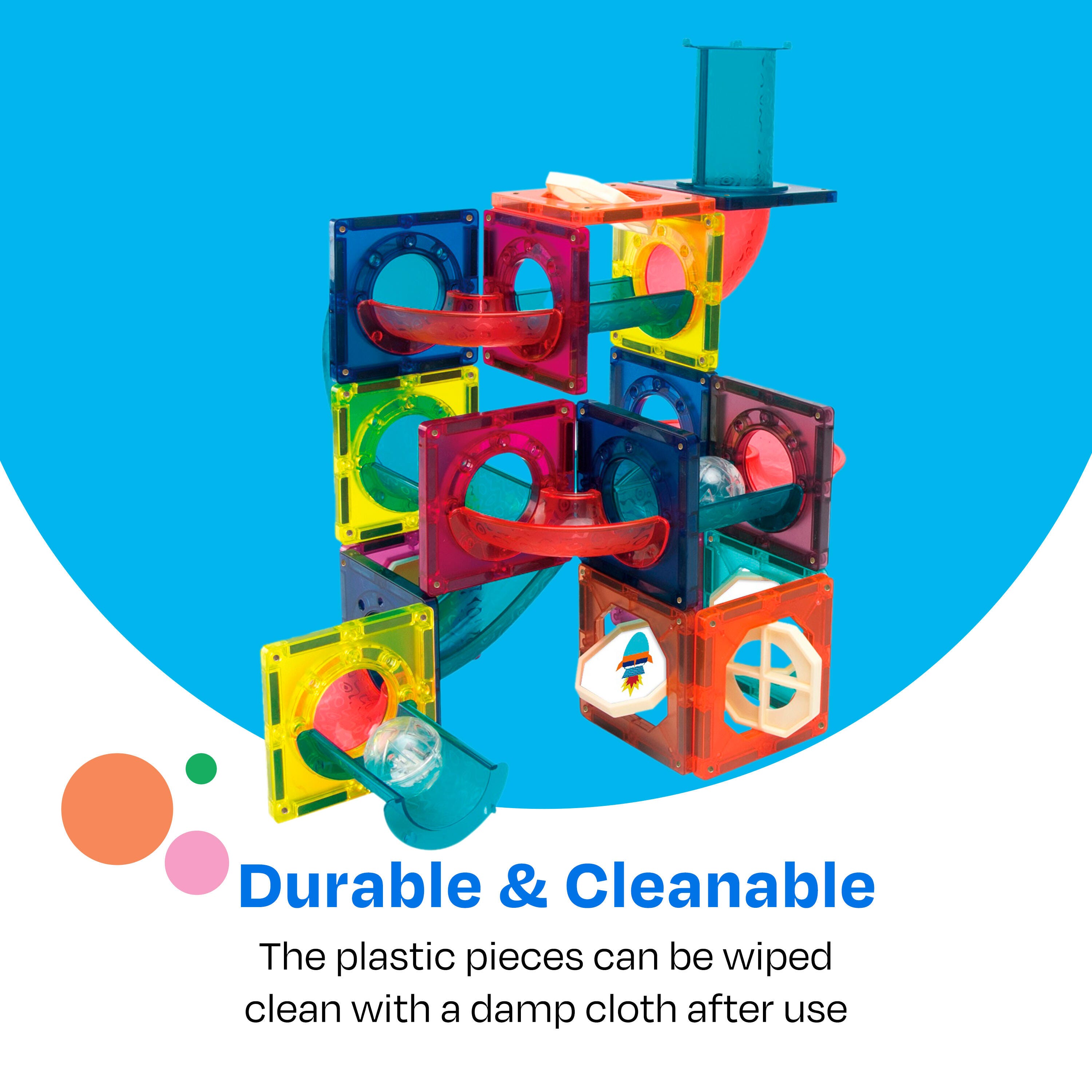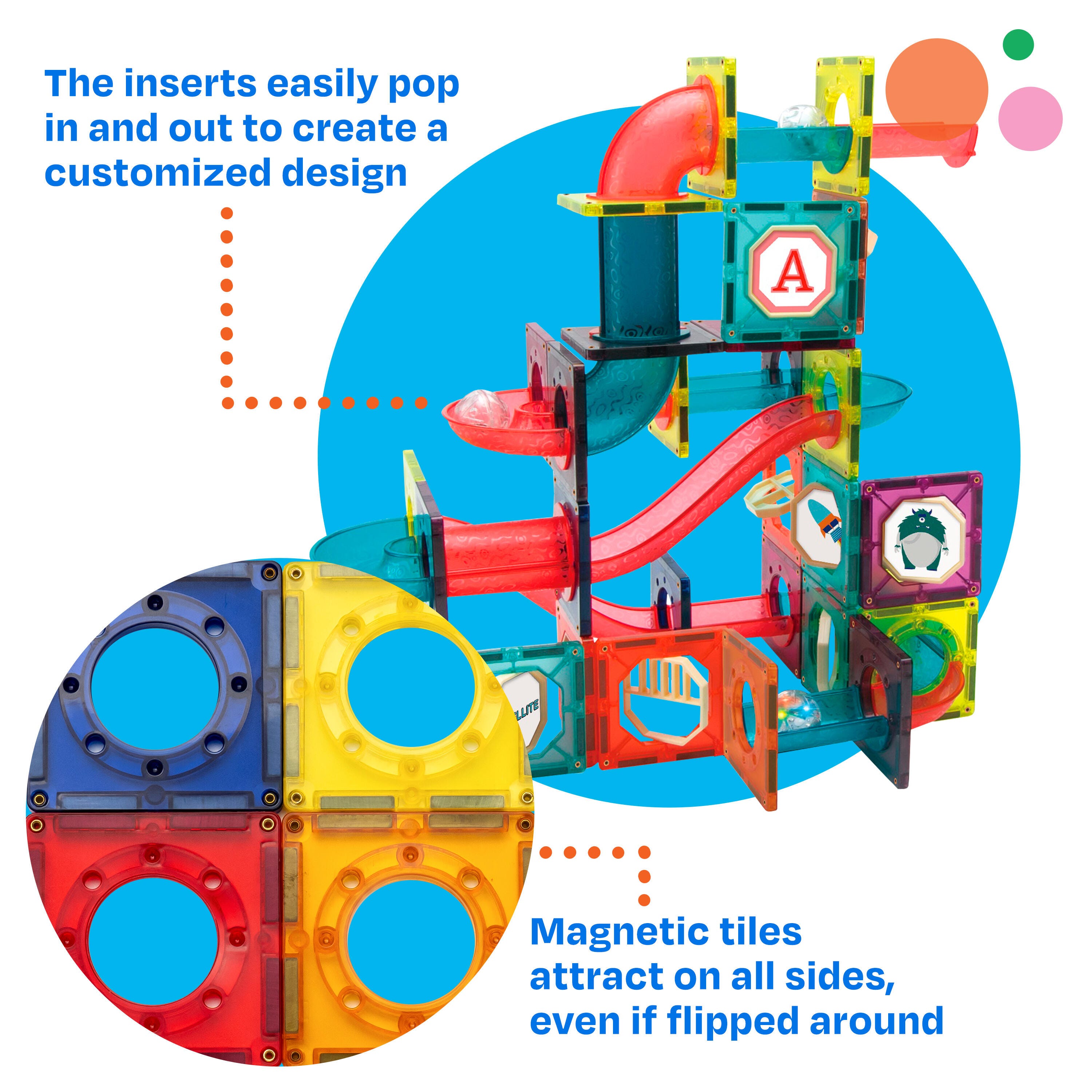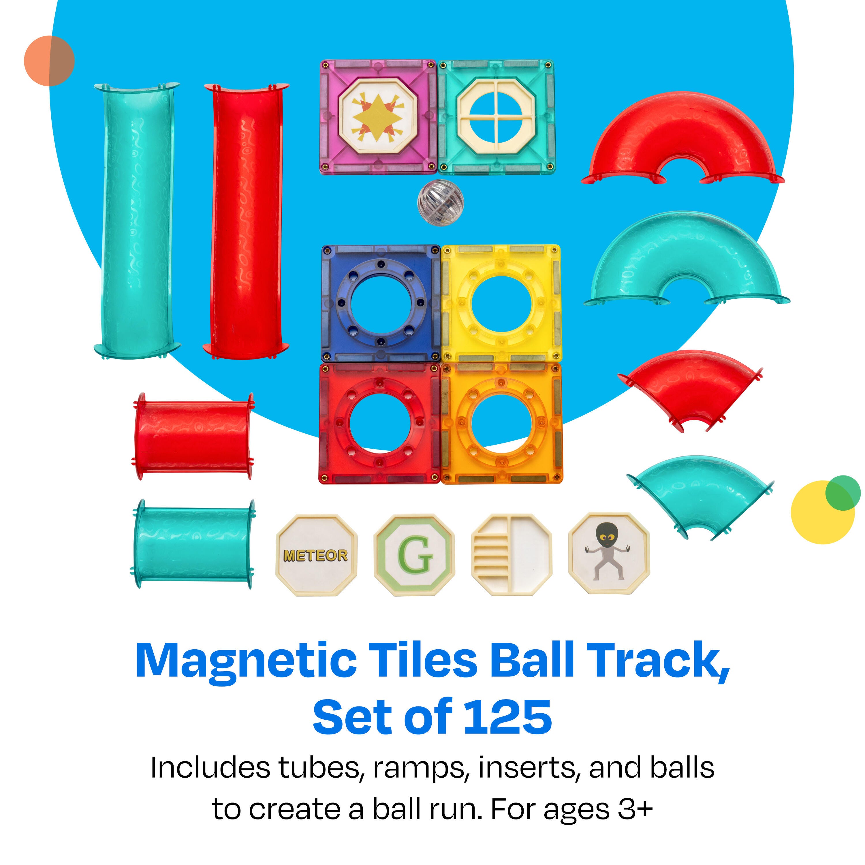 Includes balls and a variety of translucent tiles, tubes, and ramps that connect magnetically