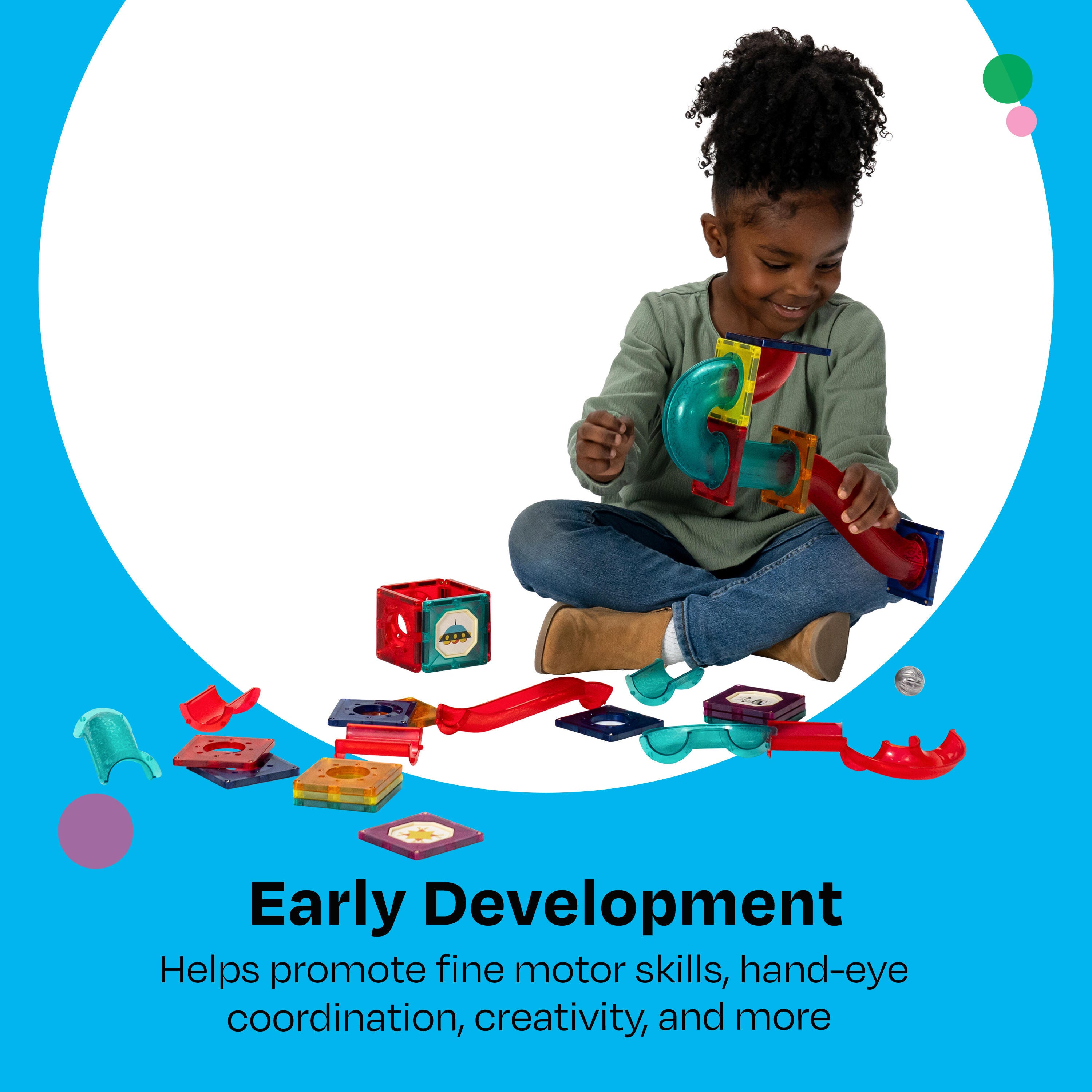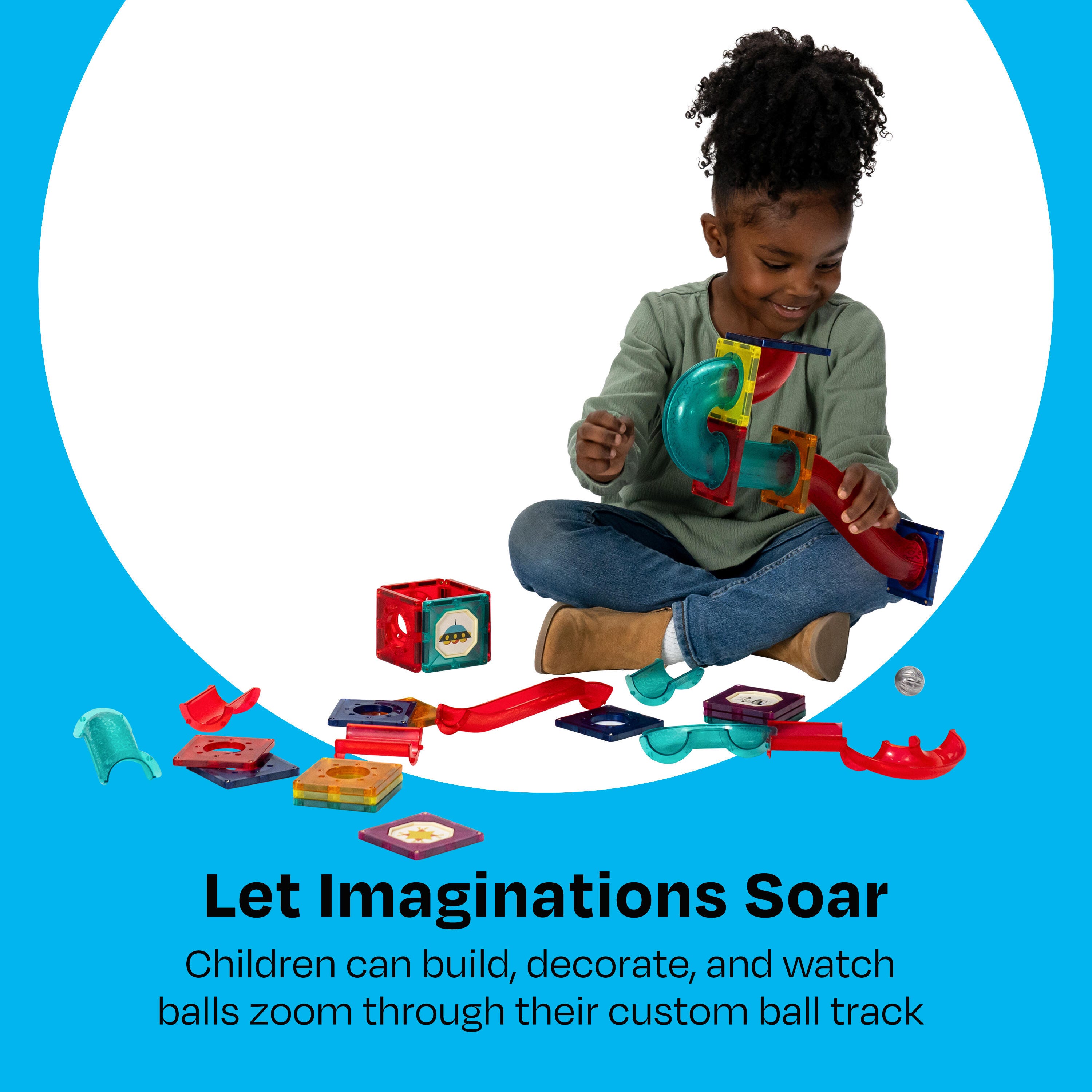 Childcraft® Magnetic Tiles Ball Track is an exciting way to encourage imaginative play and learning. This set features 125 translucent magnetic tiles, tubes, and ramps in assorted colors and shapes. The magnetic tiles attract on all sides, making it easy to assemble a custom ball run that encourages creativity, problem-solving, and coordination. Children can use pop-out inserts to decorate their builds and watch the included balls zoom through their creations. Designed for ages 3+, this magnetic play set is perfect for screen-free fun and hands-on skill building.