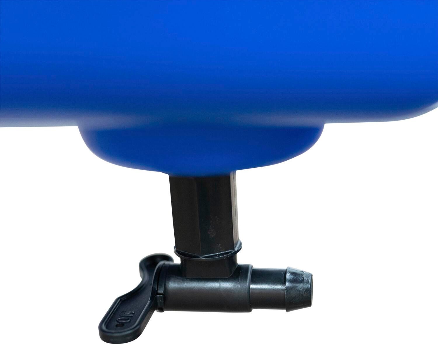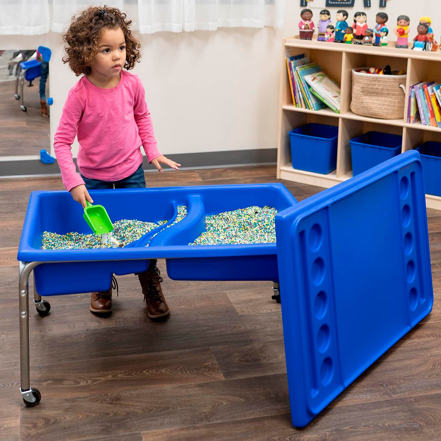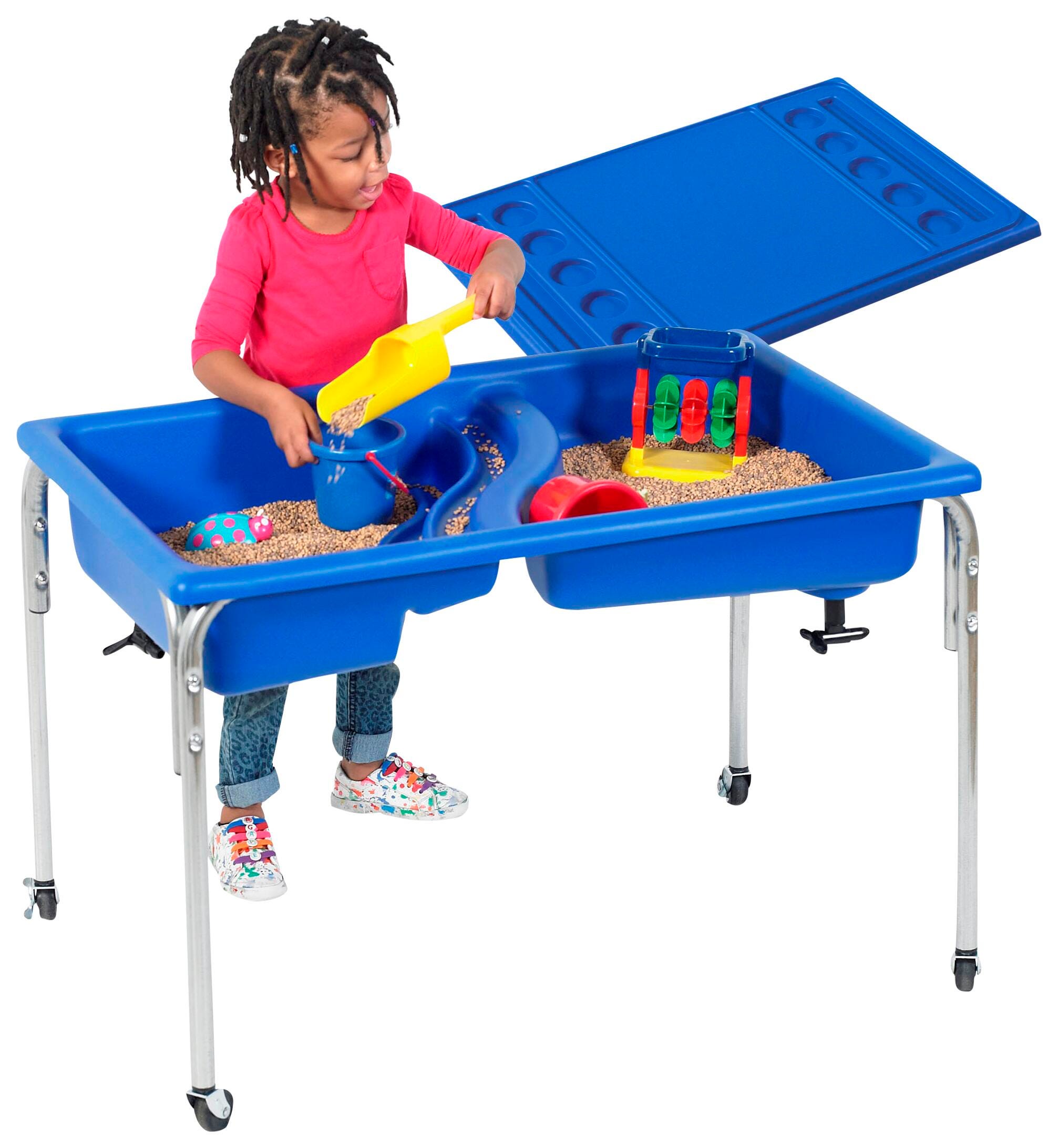 This 18-inch high sand and water table offers quality and affordability! The double basin lets children explore the properties of water and sand without making a big mess. Each of the two basins has a drain and a bottom textured with fish crabs and starfish. Both basins are divided by a waterfall to allow for observation of water flow. The blue tub is supported by a sturdy steel frame and has casters (2 locking and 2 non-locking) for easy mobility.