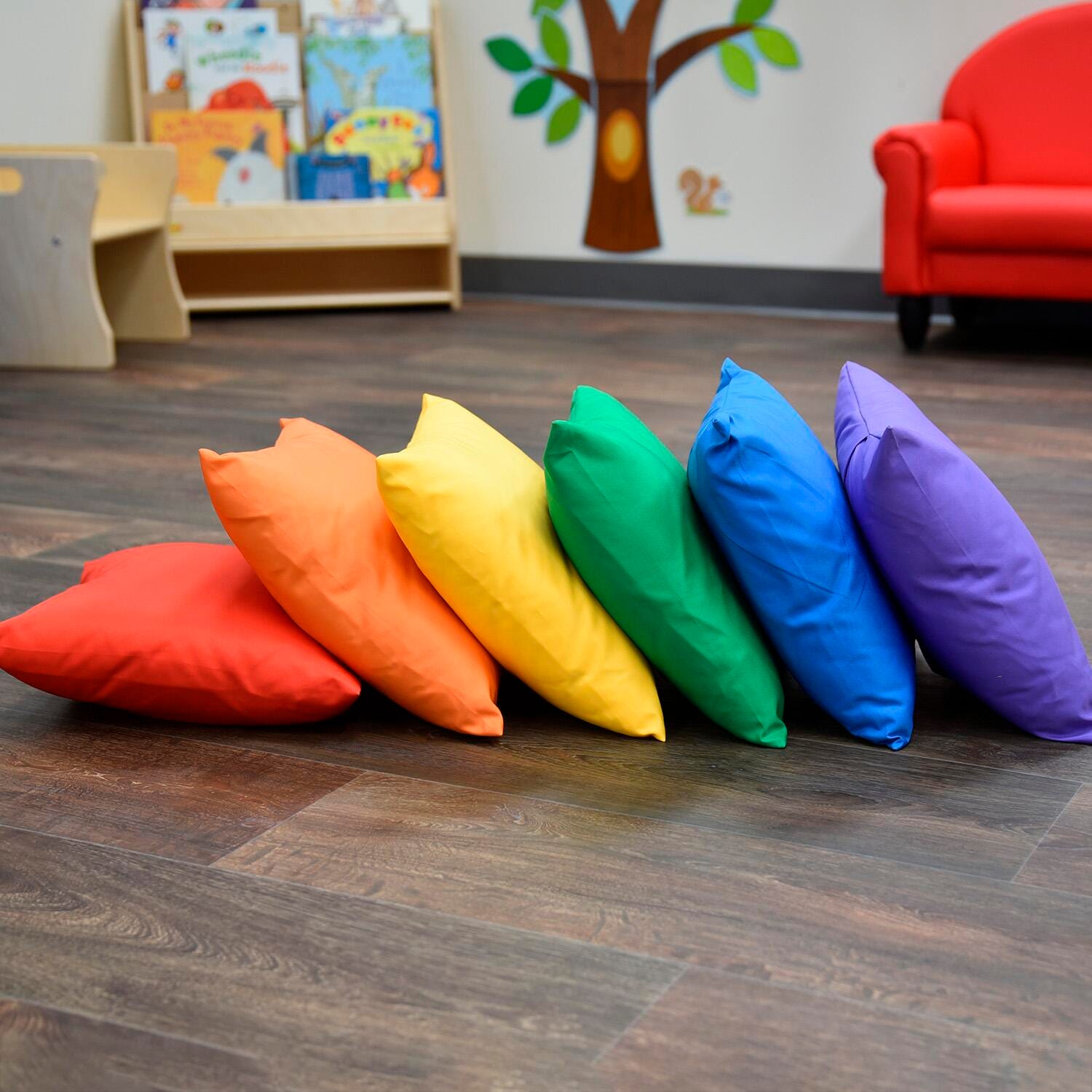 Description A colorful way to cuddle up! Soft pillows in primary colors are a perfect addition to any classroom, care center, reading corner, or library. These 6 small colorful pillows can be used in any number of ways. Pillows are filled with polyester fiber and have removable washable and dryable polyester covers. Each pillow measures 17 L x 17 W, with a thickness of 6 inches.Features Creates an instantly comfortable storytime in seconds with comfortable foam floor seat Thick foam support is both supportive and soft for ultimate comfort Quality polyester cover can be washed separately for a more sanitary space Easy to carry and easy to store Vibrant, high-contrast cover lends an opportunity for early color identification Includes: 6 Pillows (Orange, Red, Blue, Purple, Green, Yellow)