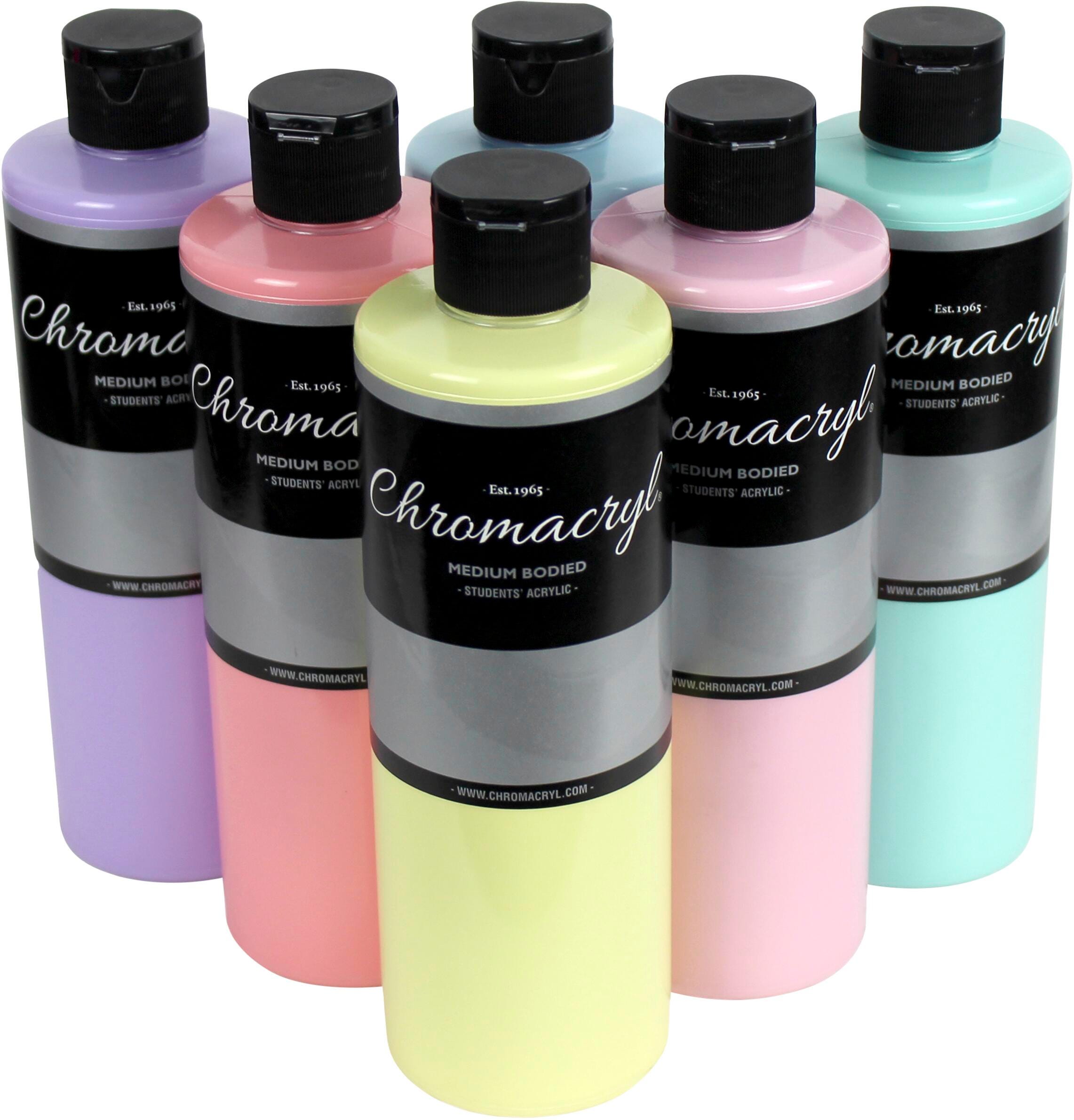 Description Chromacryl Student's Acrylic Paints come in 1 pint plastic bottles, medium bodied formula, and 6 assorted pastel colors for all types of art creation needs. Freeze/thaw stable.Features Multi-purpose acrylic paints that do it all at a tempera price Formula dires flexible and cleans up easily with soap and water Primary/secondary color intermixability Plastic bottle containers with caps provide easy and safe dispensing AP certified non-toxic Set of Acrylic Paints Include One Pint of Each Color: Pastel Pink Pastel Orange Pastel Yellow Pastel Green Pastel Blue Pastel Violet