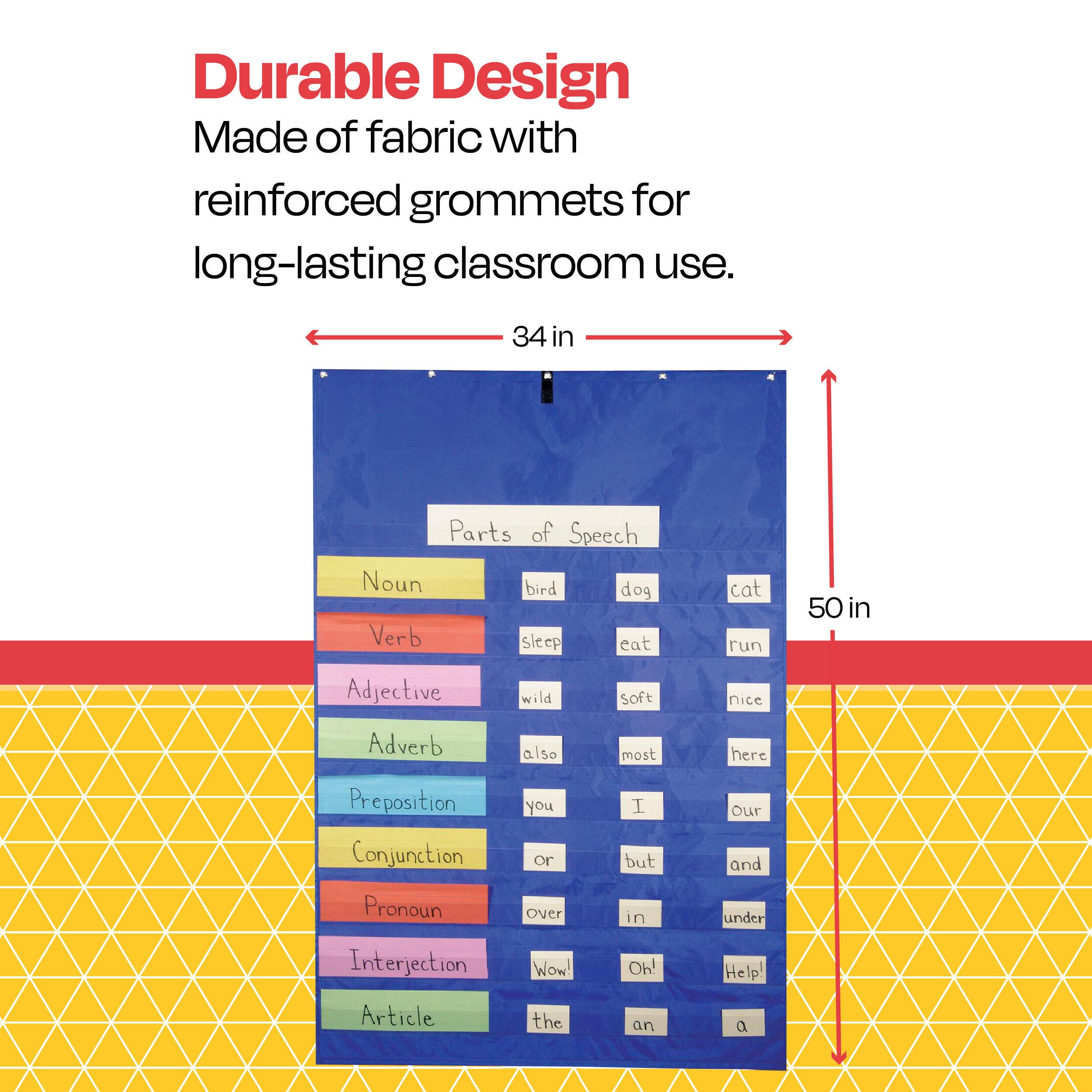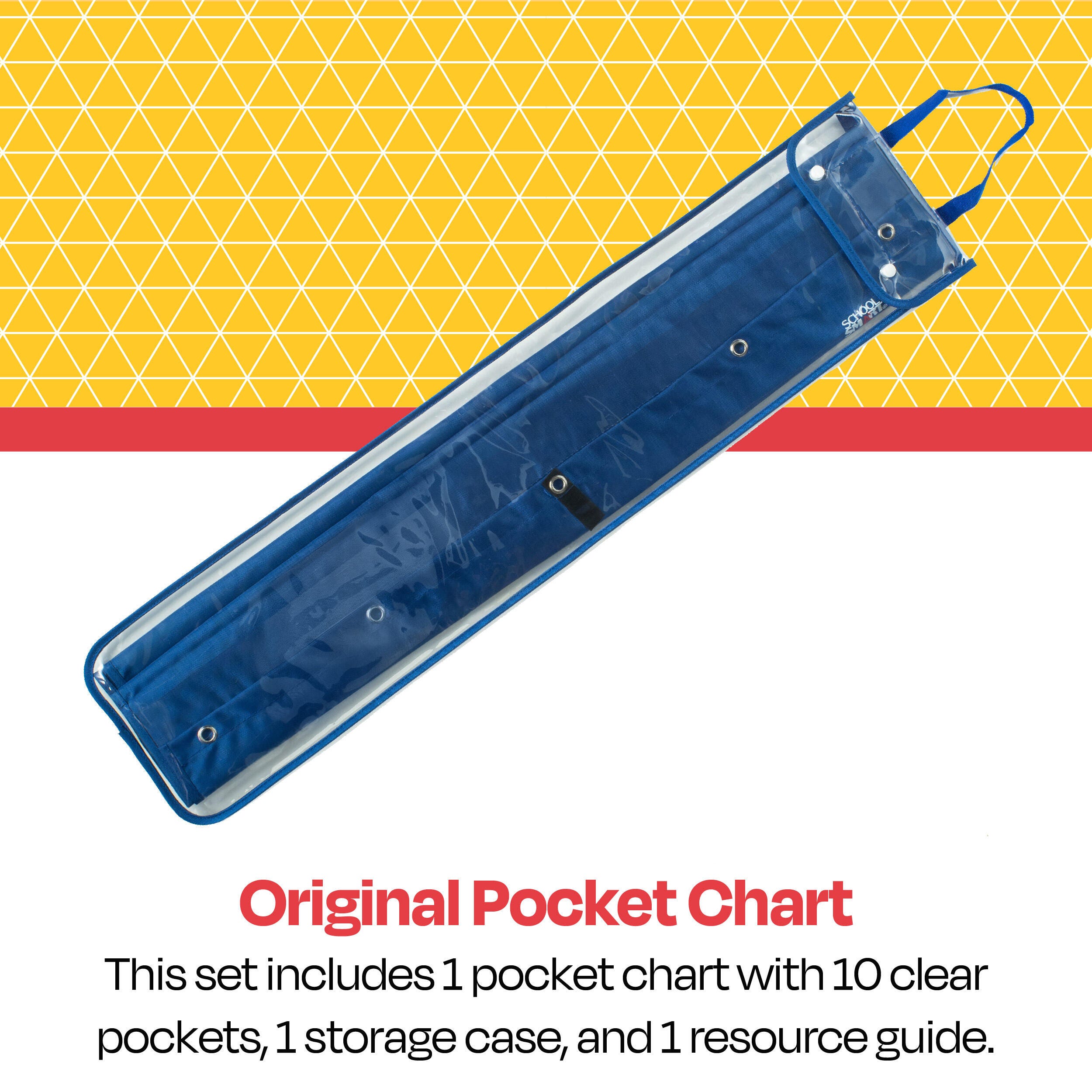 Description The School Smart original pocket chart for classrooms and teachers can be used for holding cards or sentence strips and for small group or whole class activities. Use this chart as a calendar, lesson plan, organizer, and more. A carrying case for easy storage and resource guide are included. Note: Strips, cards, and manipulatives not included.Features Features 10 clear pockets and measures 50 L x 34 W inches Standard hanging charts are a great multi-use tool for elementary school and middle school Great for classroom demonstrations and organization Easy to hang thanks to sturdy reinforced grommets that prevent wear and tear Reusable design can be utilized each school year Pockets measure 1-3/4 x 33-1/2 inches. Includes: 1 Original Pocket Chart 1 Exclusive Storage Case 1 Resource Guide