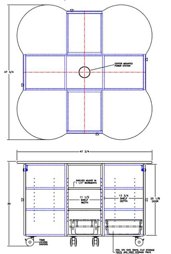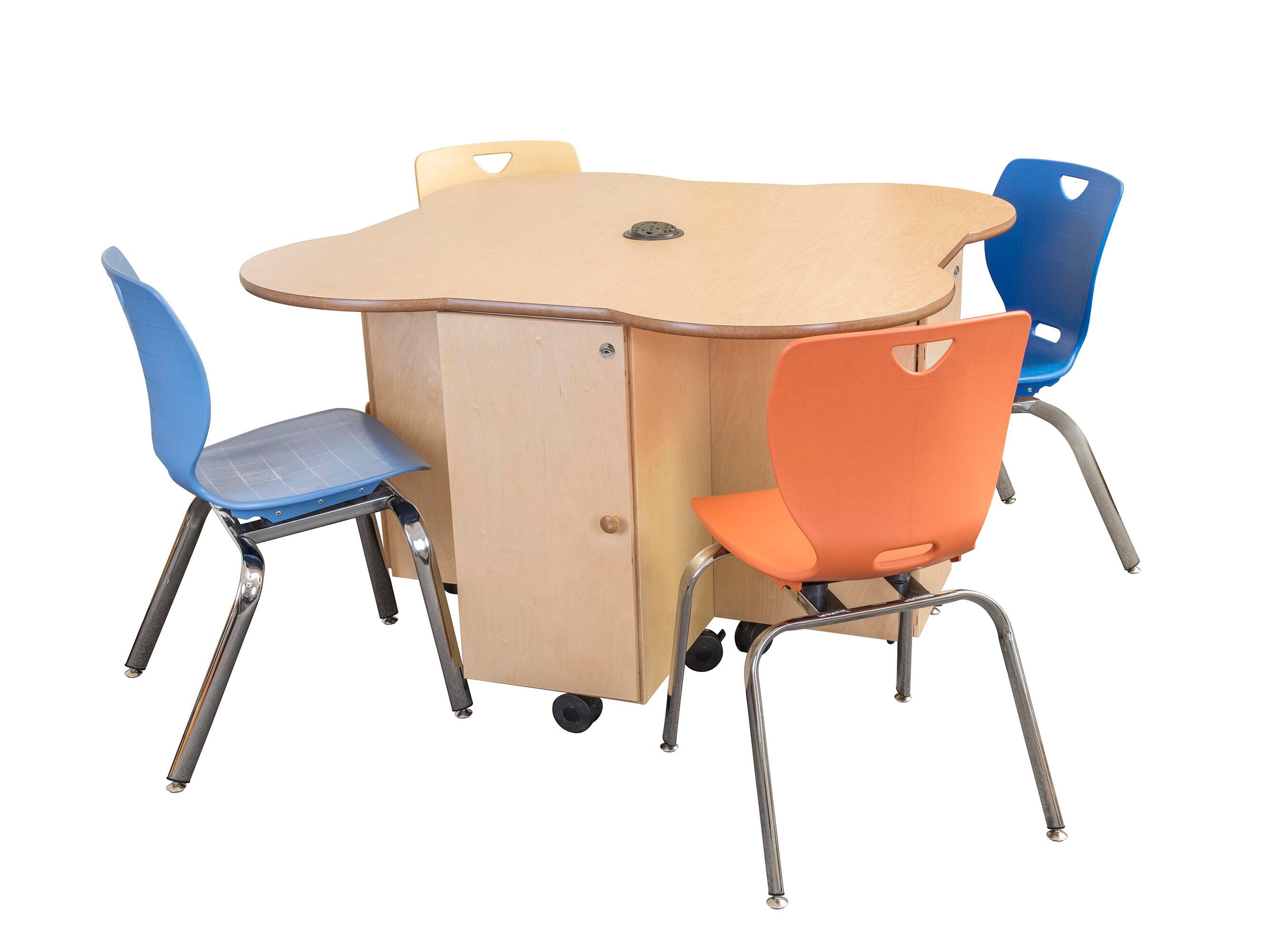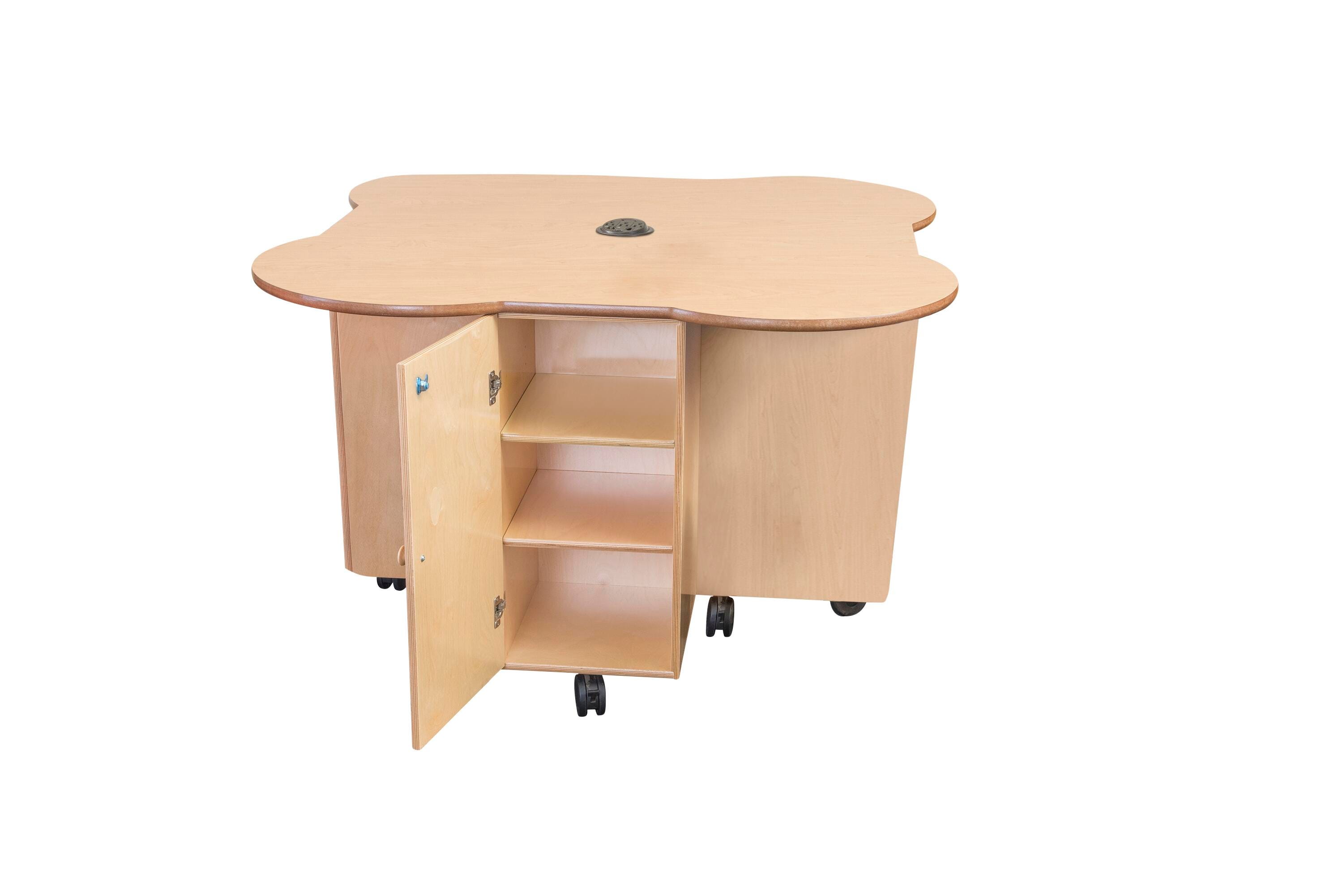 This table comes equipped with 4-compartments, each with two adjustable shelves and locking doors, providing plenty of space for storing and organizing tools, supplies, and more. The wood-grained laminate top is durable and cleans easily and the tabletop grommet features 3 AC outlets, 2 USB ports, and an Ethernet jack. Fully mobile on 4 heavy-duty 3-inch locking casters. Full dimensions are 47-3/4 x 47-3/4 x 30 inches and comes assembled for your convenience. If you need a smaller size, see the Childcraft® STEAM Table (1603221).