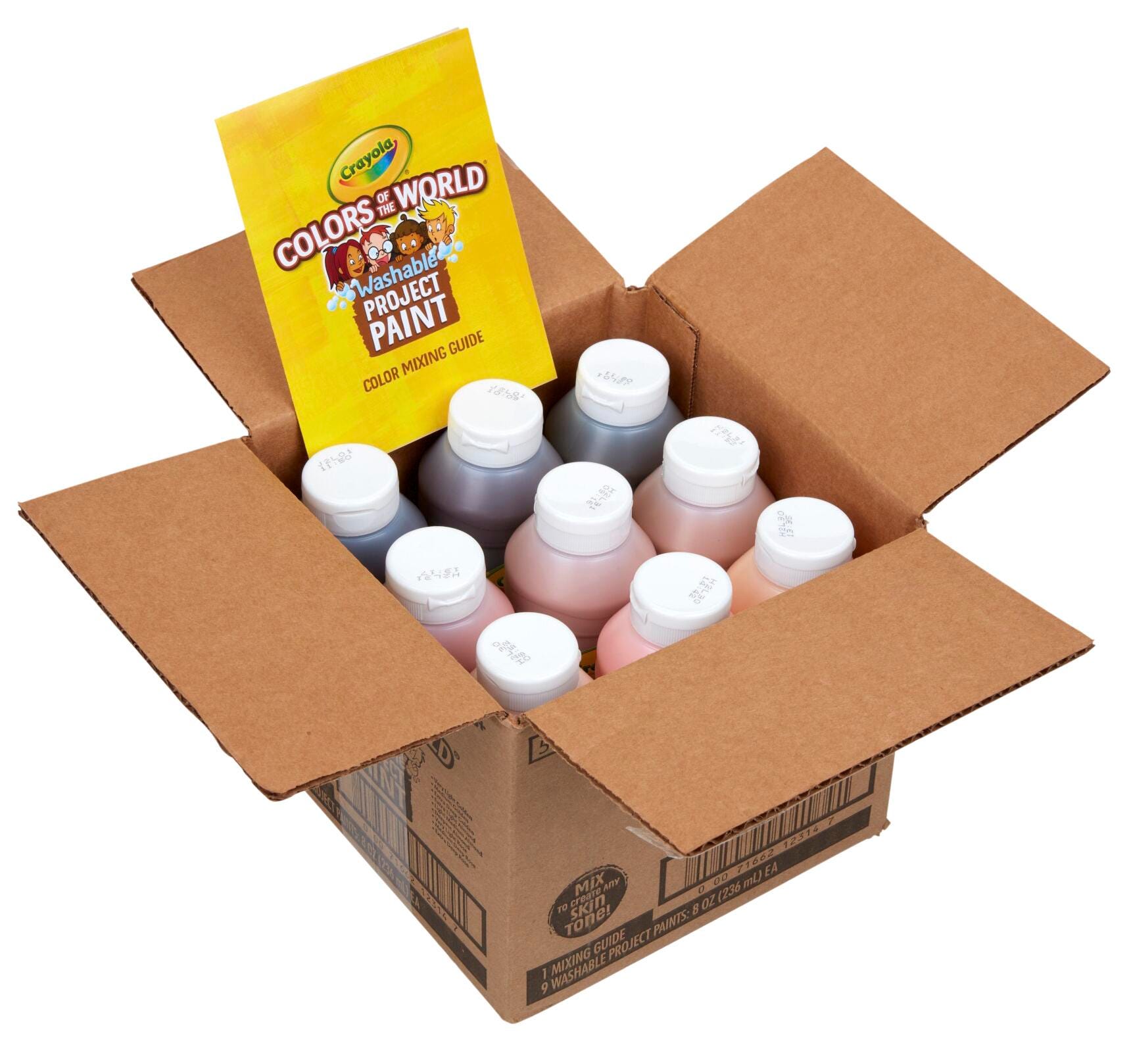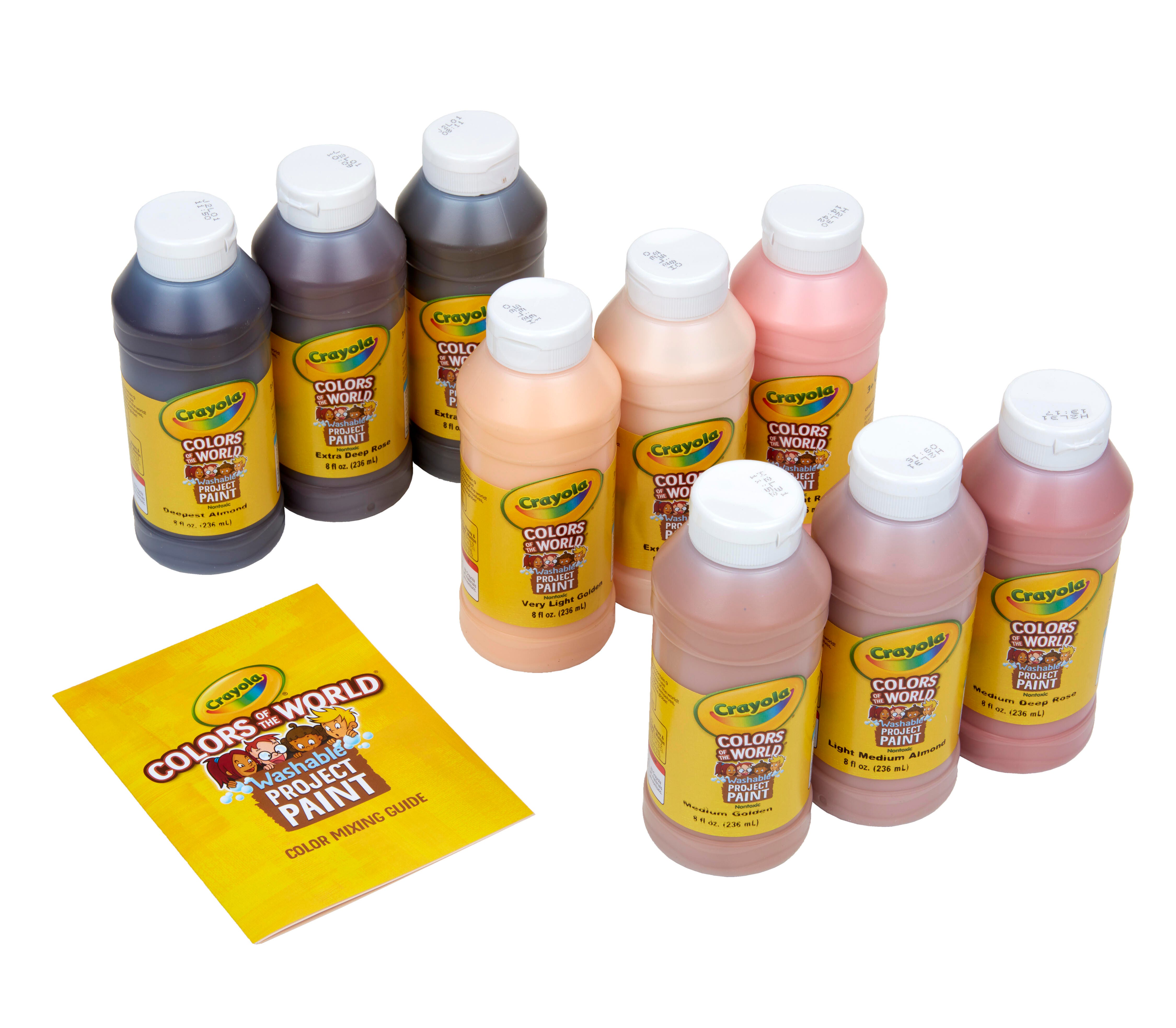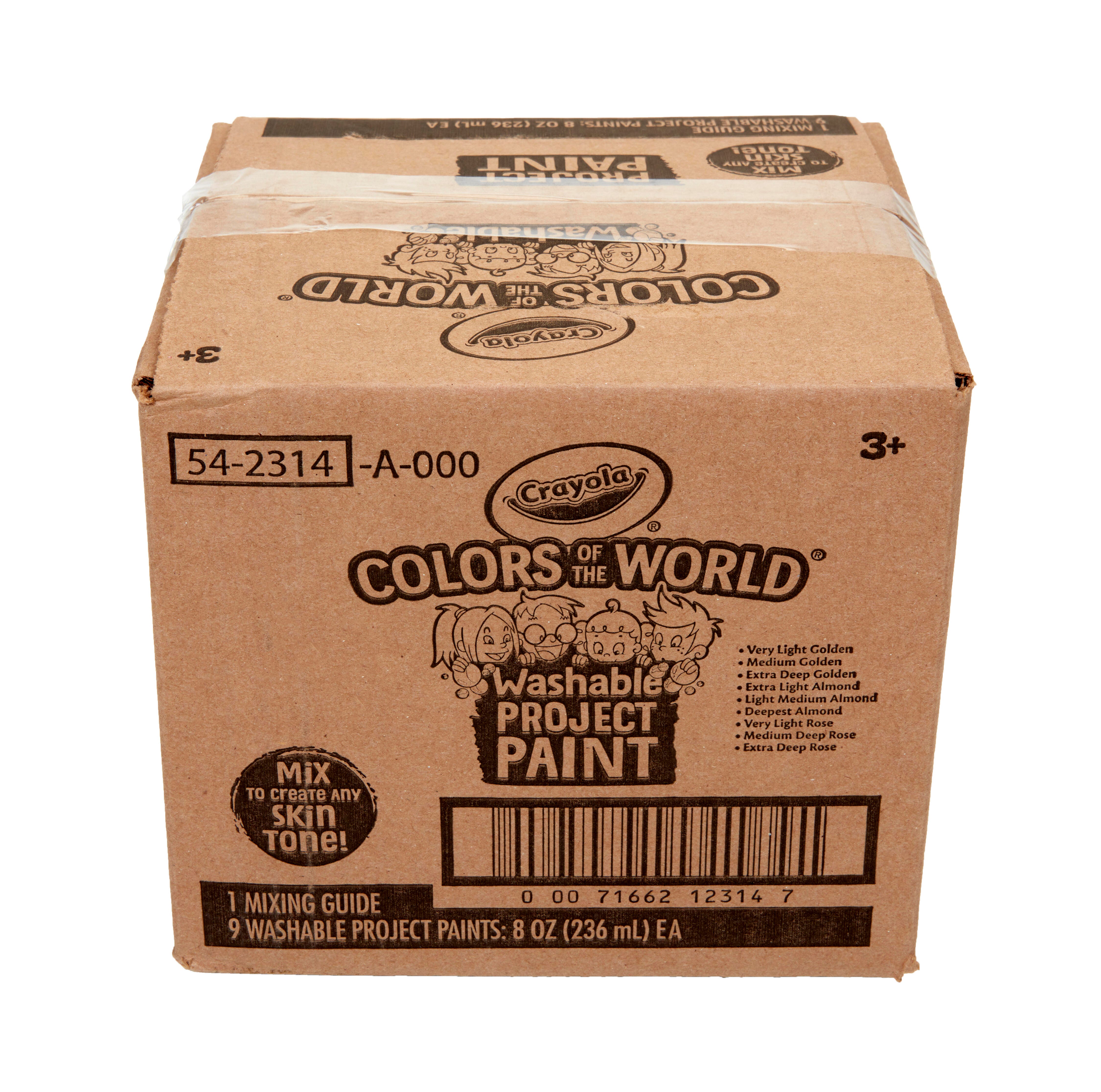 Express your creativity with this Crayola Colors of the World Washable Paint Set. Designed to inspire, this worry-free paint provides hours of fun and cleans up easily. These high-quality skin-tone paints make a great addition to your arts and crafts supplies, making art projects even more detailed and realistic. The subtle shades inside are formulated to better depict the growing diversity worldwide and fall into three main shades: Almond, Golden, and Rose. This set includes 9 bottles (8 ounces each), 1 in each of the following colors: extra light almond, medium deep almond, deepest almond, very light rose, medium deep rose, extra deep rose, very light golden, medium golden, and extra deep golden.