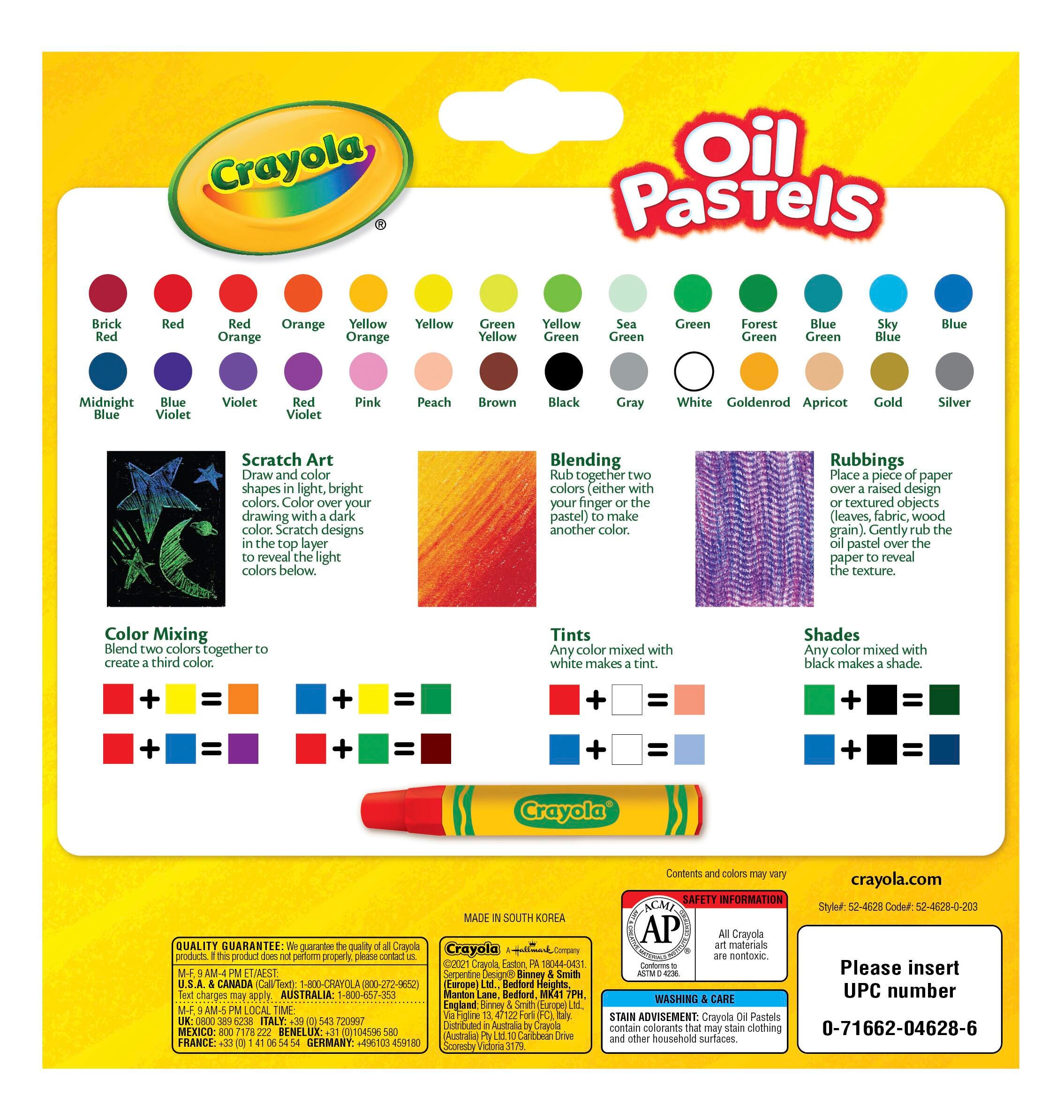 The Crayola Oil Pastels offer rich colors that pop right off the page! This set includes jumbo-sized pastel sticks that are specially designed for children. The unique hexagonal shape stops rolling, so the pastels stay in place to prevent messes and breakage. The smooth formula makes it easy to blend and mix colors to create unique hues. Each stick measures 3 inches long and 7/16 inches in diameter. This set includes 28 pastels in assorted colors.