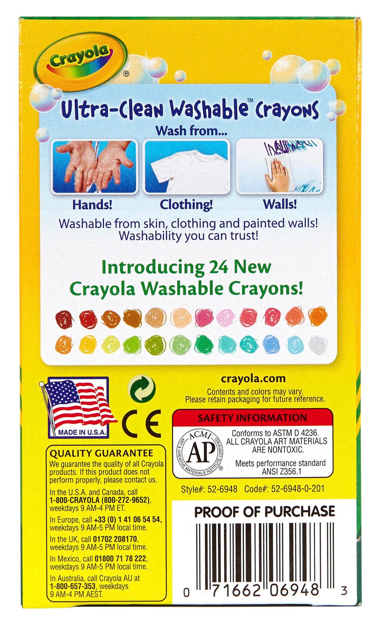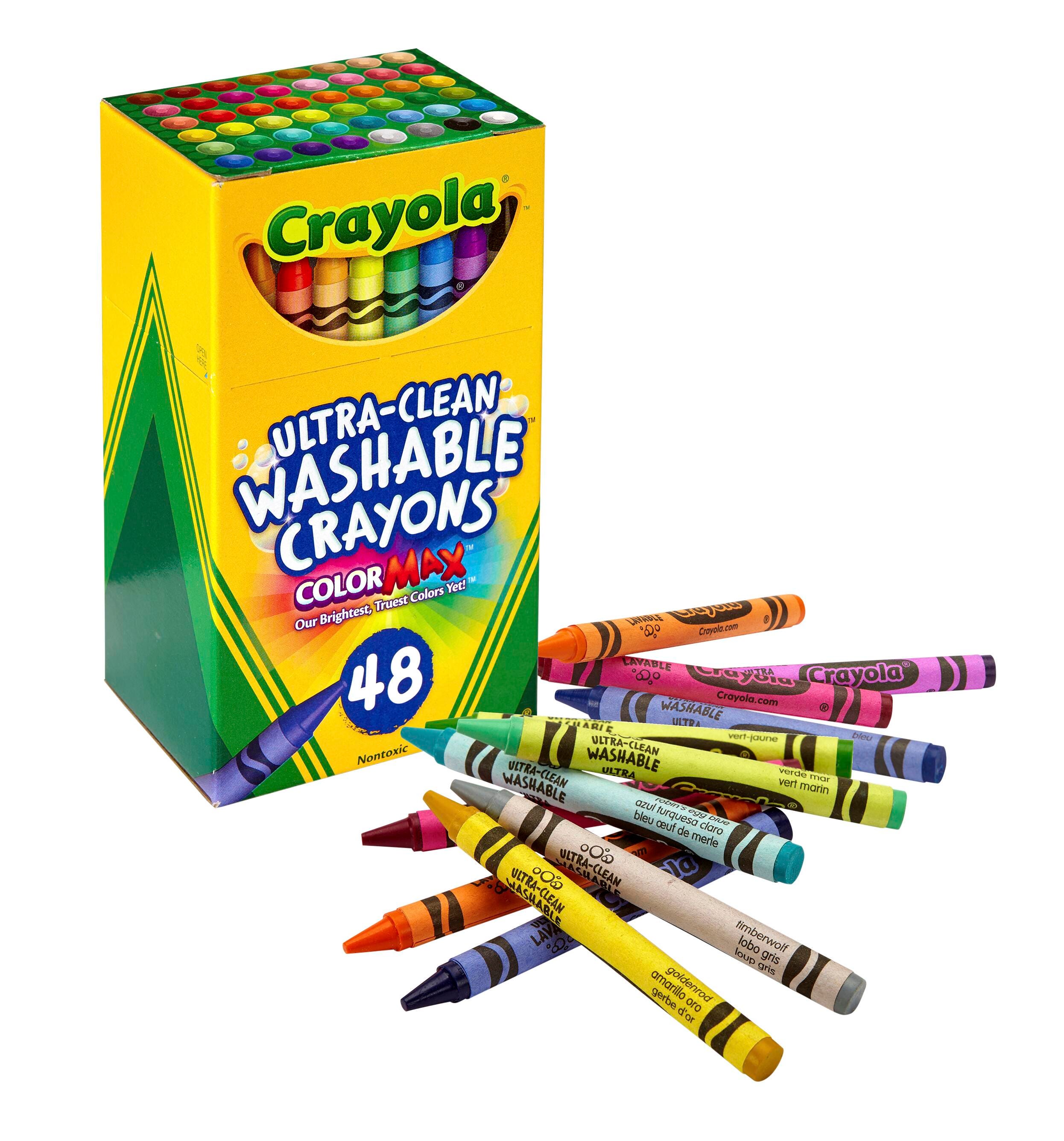 This box of Crayola Ultra-Clean Washable Crayons delivers the classic art tool that students and teachers love, now with improved washability. Specially formulated to wash clean from skin, clothing, and painted walls, these child-friendly crayons provide hours of colorful fun, with vibrant color, smooth lay down, and a durable construction. These crayons also feature Color Max technology to ensure the brightest, truest colors yet. This pack contains 48 crayons in an assortment of colors.Features