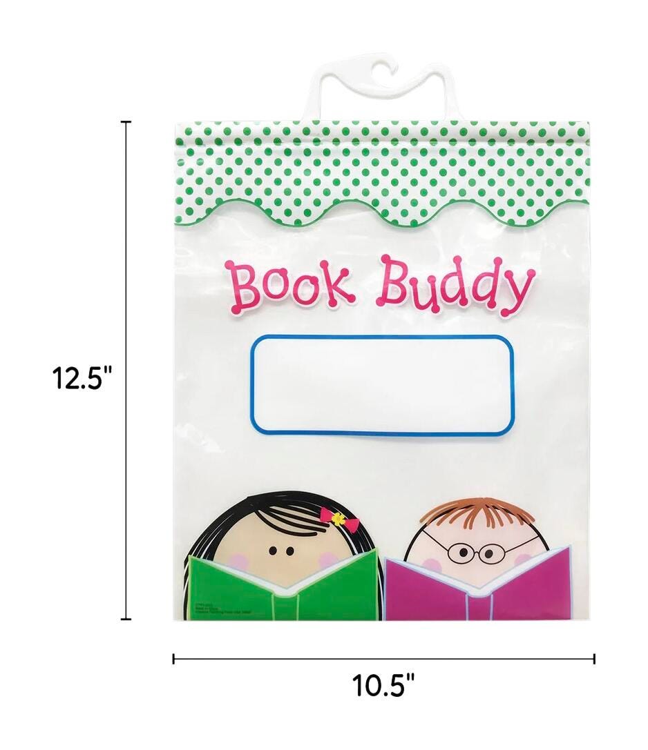 Protect your classroom library with Book Buddy Bags! Send books home with students and get them back in good condition, thanks to these sturdy, clear poly book bags. Each are equipped with snap-shut white plastic handles, a 4-color design on the front, and a place to write a student's name or to label the bag's contents. Each bag measures 10-1/2 x 12-1/2 inches. Sold as 6 bags per pack. Coordinates with other Stick Kids products.Features