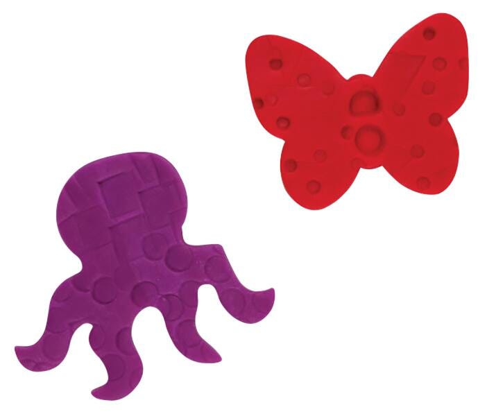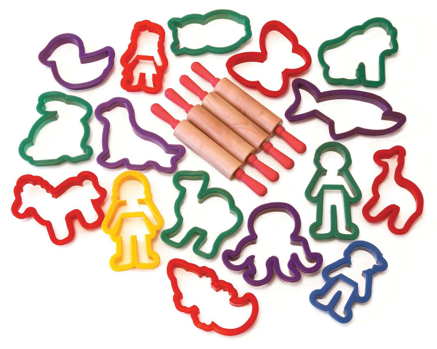 The ideal set for low-cost, high-interest classroom creativity. Includes one rolling pin and 10 large, 4" cutters. Designs include elephant, dinosaur, pig, duck, teddy bear, dog, airplane, sailboat, and foot and hand.Includes: