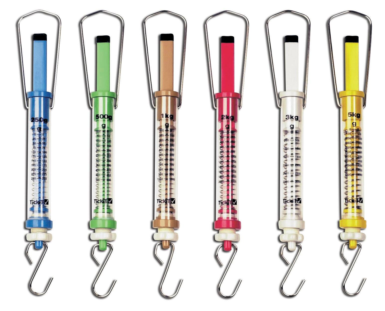 Delta Education Push-Pull Type Spring Scale Set of 6 includes 250 grams, 500 grams, 1 kilogram, 2 kilograms, 3 kilograms and 5 kilograms capacity scales. Spring Scale is calibrated in grams, is color coded and has a clear flat area on the rod so that you can create your own scales using a dry erase marker. The uniquely designed force meter balance efficiently weighs suspended objects and also measures the force of pushing or pulling on an object.