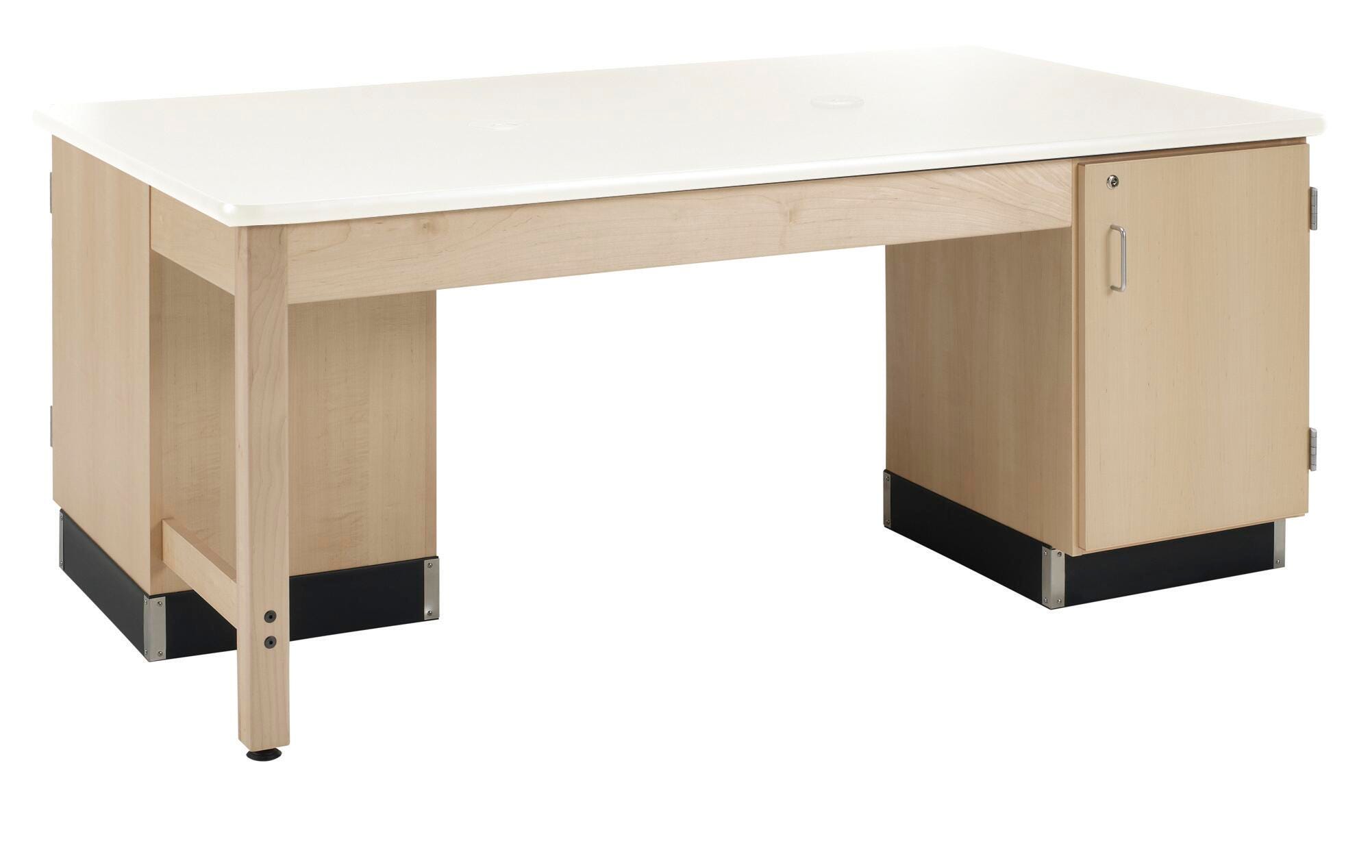 The Diversified Woodcrafts sewing table is a complete storage solution for sewing, quilting, and crafting projects. Crafted with a solid maple frame and a plastic laminate top, this table has a smooth and spacious work surface. The maple is finished with an earth-friendly UV finish. The locking storage cabinet features a pullout shelf on full extending glides for easy storage of a sewing machine when not in use. The dual student unit with one grommet measures 72 x 42 x 30-1/4 inches. Top color: Almond.