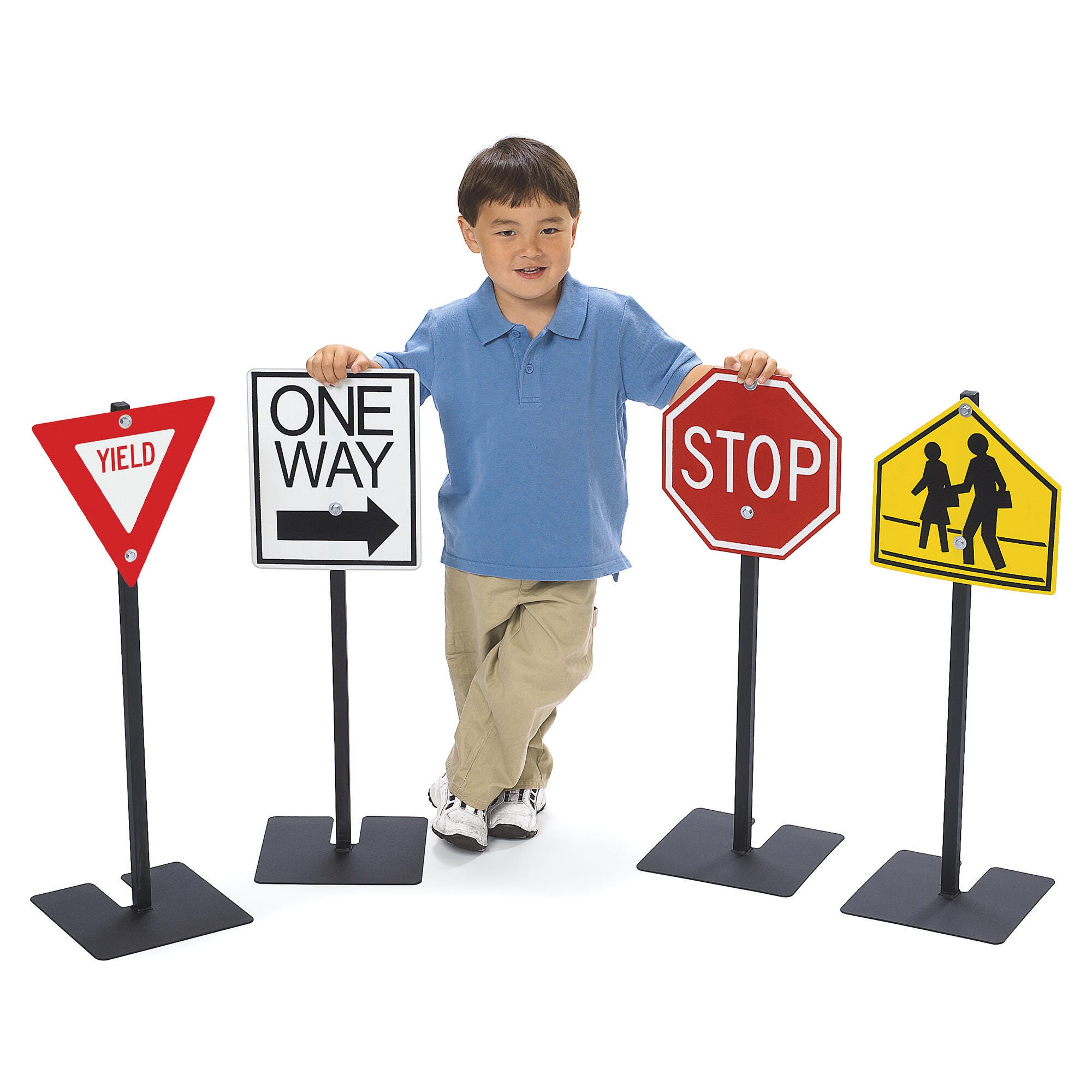 Description Create a realistic roadway for young riders and teach road safety with our Traffic Signs! These signs are designed to be used outdoor with their weatherproof design, made no-tip to withstand even the windiest days. The road signs for children are made of sturdy, weatherproof plastic, designed for outdoor use at preschools, daycare centers, and playhouses. Each sign measures 11 L x 11 D x 29 H inches each.Features Learn through play with signs designed to mimic those found on the road Made with durable weatherproof plastic to last for years of playground use Realistic design provides a more lifelike roleplay and interactive play experience Each traffic sign features wide, metal bases to stabilize the sign during most weather conditions, a no-tip design 1 Year warranty provided by manufacturer Includes: 1 Yield 1 One Way 1 Stop 1 Pedestrian Crossing