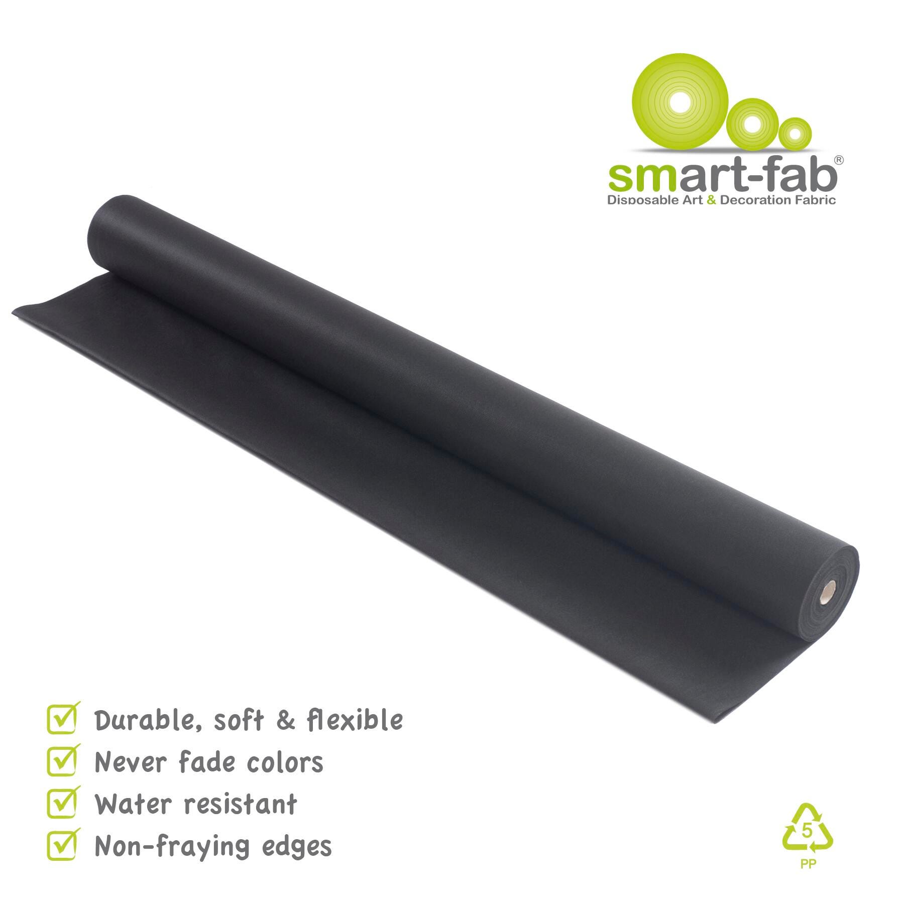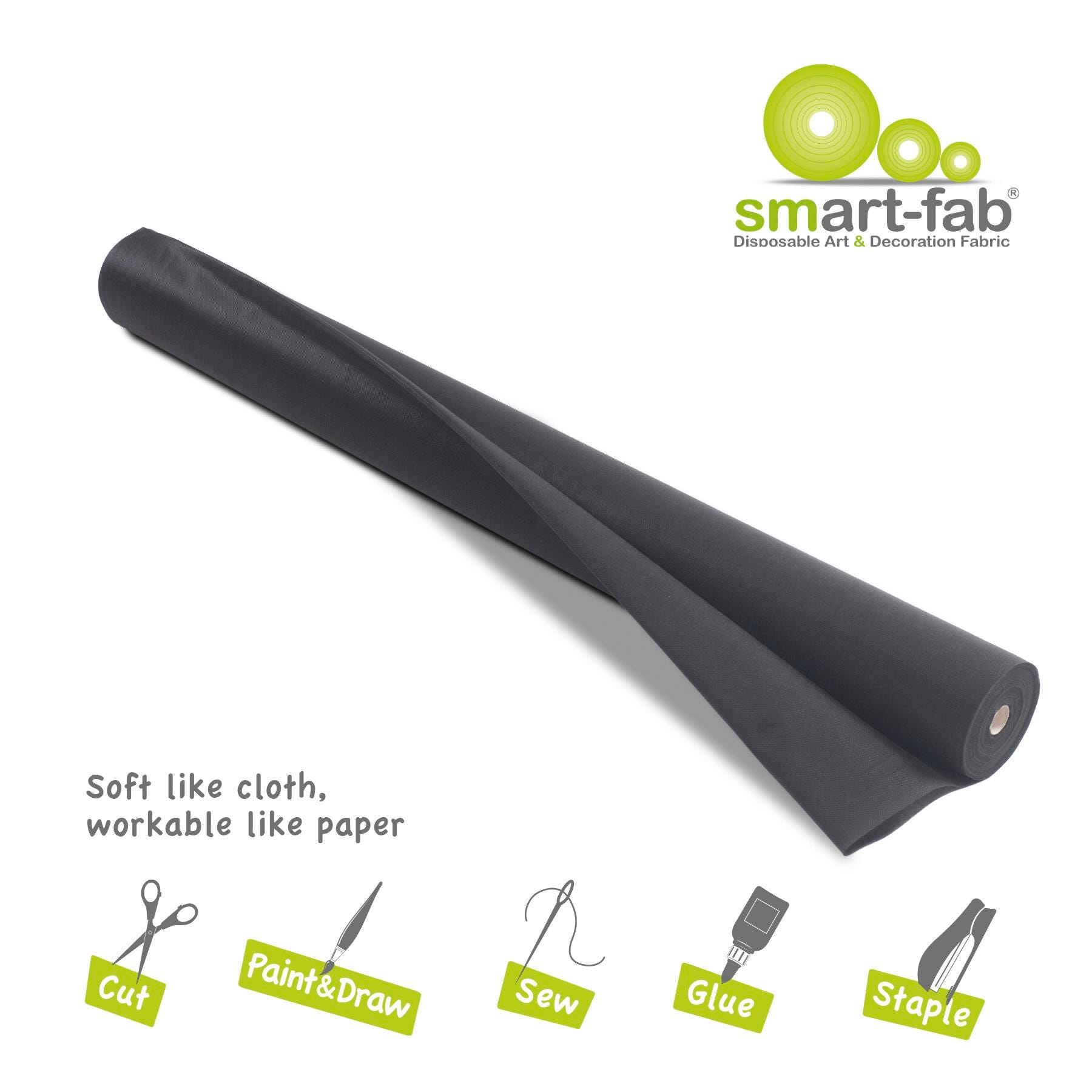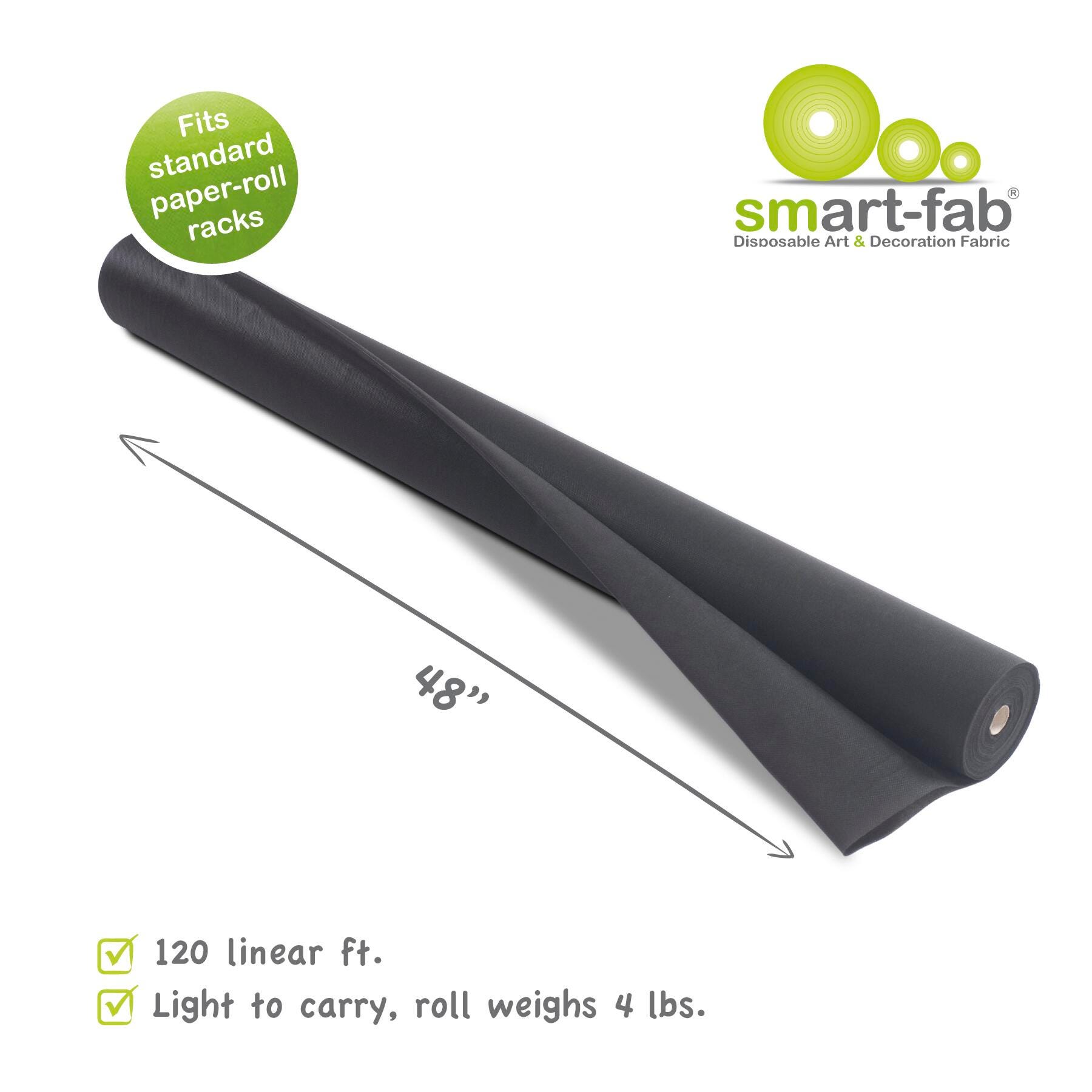 Smart-Fab Non-Woven Fabric Roll measuring 48 in x 120 ft in black is an innovative artistic and educational medium. It's bold, brilliant colors are in the material itself, so they won't fade and look great from either side. Soft and pliable yet strong and durable, smart-fab won't rip, fray or wear out, yet it's easy to cut, fold, twist, crimp, ruffle and glue. The cloth-like texture makes it pleasant to handle, yet firm enough to be used in 3-D creations and it is great for outdoor use. It is water and wear resistant but can be easily colored with paints, crayons, markers and all popular art media. Roll is also convenient to store, supplied in rolls that fit standard paper roll racks.