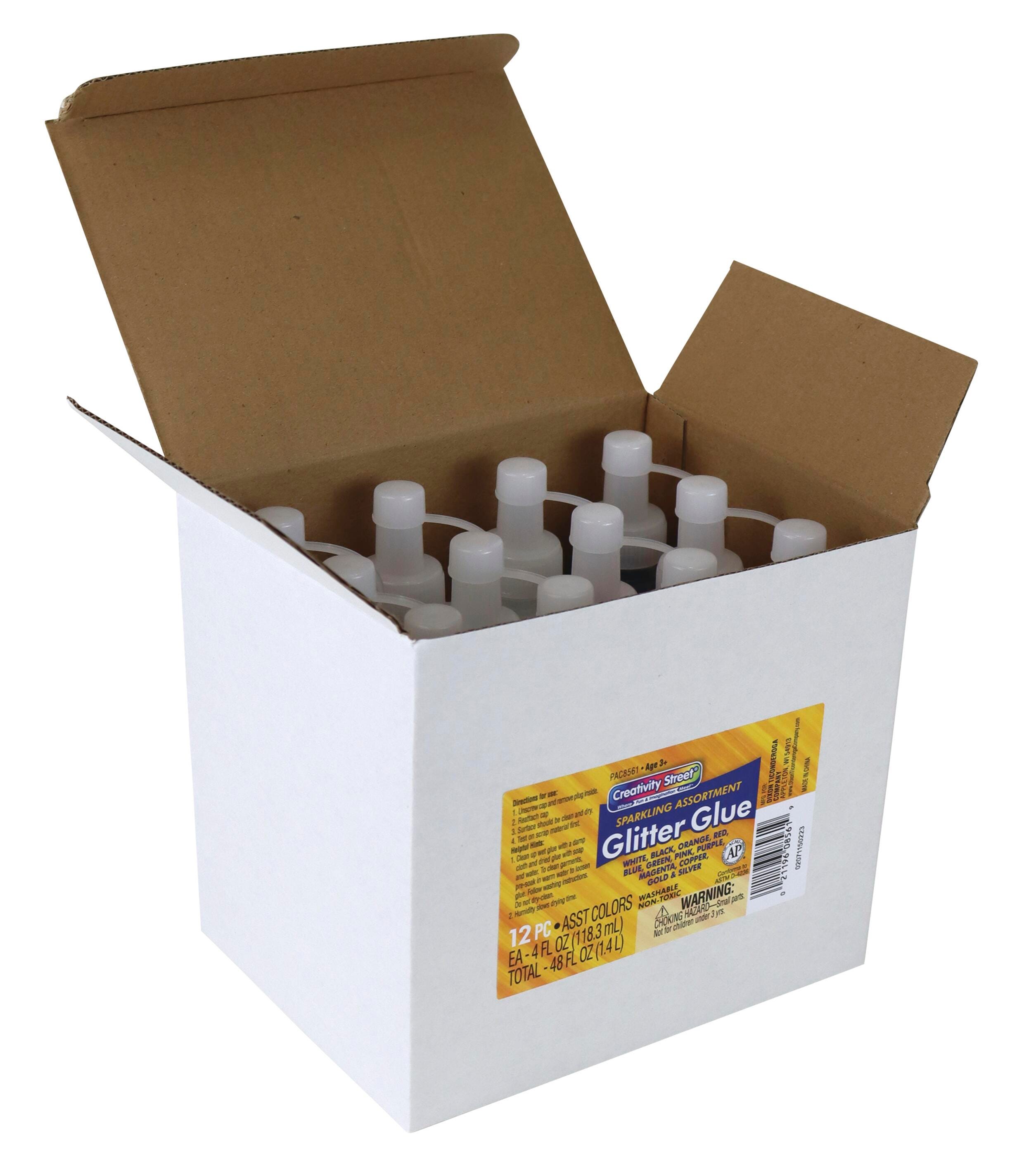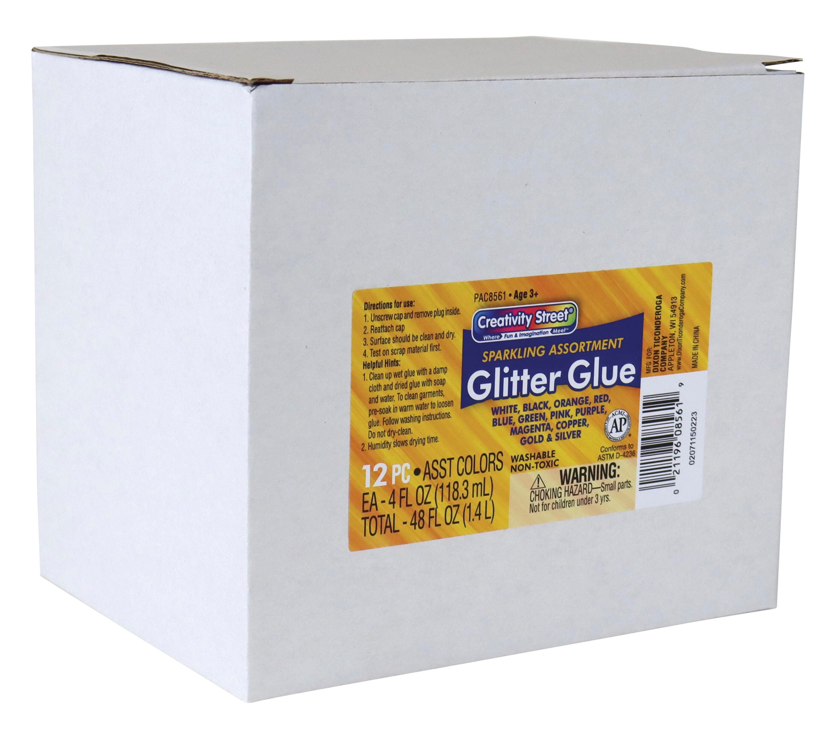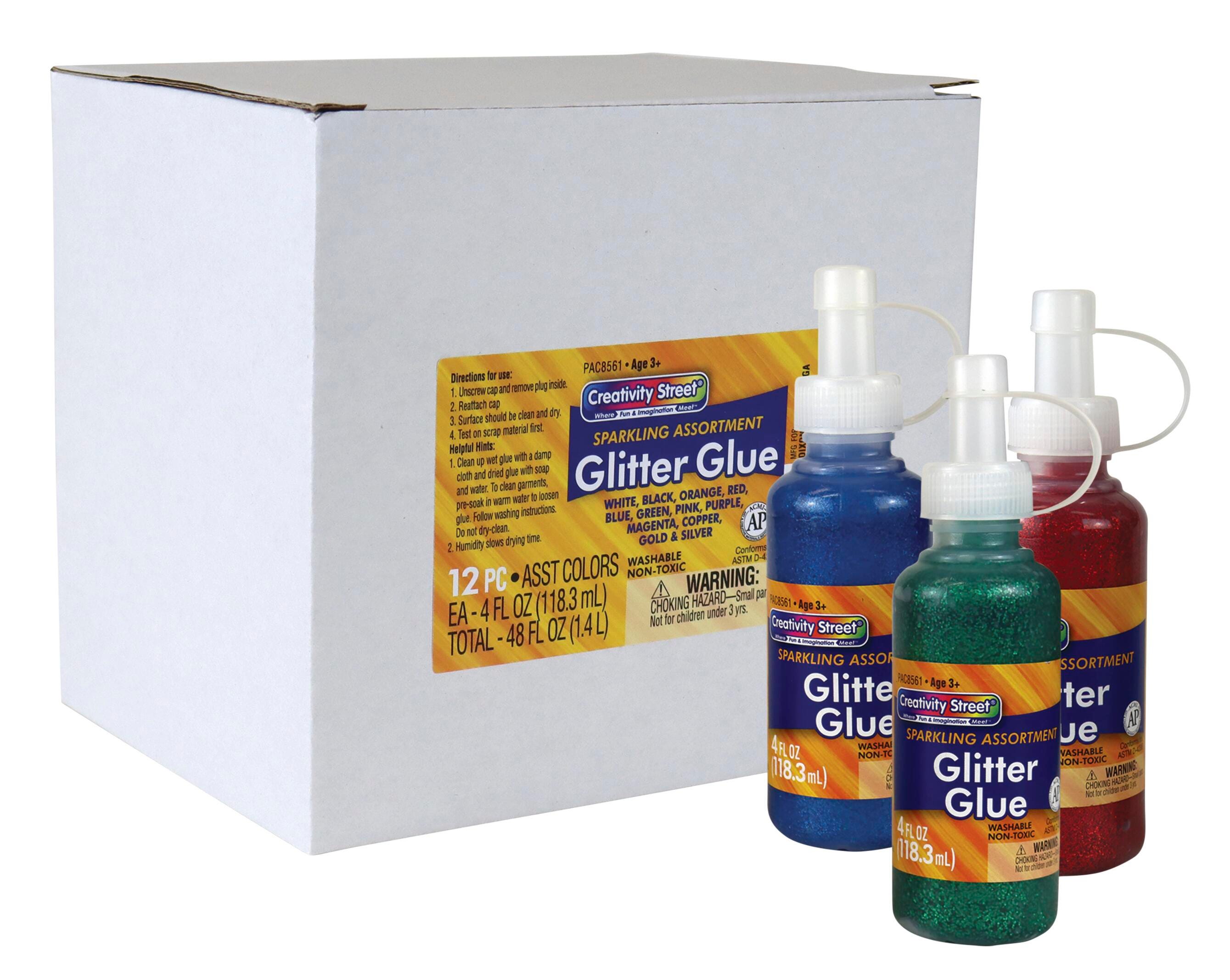 Description Creativity Street Washable Glitter Glue in 4 ounce bottle is a fun and easy way to add sparkling for variety of art projects including greeting cards, signs, posters and more. Glue rinses from skin and most machine-washable clothing. Glue in white, black, orange, red, blue, green, pink, magenta, purple, copper, gold and silver is sold as 12 per pack.Features Sparkling glitter glue allows students to get creative Vibrant colors will thrill young learners Washable design for less mess Includes: 12 Bottles of Glitter Glue