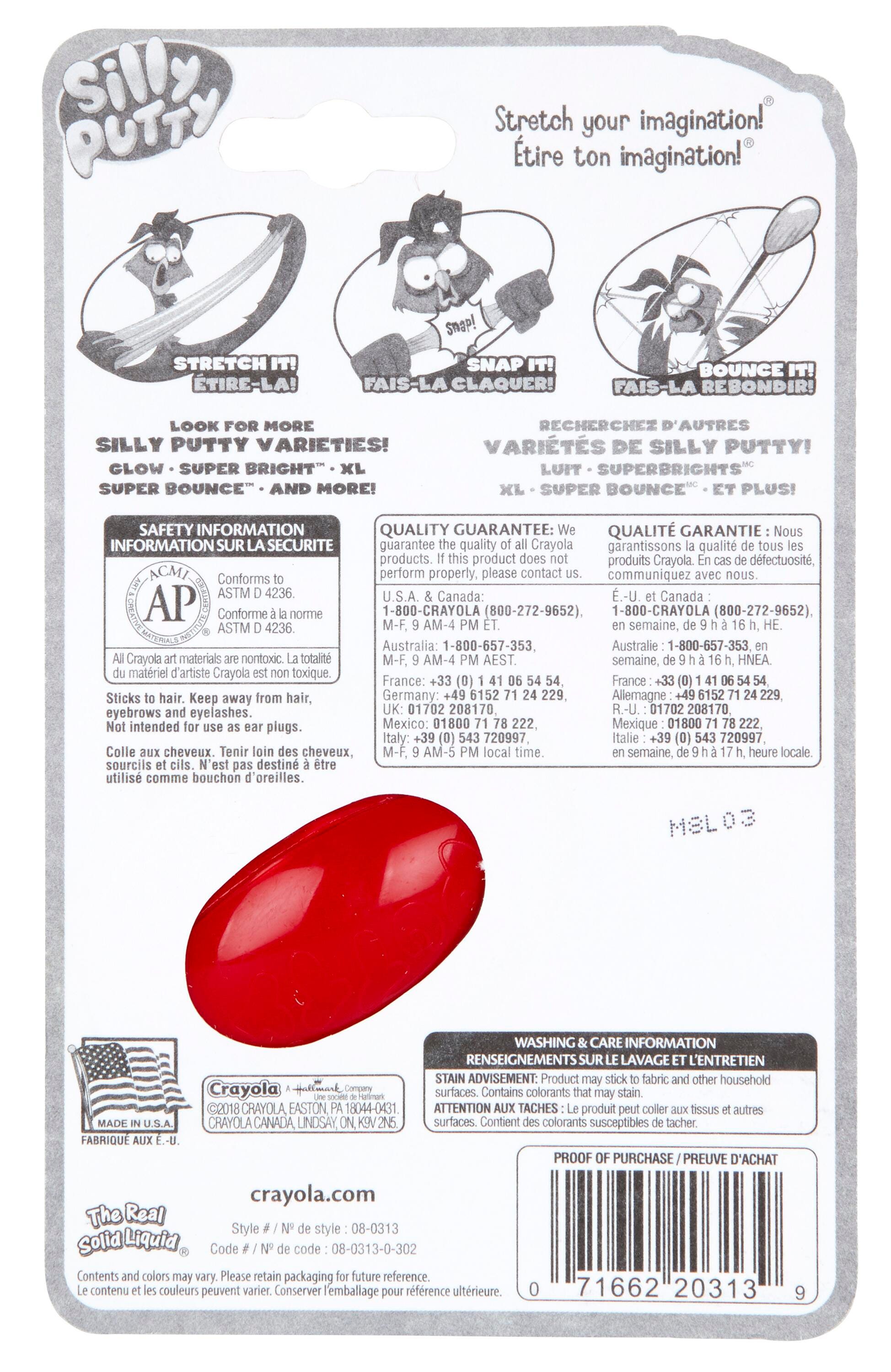 Description Discover endless fun with this variety pack of Crayola Silly Putty. This egg contains pliable putty that provides an engaging tactile experience, making it perfect for sensory play. Silly Putty is celebrated by generations for its ability to bounce, mold, snap, and stretch. It’s an excellent, and accessible, fidget that requires no hand-eye coordination. Whether you’re molding it into your favorite shapes, bouncing it off the walls, or simply squeezing it in your hands, you can discover countless ways to play.Features Children can stretch, compress, and mold Silly putty into fun shapes Putty does not dry out or crumble for mess-free fun and reuse Can help develop fine motor skills and encourages imagination Egg-shaped containers hold putty inside for easy storage AP certified non-toxic for safe use in the classroom, recreational center, childcare center, or home Recommended for ages 4 and up Includes: 1 Container of Silly Putty