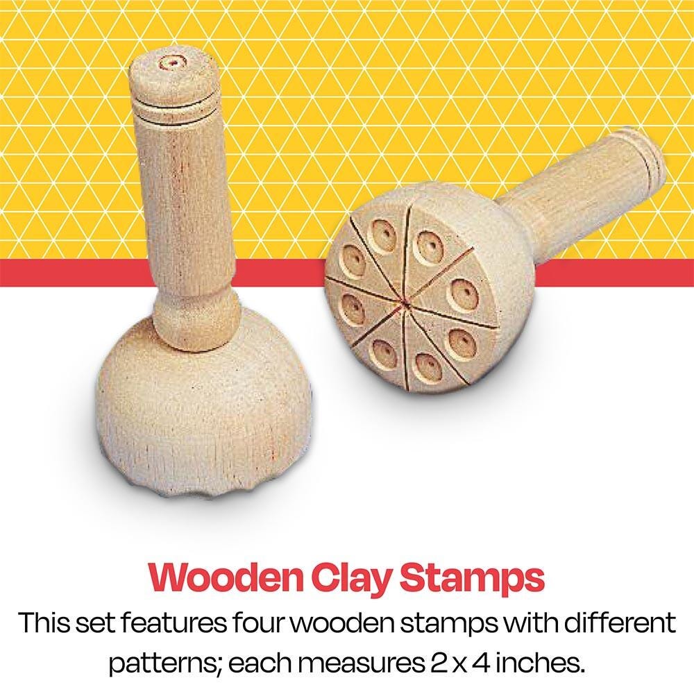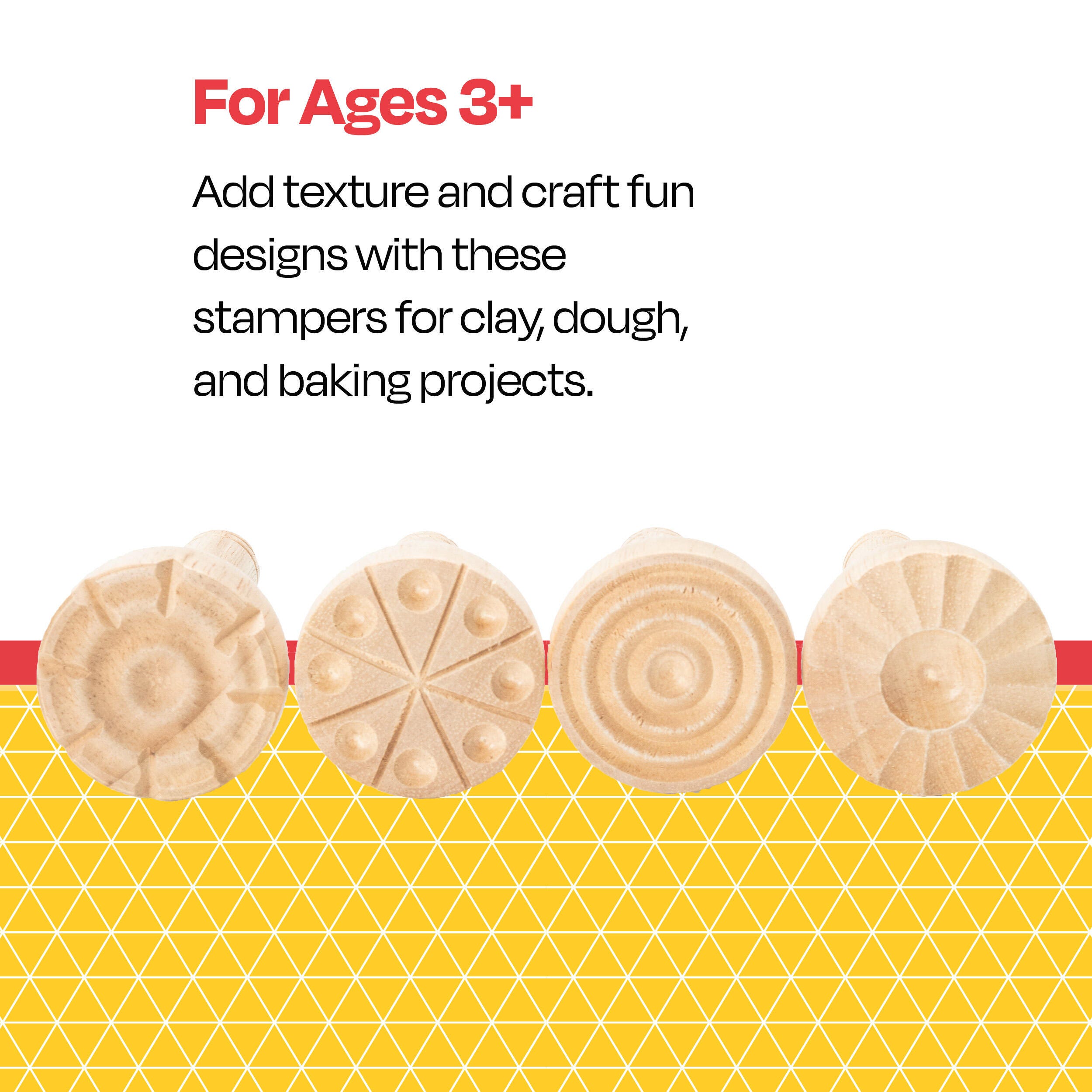 Description Great for classroom or home use, the School Smart wooden clay stamps come in four different patterns. Appropriate for kids and adults (ages 3+), the robust wooden stamp set is perfect for crafting with modeling clay and dough during playtime or making cookies in the kitchen. Each clay stamper measures 2 x 4 inches, and the small stamps are easy for small hands to manipulate.Features Our textured stamps for clay can be used by children and adults (for ages 3 and up) The wood stamps have no sharp edges to help protect little hands Use the carved wooden stamps for clay, crafting dough, and cookie dough Assorted fun designs add a new dimension to your little one's modeling clay creations