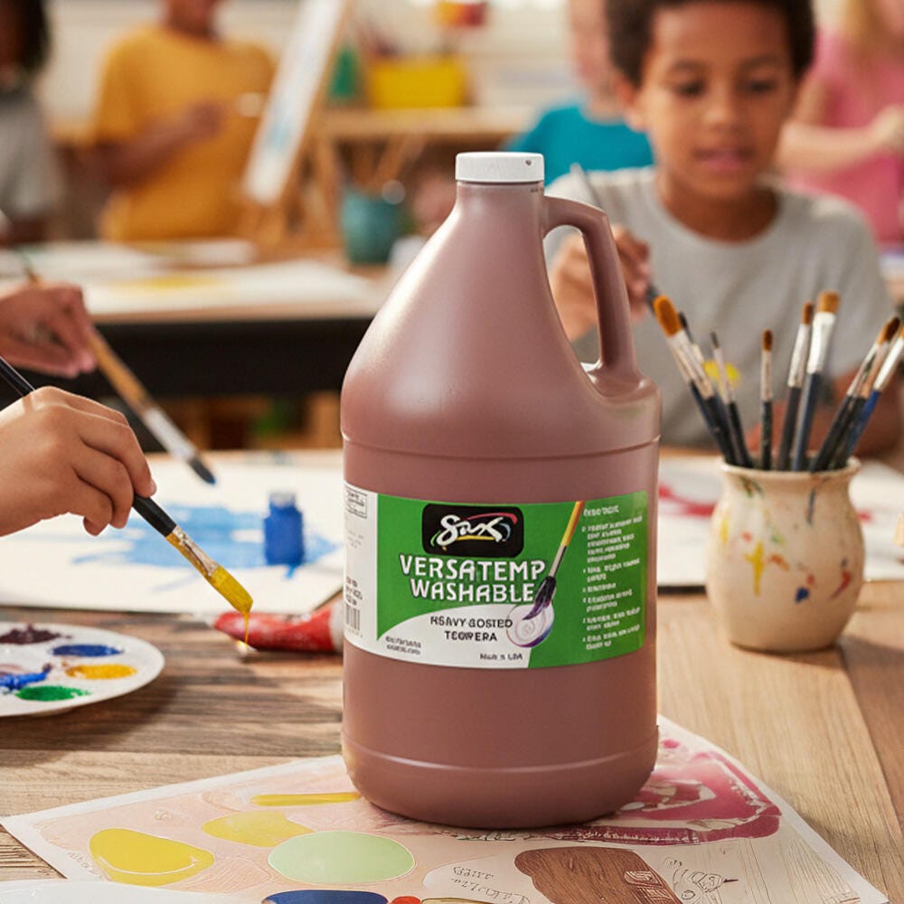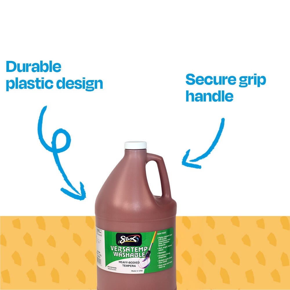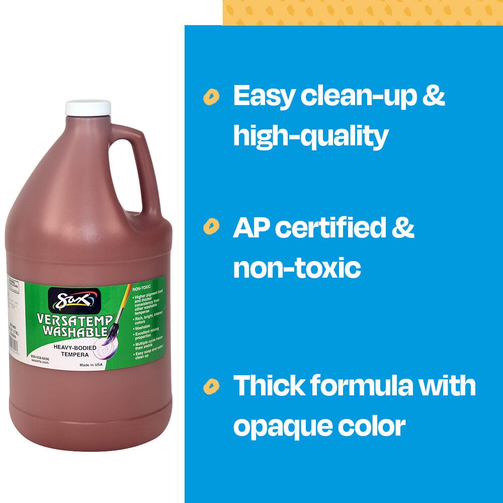 Sax Versatemp washable heavy-bodied tempera paint in a brown color crafts bold, vibrant color with a mess-free formula. Foster creativity with a paint that enables more fun and easier cleaning for children and adults. While most kid-friendly formulas lack pigment strength, our formula provides a stronger pigment load with a heavy, creamy consistency. This painting medium comes in a large gallon bottle for effortless handling, pouring, storing, and sharing in the classroom. Complete school projects, art lessons, and signs with one shade or create new hues by mixing and matching colors.