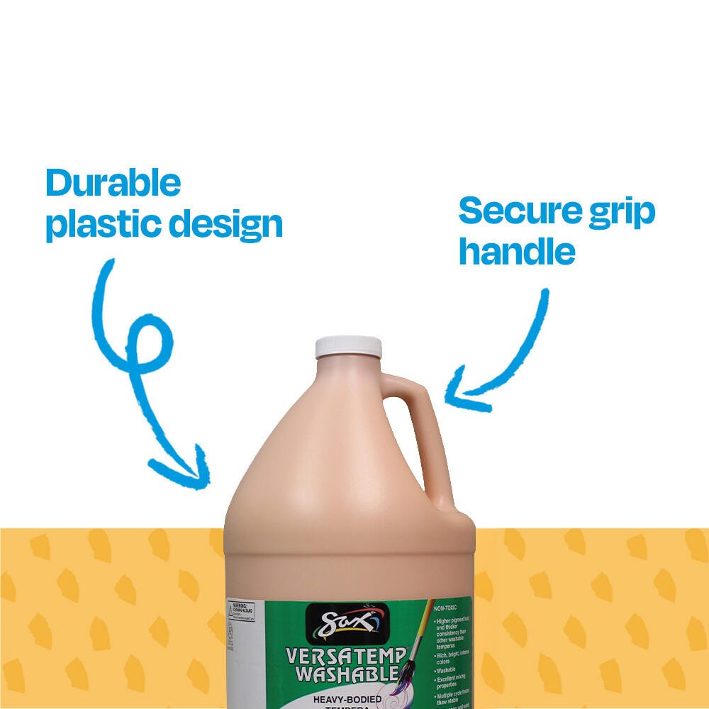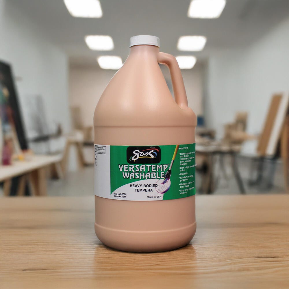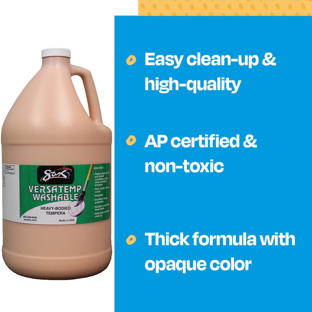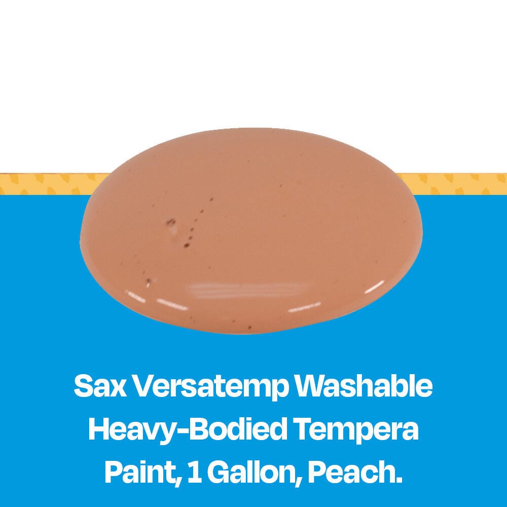 Description Sax Versatemp washable heavy-bodied tempera paint in a peach color crafts bold, vibrant color with a mess-free formula. Foster creativity with a paint that enables more fun and easier cleaning for children and adults. While most kid-friendly formulas lack pigment strength, our formula provides a stronger pigment load with a heavy, creamy consistency. This painting medium comes in a large gallon bottle for effortless handling, pouring, storing, and sharing in the classroom. Complete school projects, art lessons, and signs with one shade or create new hues by mixing and matching colors.