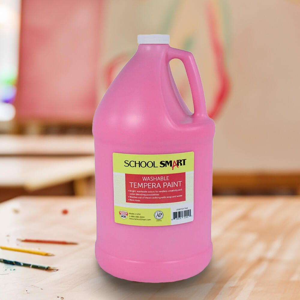 Description The School Smart washable tempera paint gallon comes in a pink color. This large bottle of pink tempera paint is great for classrooms, schools, art classes, and after school programs. The brilliant and rich opaque paint color offers students endless creativity and color blending possibilities. Our non-toxic tempera paint cleans up easily with soap and water and won’t chip, flake, or crack when dry.