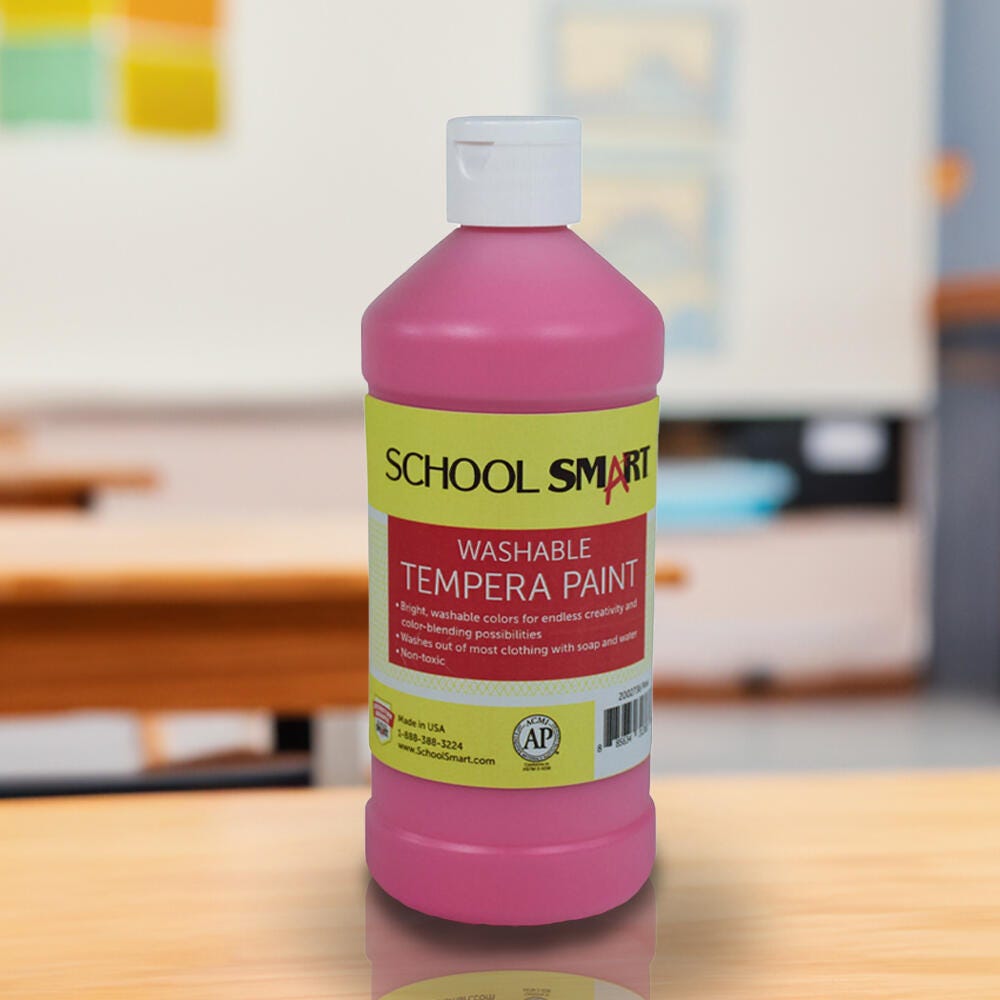 Description The School Smart washable tempera paint comes in a pink color. This bottle of pink tempera paint is great for classrooms, schools, art classes, and after school programs. The brilliant and rich opaque paint color offers students endless creativity and color blending possibilities. Our non-toxic tempera paint cleans up easily with soap and water and won't chip, flake, or crack when dry.
