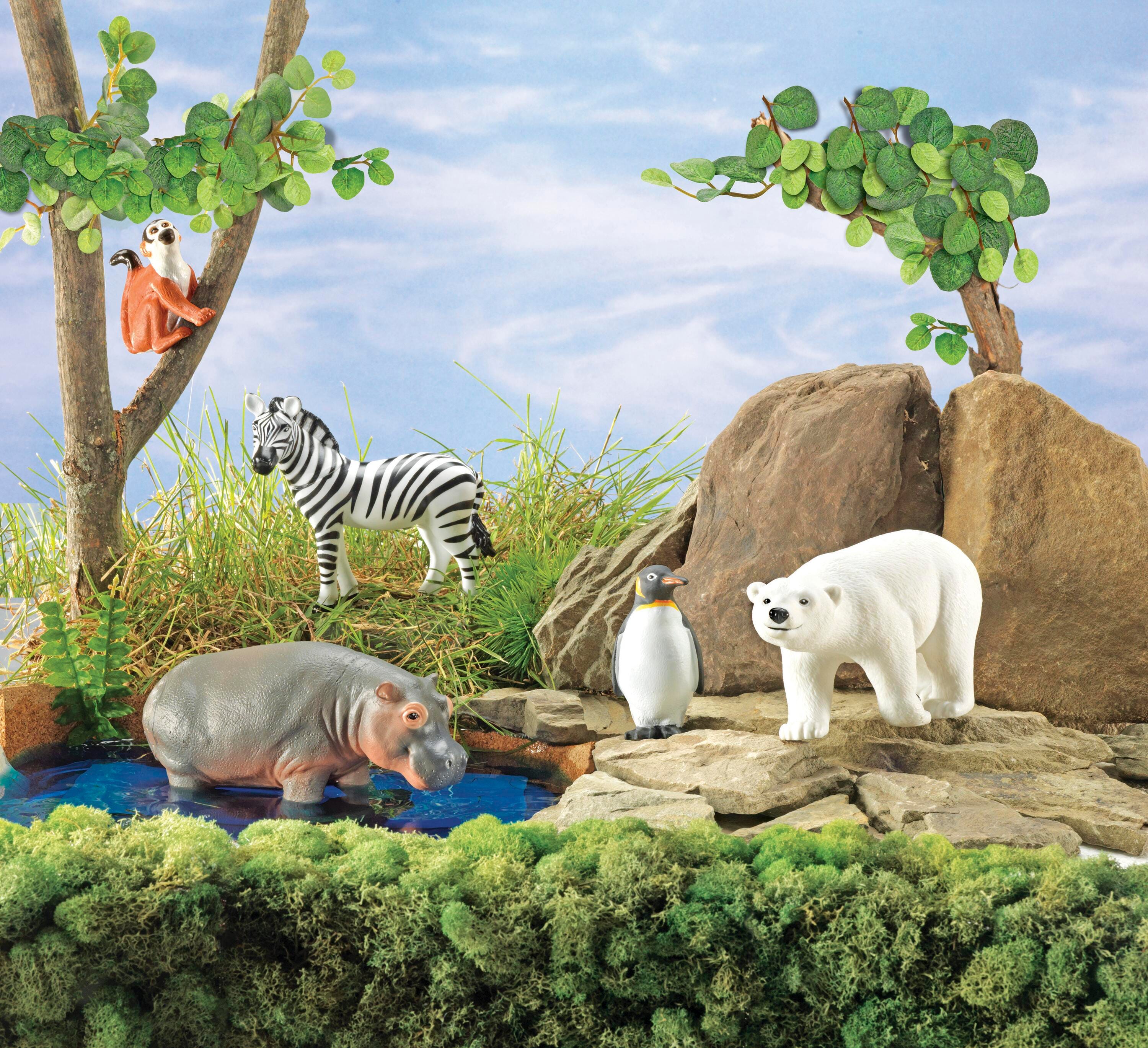 • Polar bear, hippo, penguin, monkey, and zebra figures can also serve as discussions about endangered species and tips on how to preserve and protect wildlife