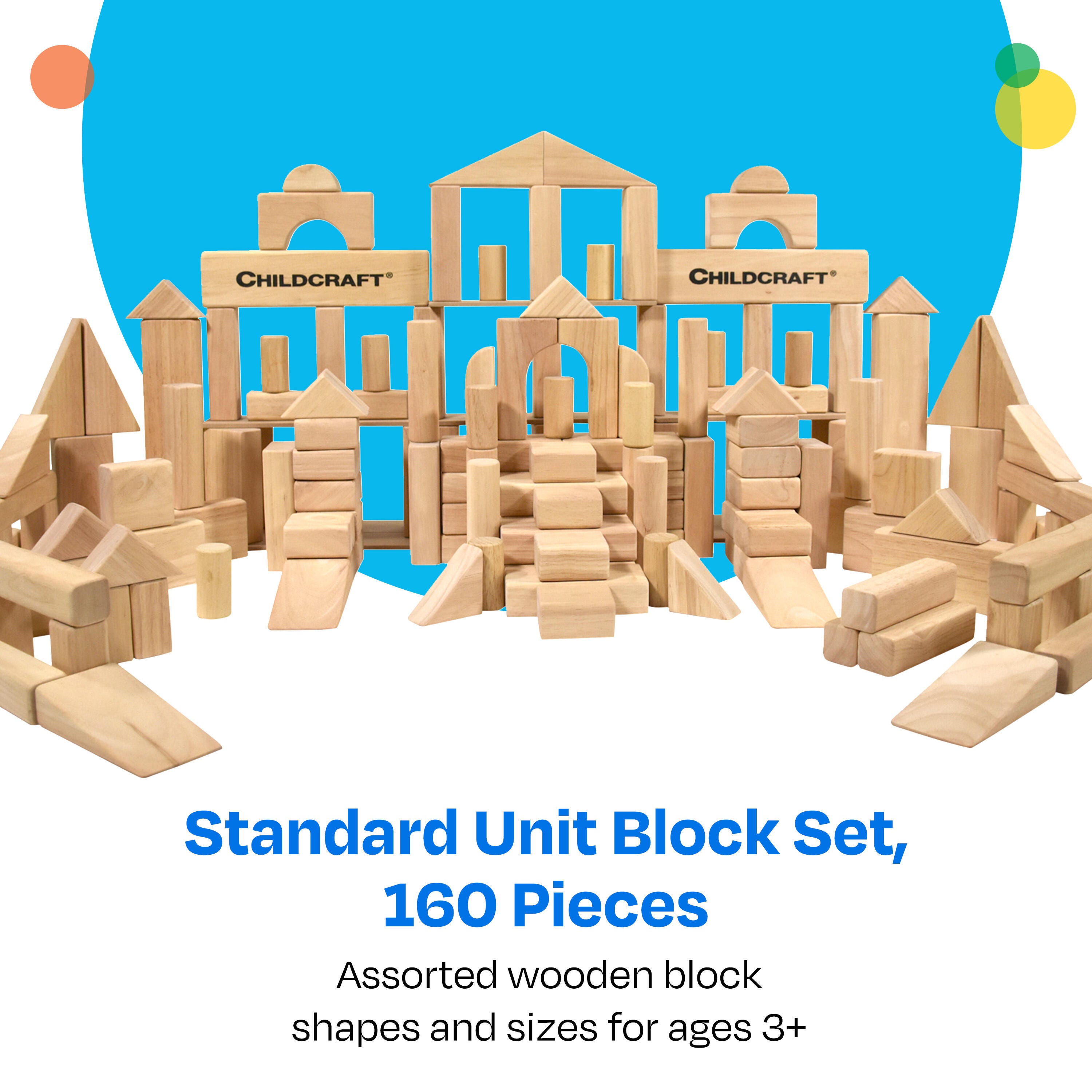 Childcraft® Standard Unit Blocks are an essential tool for early learning and play. Designed for ages 3 and up, this wooden block set includes 160 smooth-sanded, natural hardwood blocks in a variety of shapes and sizes. These durable blocks are perfect for open-ended, screen-free play to help children develop creativity, gross motor skills, and hand-eye coordination. They’re also great for early math concepts like shapes, counting, and parts-to-whole relationships. Backed by our limited guarantee, these wooden play blocks are built to last through years of learning and fun.