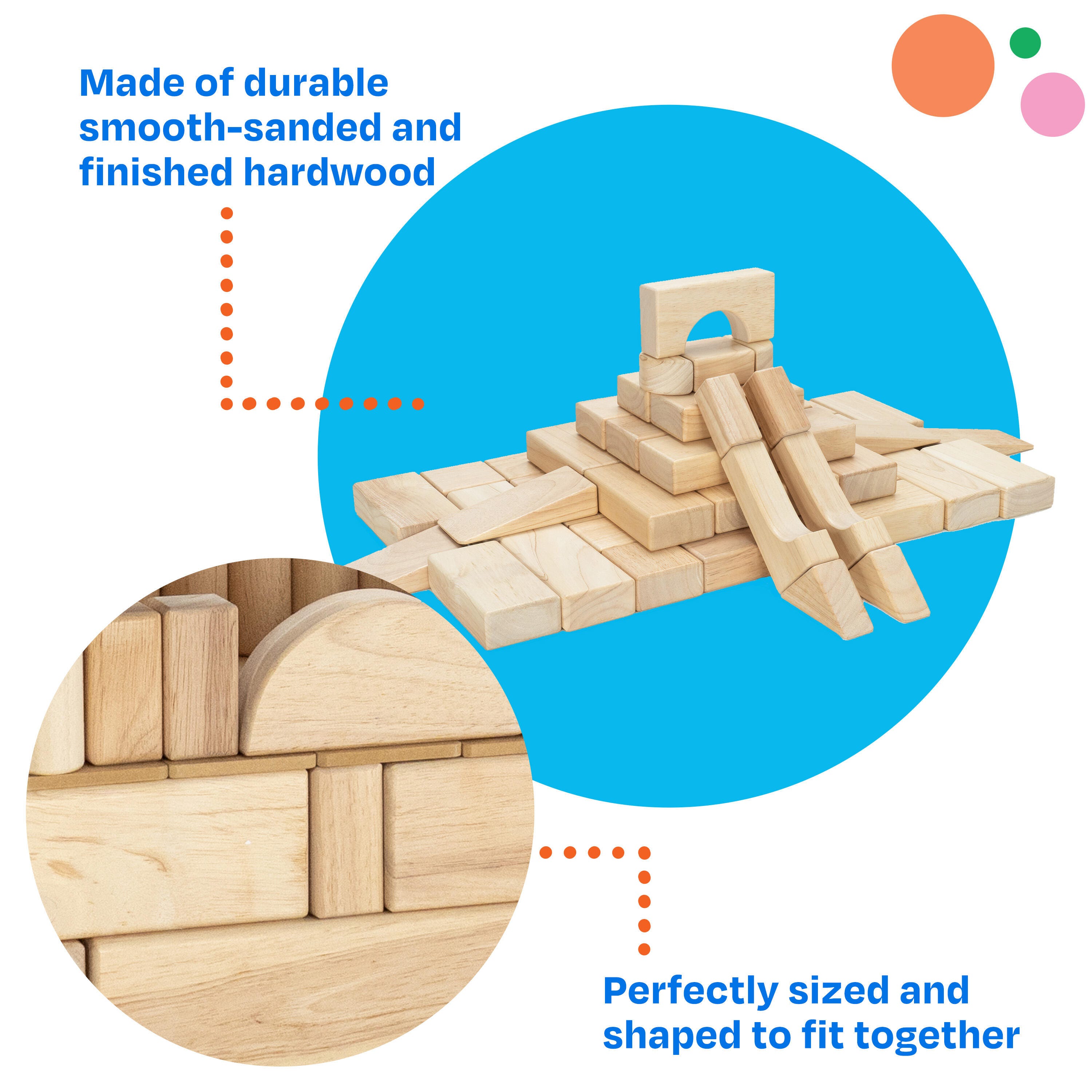 • Use children's wooden blocks for hands-on learning while promoting creativity, gross motor skills, hand-eye coordination, and early math concepts