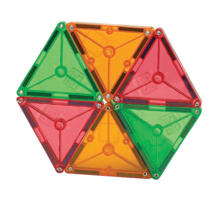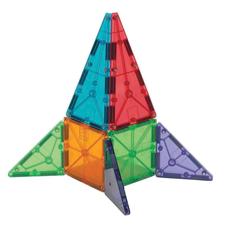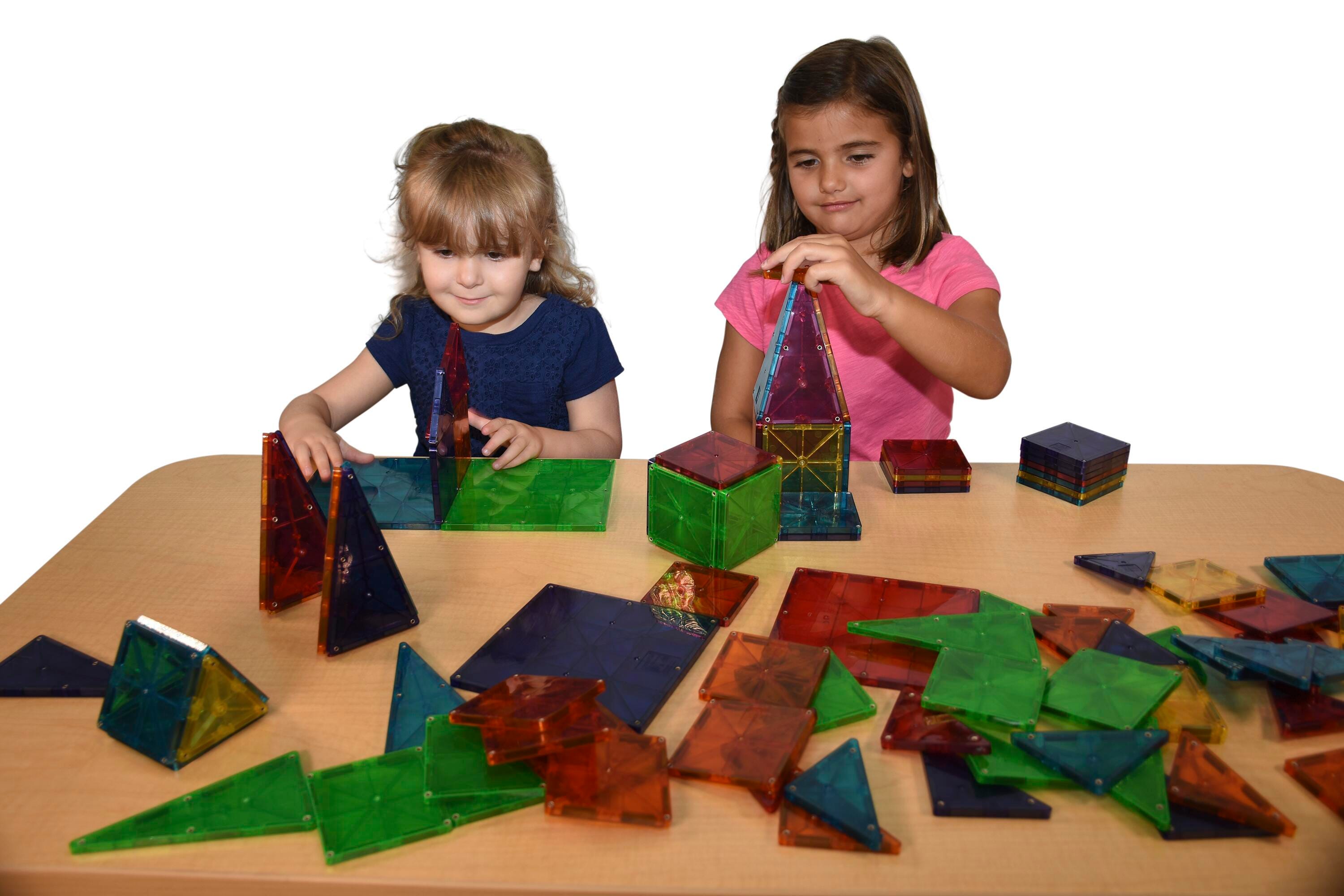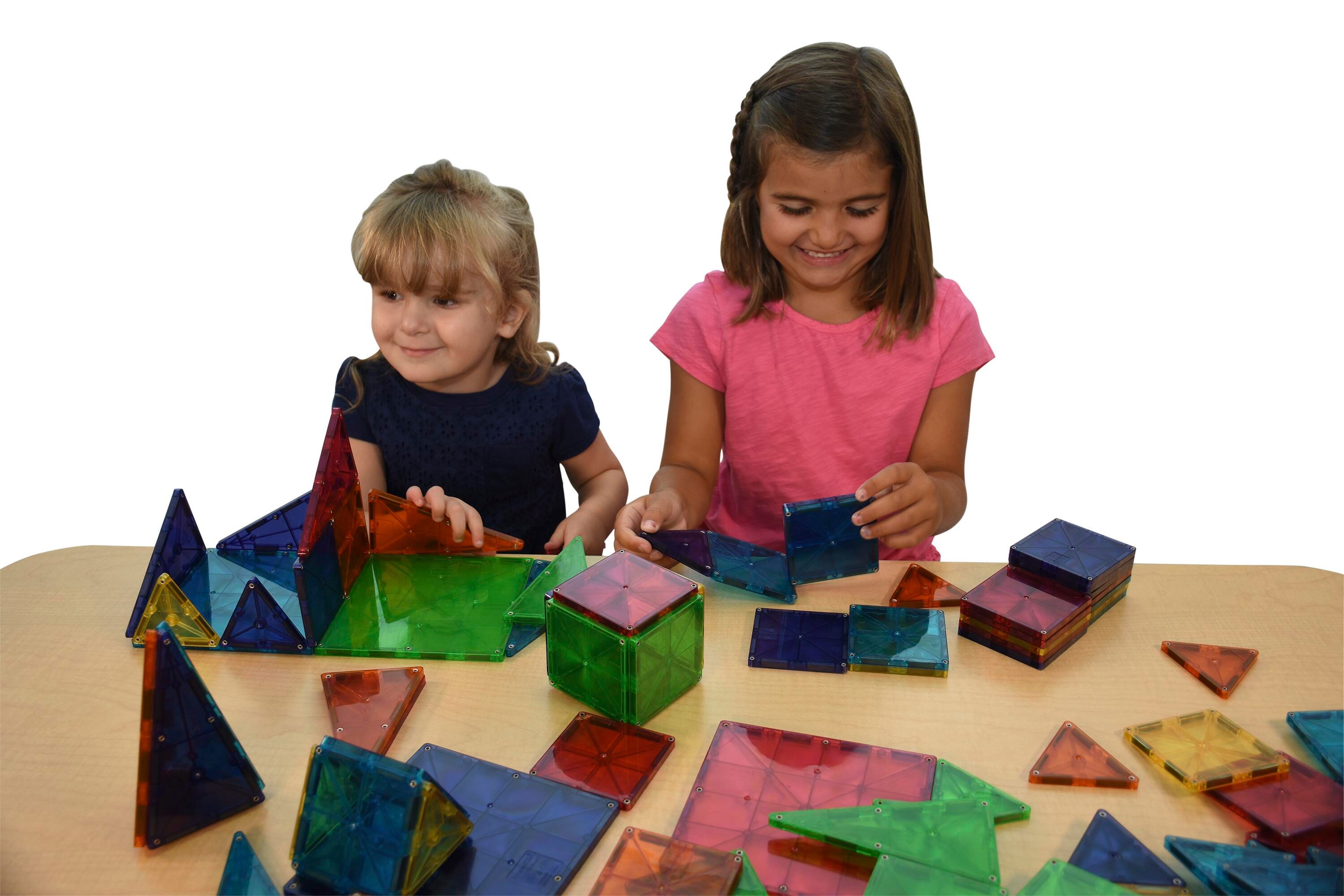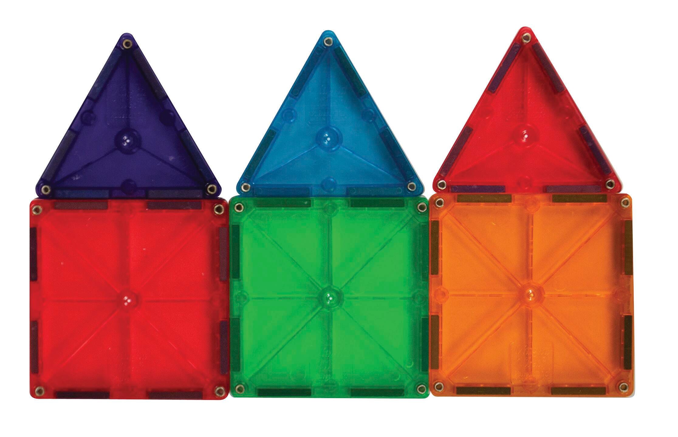 Description Magna-Tiles 3-D Magnetic Building Tiles are where math, science, and creativity meet. Each brightly colored, translucent shape is lined with magnets. The secret is the unique ability to attract; they always connect! Children develop fine motor skills and become familiar with shapes as they stack, make flat patterns, and build 3-D shapes and structures. Translucent Colors. Each shape measures approximately 3 inches. Ages 3 and up.Features The original 3-D magnetic building and design tile Build 3-D designs with magnets that always connect Ideal for early STEM learning Includes: 50 Small Squares 4 Large Squares 20 Equilateral Triangles 11 Right Triangles 15 Isosceles Triangles