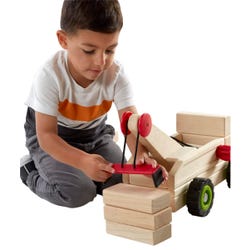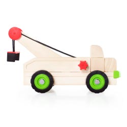 - Large wooden toy tow truck with plastic parts teaches children about simple machines like wheels and axles When a child rotates the handles in the front of the truck bed, the attached Unit Blocks (sold separately) can be raised and then lowered