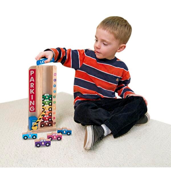 Little ones aged 3 and up can stack up to 10 wooden cars in this gated parking tower and top them with the sliding counter. Then see the cars drop down and the counterpoint to a lower number each time a car is removed from the bottom. With its imaginative design details and wonderfully simple mechanics, this clever set is a captivating, educational way to play with sorting, matching, counting, and more.