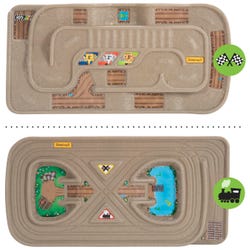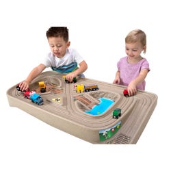 Kids can take the play anywhere with the portable Carry & Go Road to Rail Table. Race up hills, down valleys, through deep puddles, around curves, and over mounds! Track table flips for double-sided play, offering limitless adventures for children’s train, cars and construction vehicles. Easy to store when not in use. Measures 35-3/8 x 17-3/4 x 3-7/8 Inches. Appropriate for ages 3 years and up. Comes fully assembled.