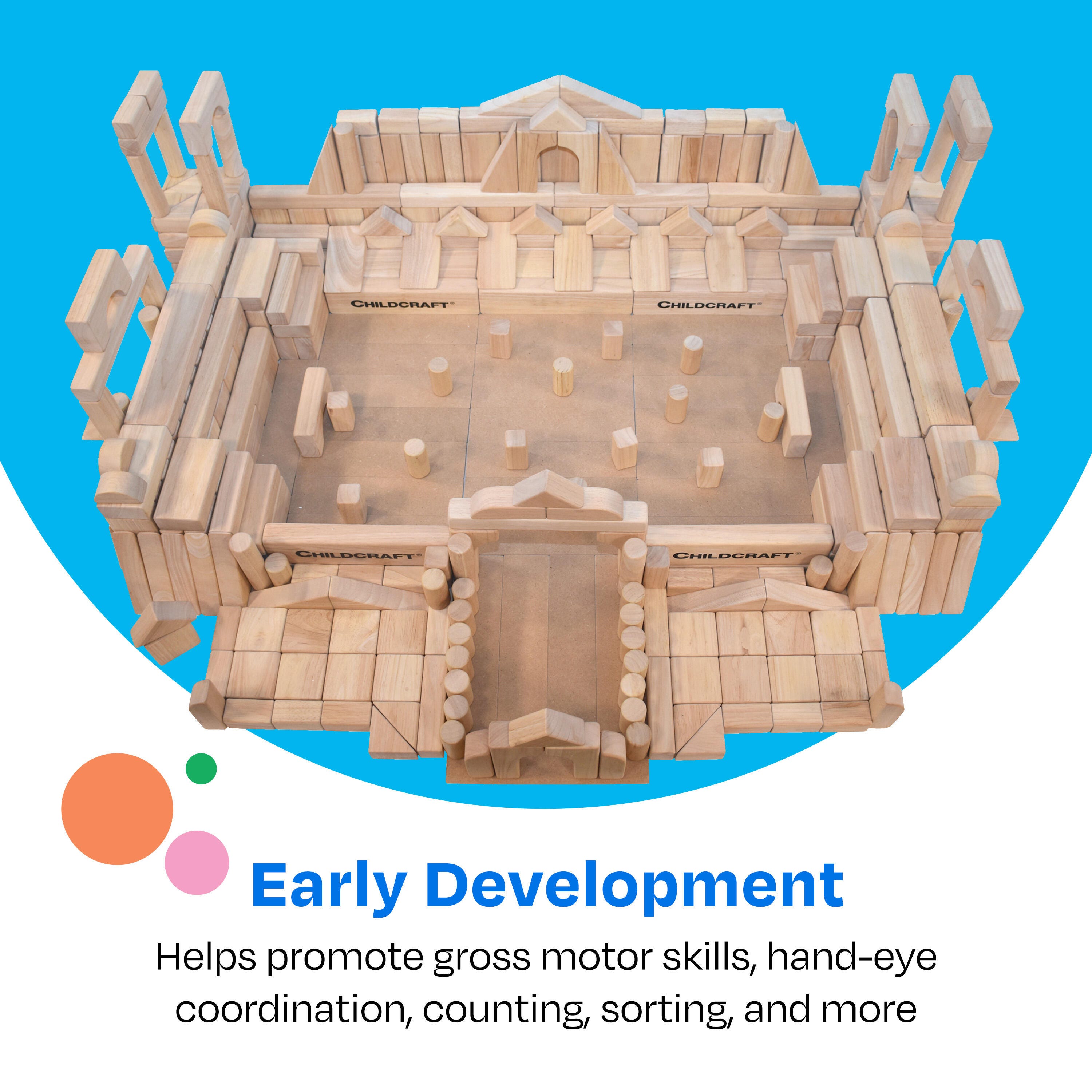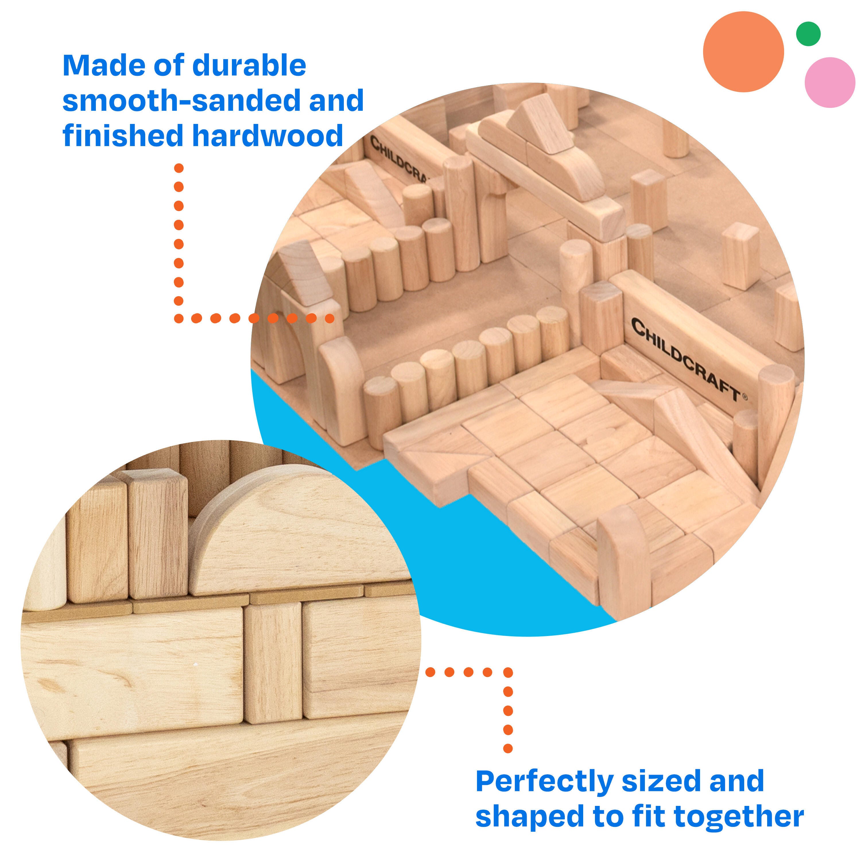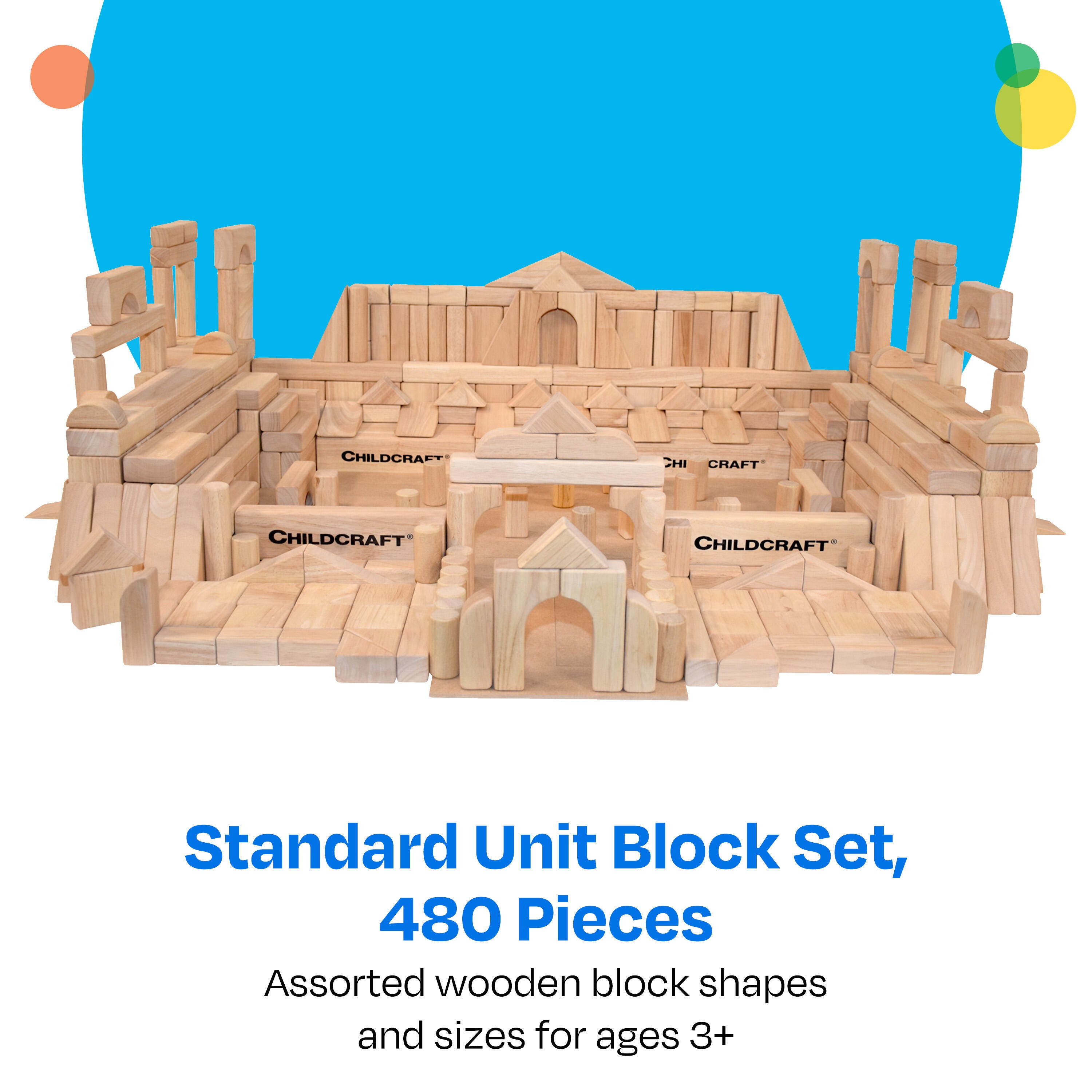 Childcraft® Standard Unit Blocks are an essential tool for early learning and play. Designed for ages 3 and up, this wooden block set includes 480 smooth-sanded, natural hardwood blocks in a variety of shapes and sizes. These durable blocks are perfect for open-ended, screen-free play to help children develop creativity, gross motor skills, and hand-eye coordination. They’re also great for early math concepts like shapes, counting, and parts-to-whole relationships. Backed by our limited guarantee, these wooden play blocks are built to last through years of learning and fun.