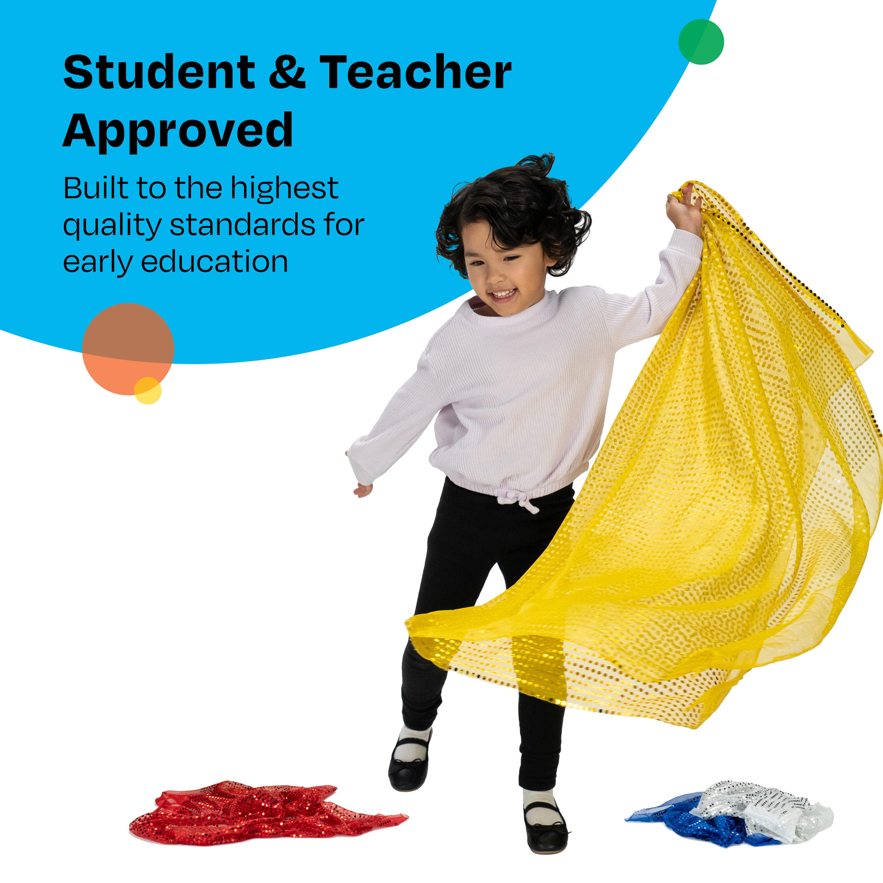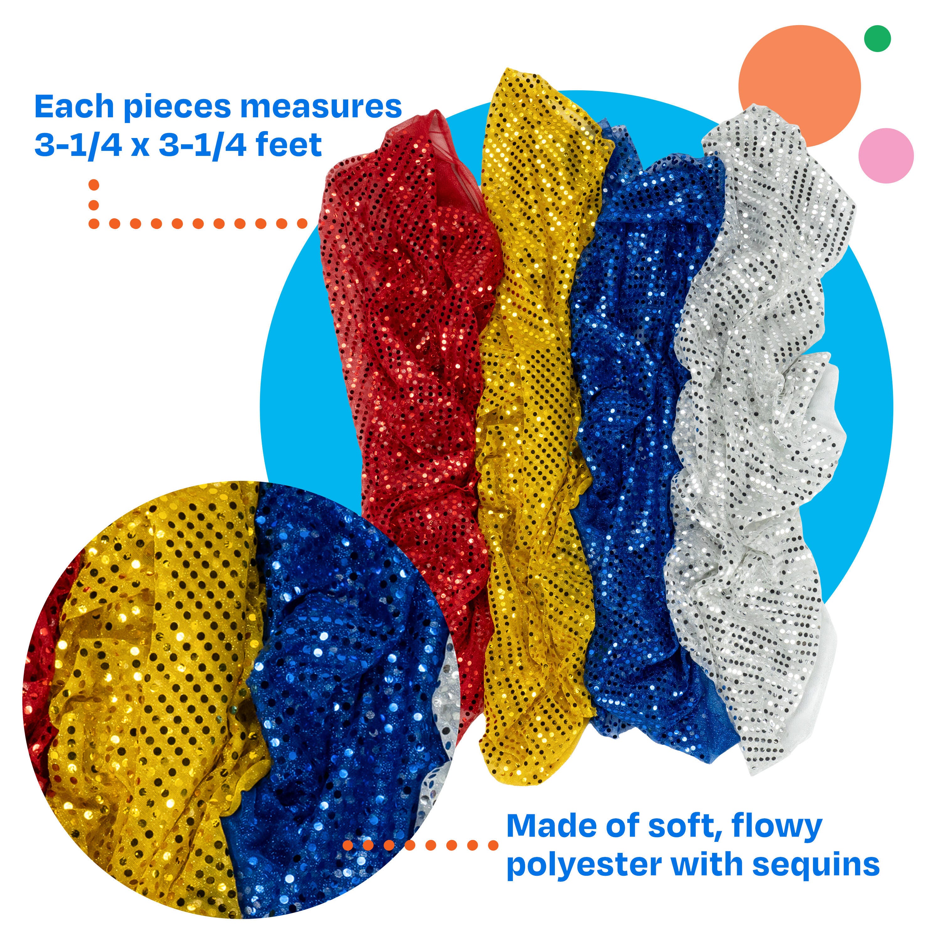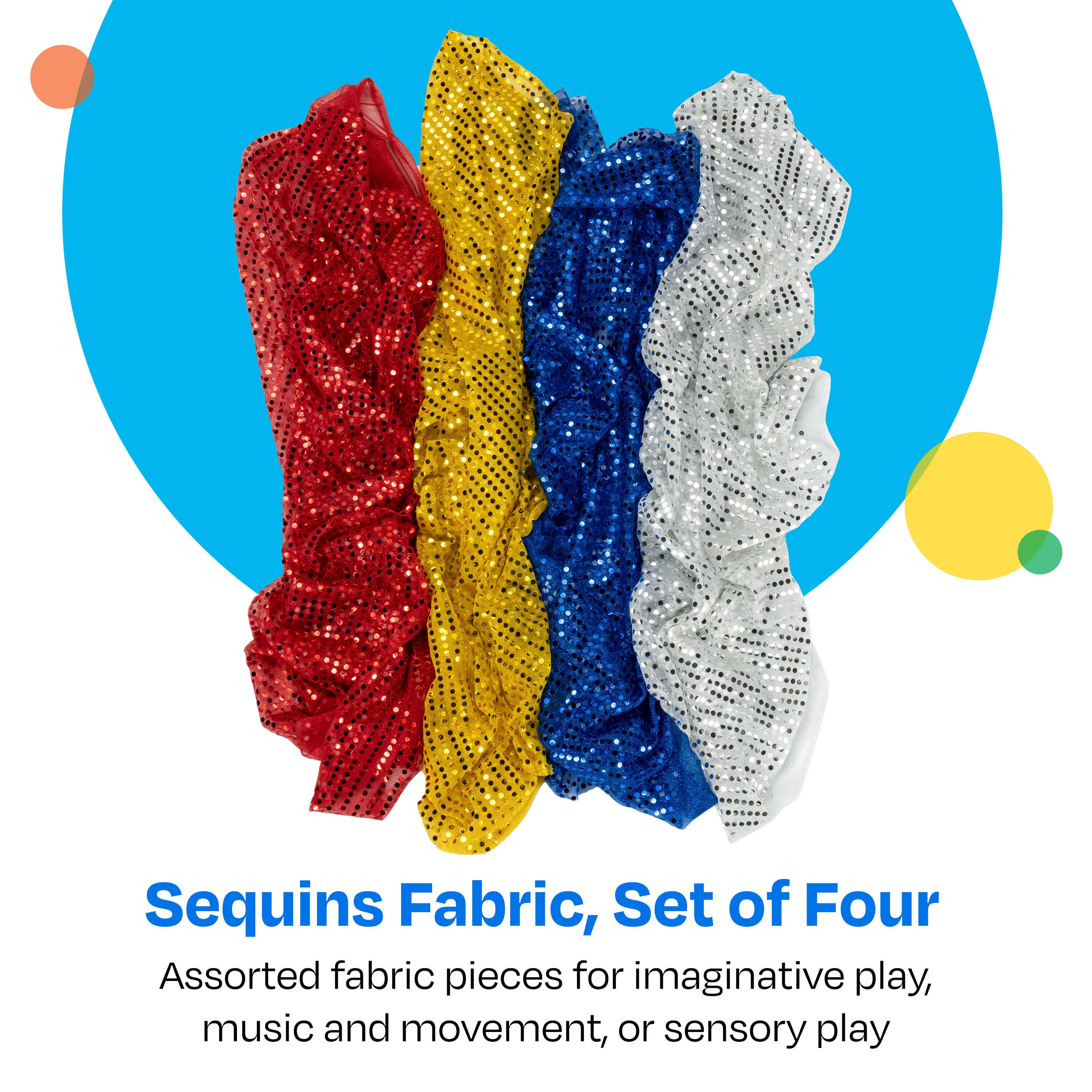 Childcraft® Sequins Fabric set is a versatile sensory tool that adds sparkle and encourages imaginative play, movement, and creative expression. This lightweight, soft, and sparkly fabric comes in the four colors, making it perfect for dramatic play, music and movement activities, quiet spaces, and textural exploration. Whether the play fabric is used for dress-up, storytelling, or as a classroom decor accent, these colorful pieces enhance visual and tactile stimulation for young learners. Colors may vary. Each piece measures 3-3/4 x 3-3/4 feet.