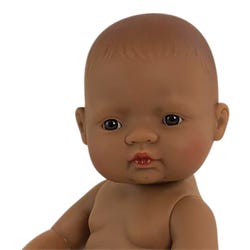 This anatomically correct baby doll by Miniland features detailed facial features, soft stitched-on faux hair, articulated arms, legs, and a neck, making it easy to switch apparel pieces on or off. Each soft, flexible vinyl doll is lightly vanilla-scented and can be washed and bathed! It comes with an undershirt and underpants, additional clothing is sold separately. This doll stands 12 and 5/8 inches high.Features